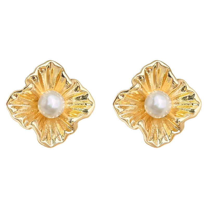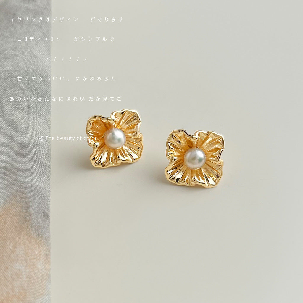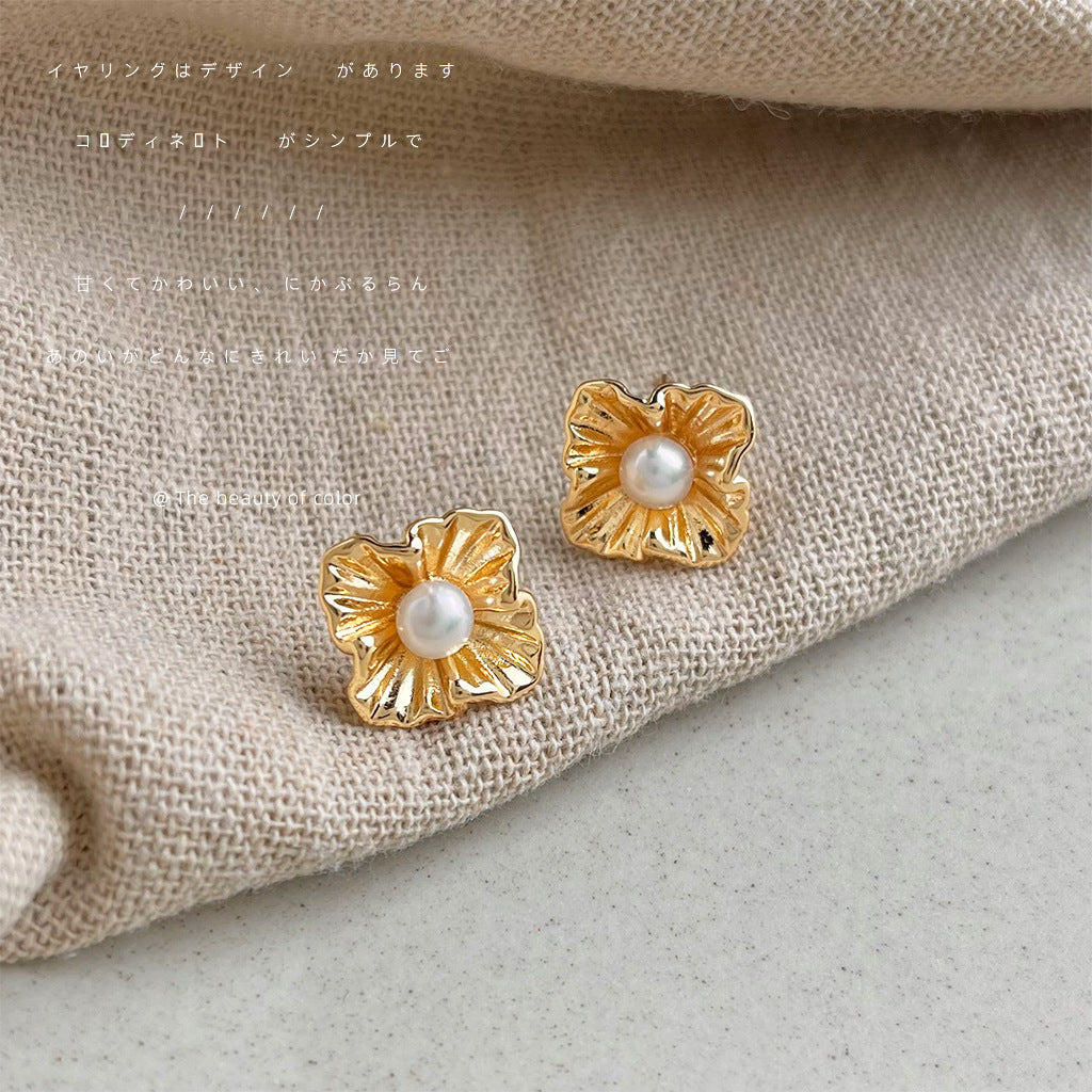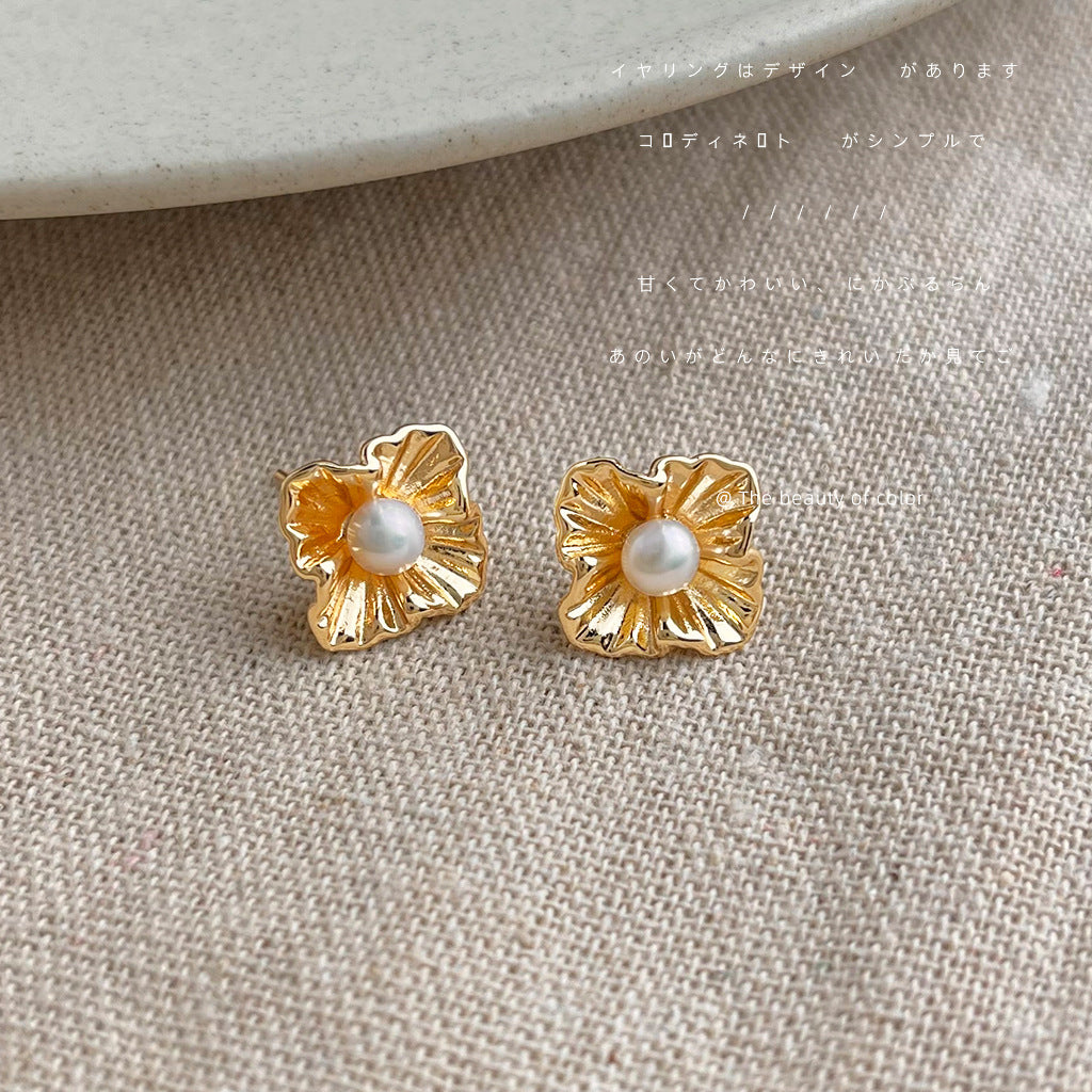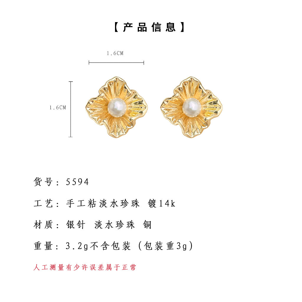 C廠【5594】淡水珍珠紋理感925銀針鍍14K時尚高級感花朵耳環氣質優雅耳飾 25.02-4
