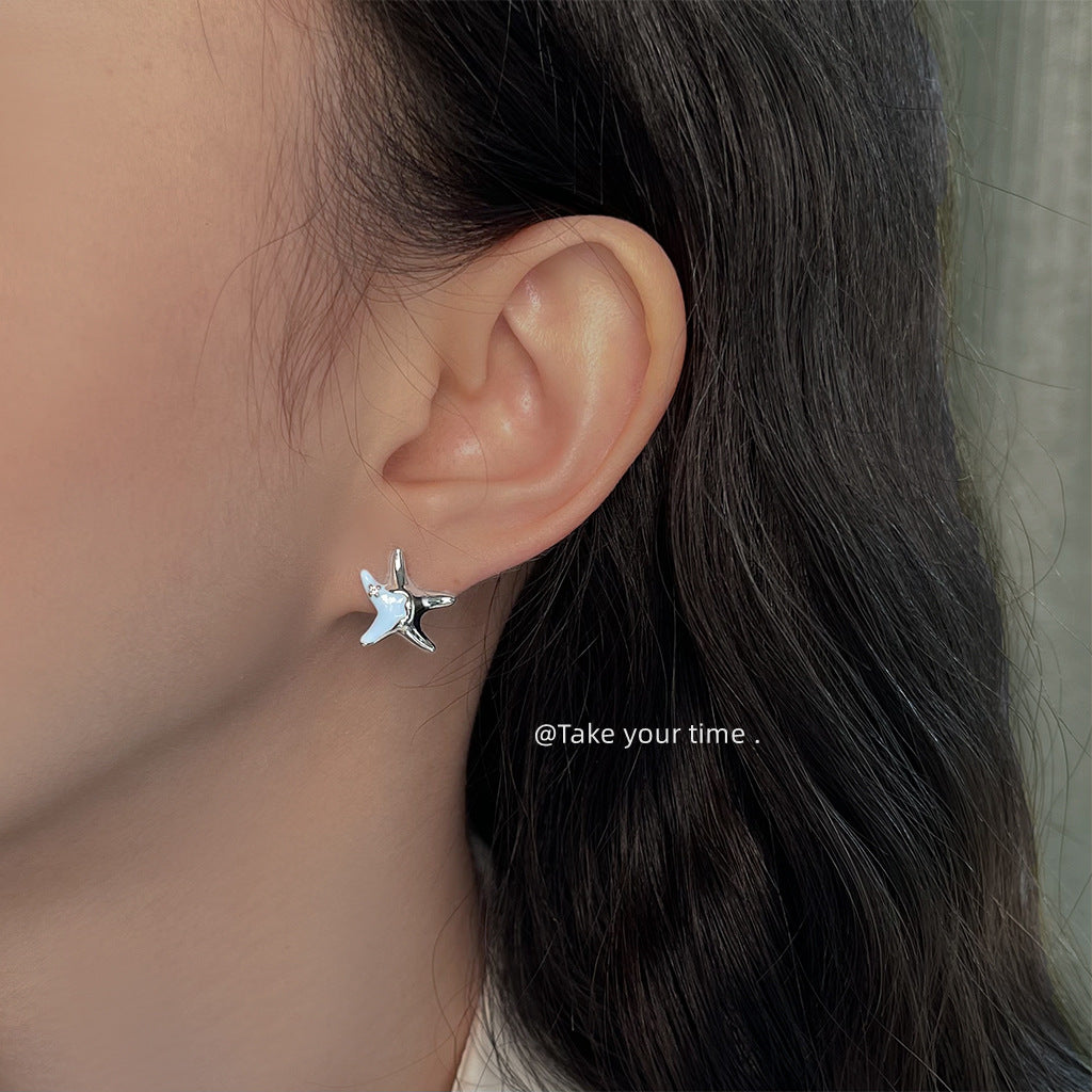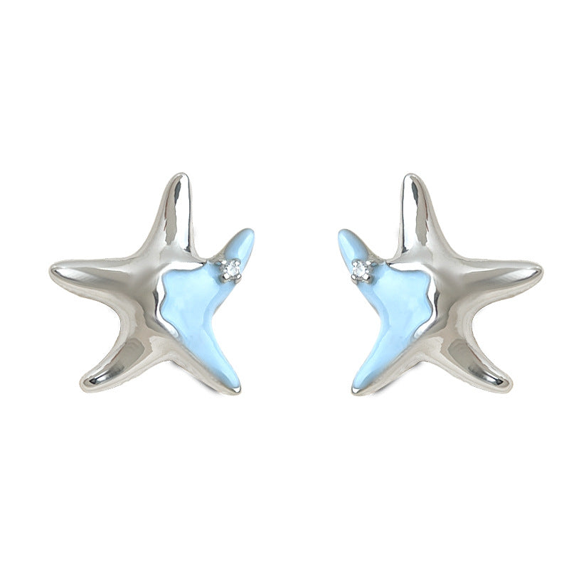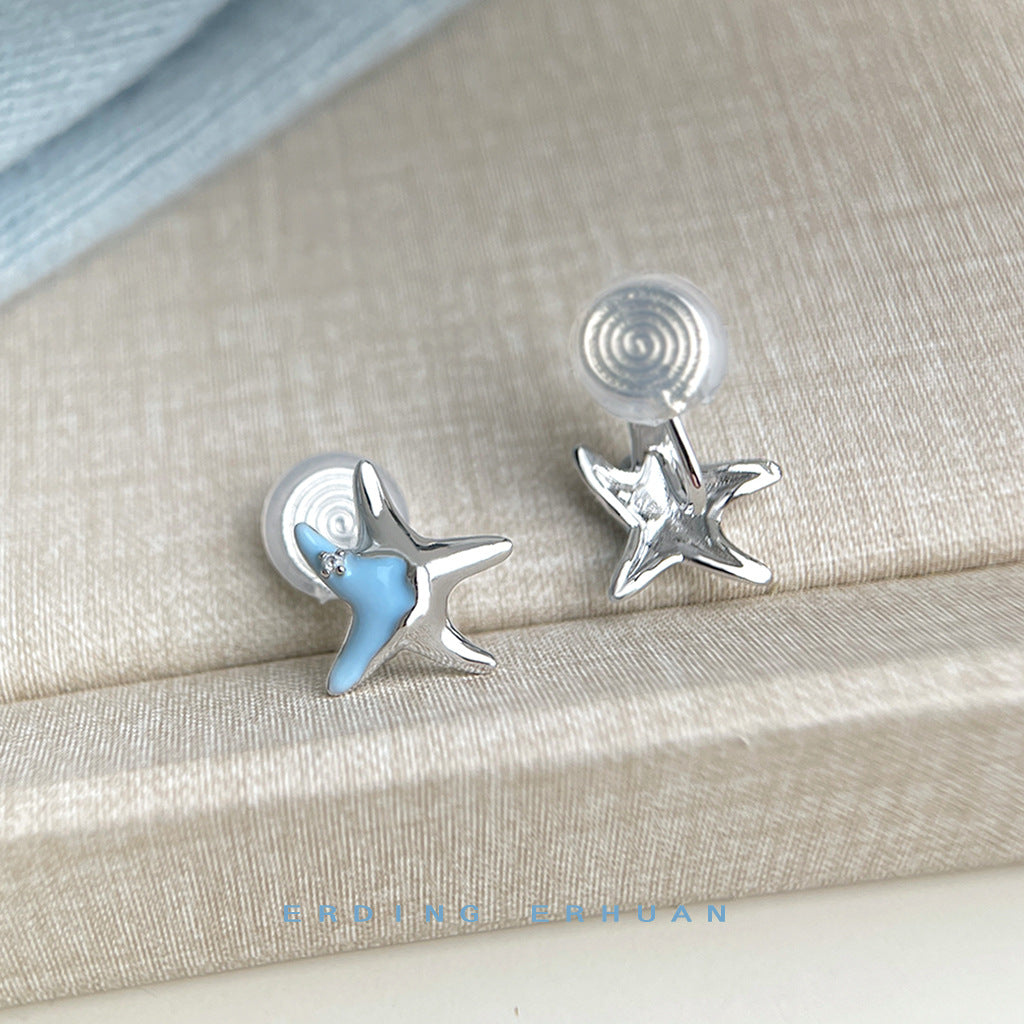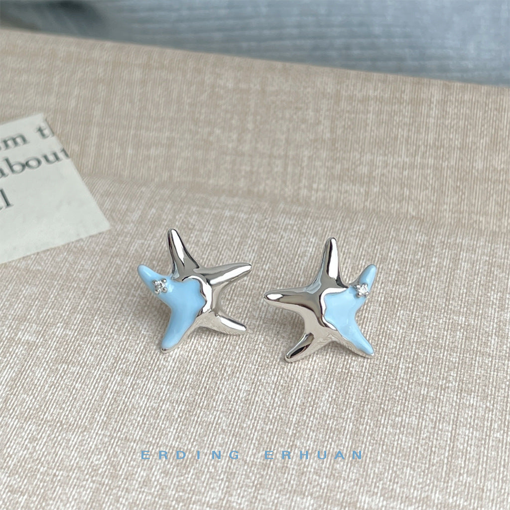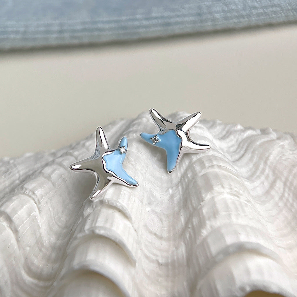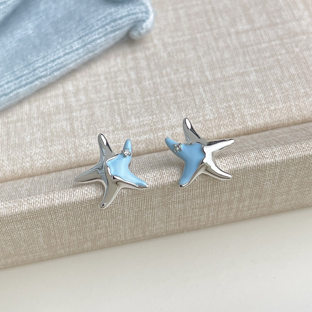 C廠【6076】海洋系~設計師款甜酷琺瑯滴釉清新甜美藍色小海星925銀針耳環耳飾 25.05-4