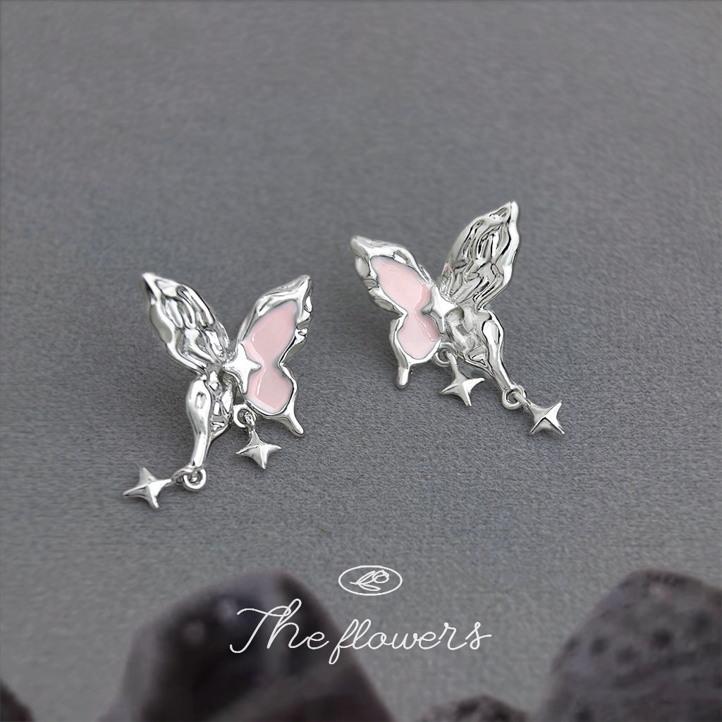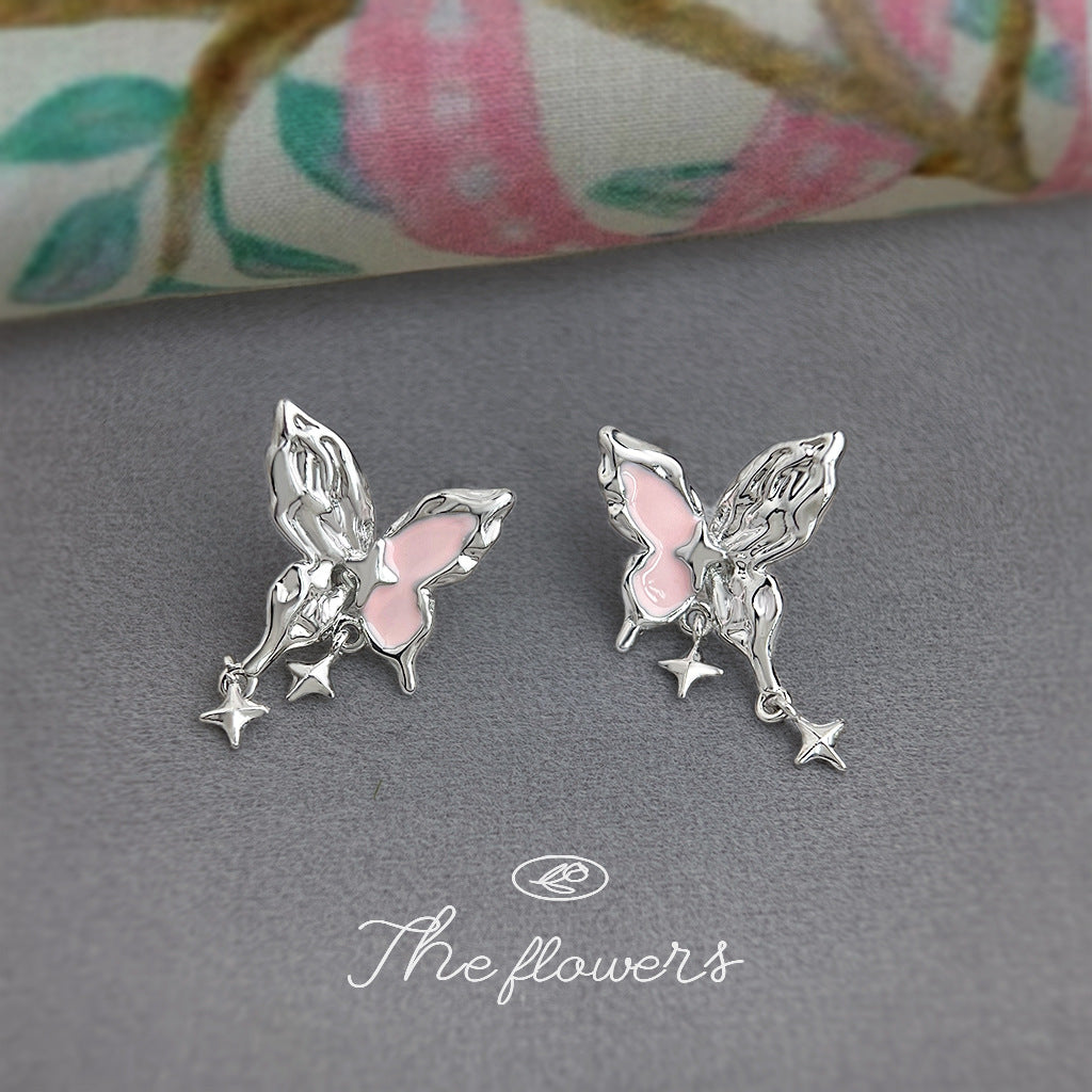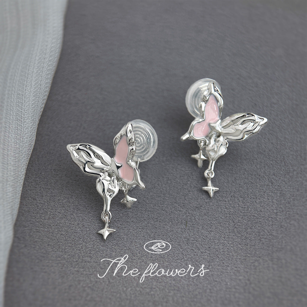 A廠【6345】甜酷女孩! 925銀針粉紅琺瑯滴油液態肌理紋芒星蝴蝶新款耳飾耳環 25.11-4