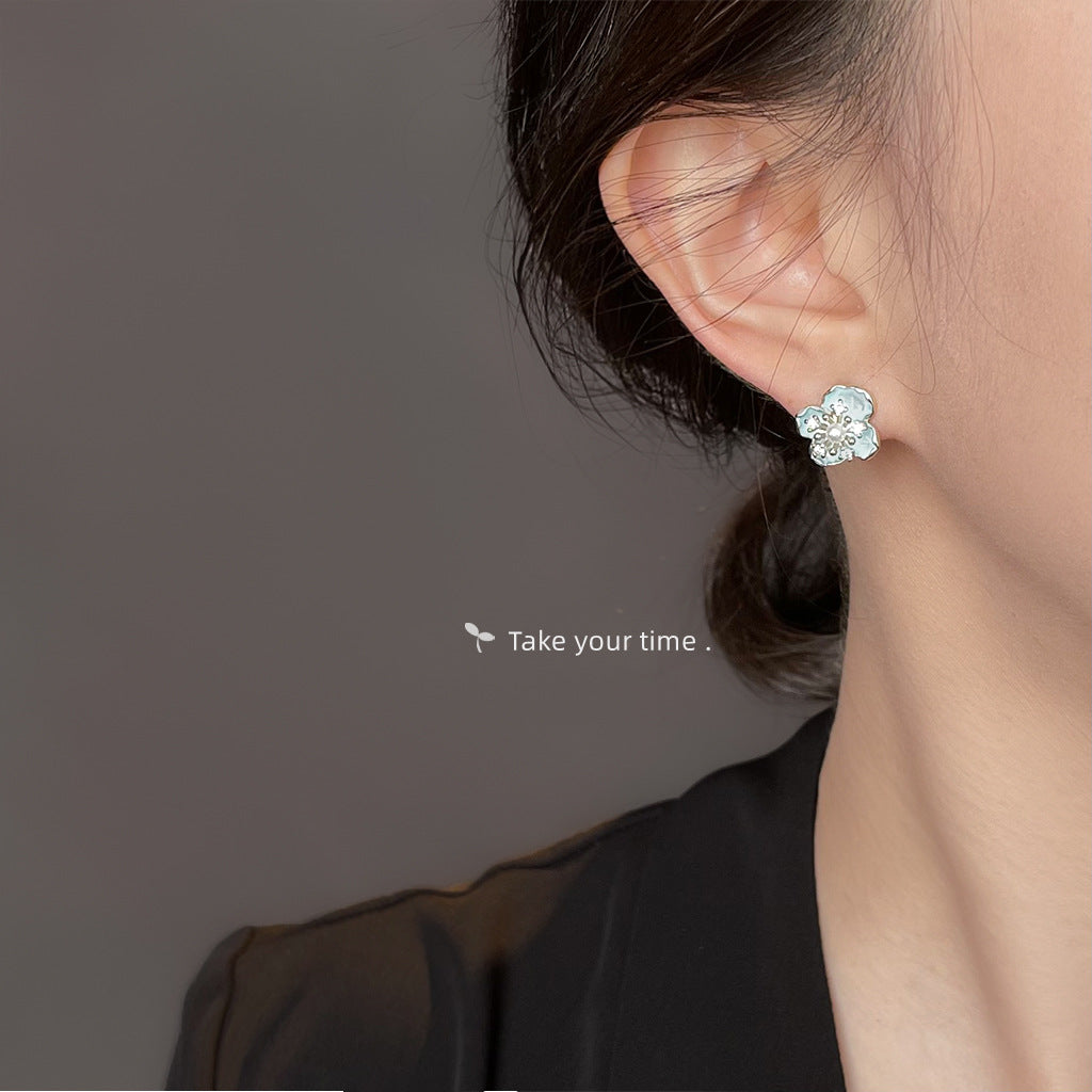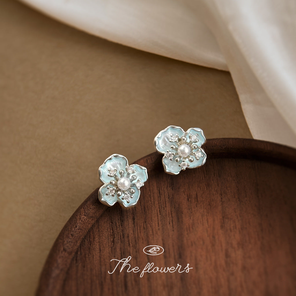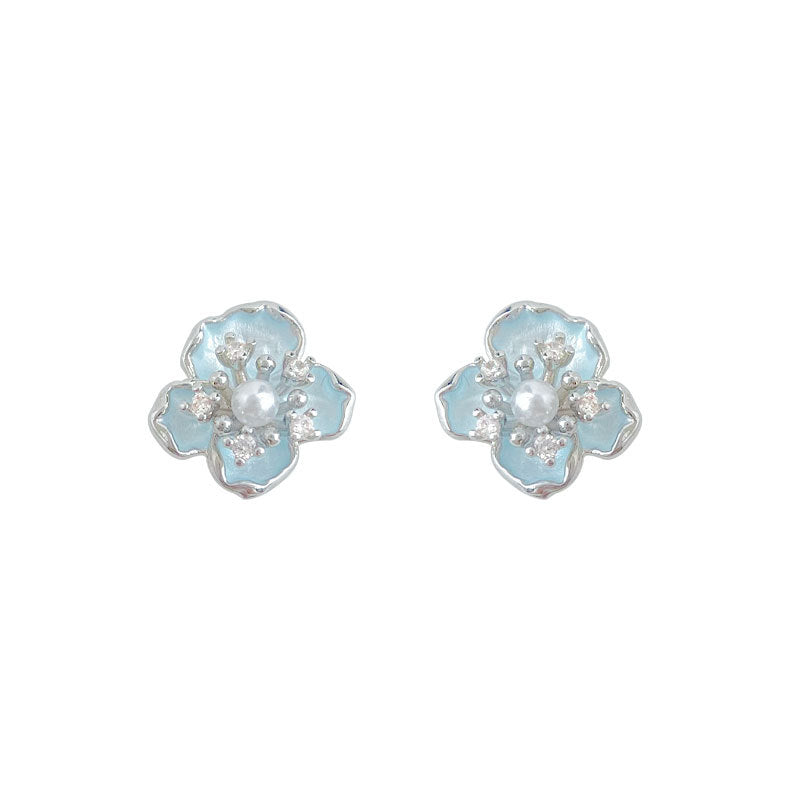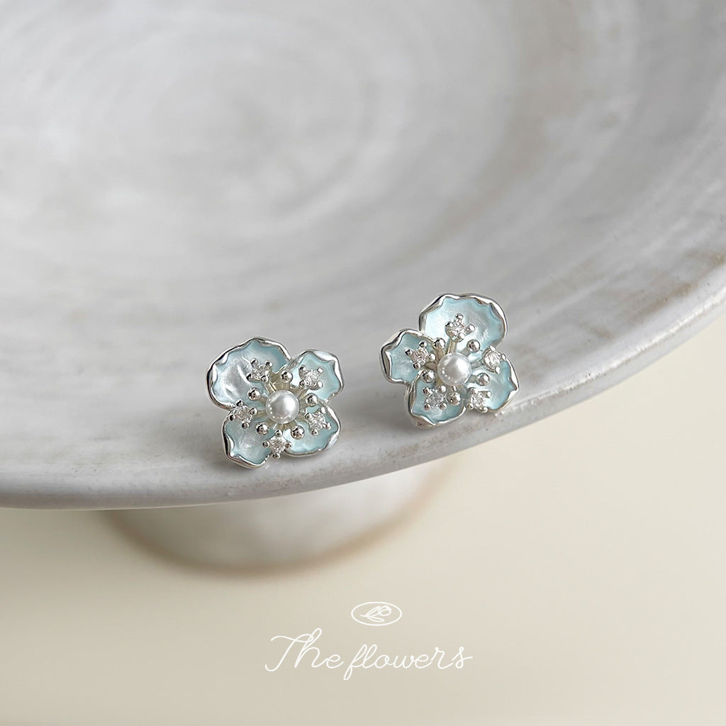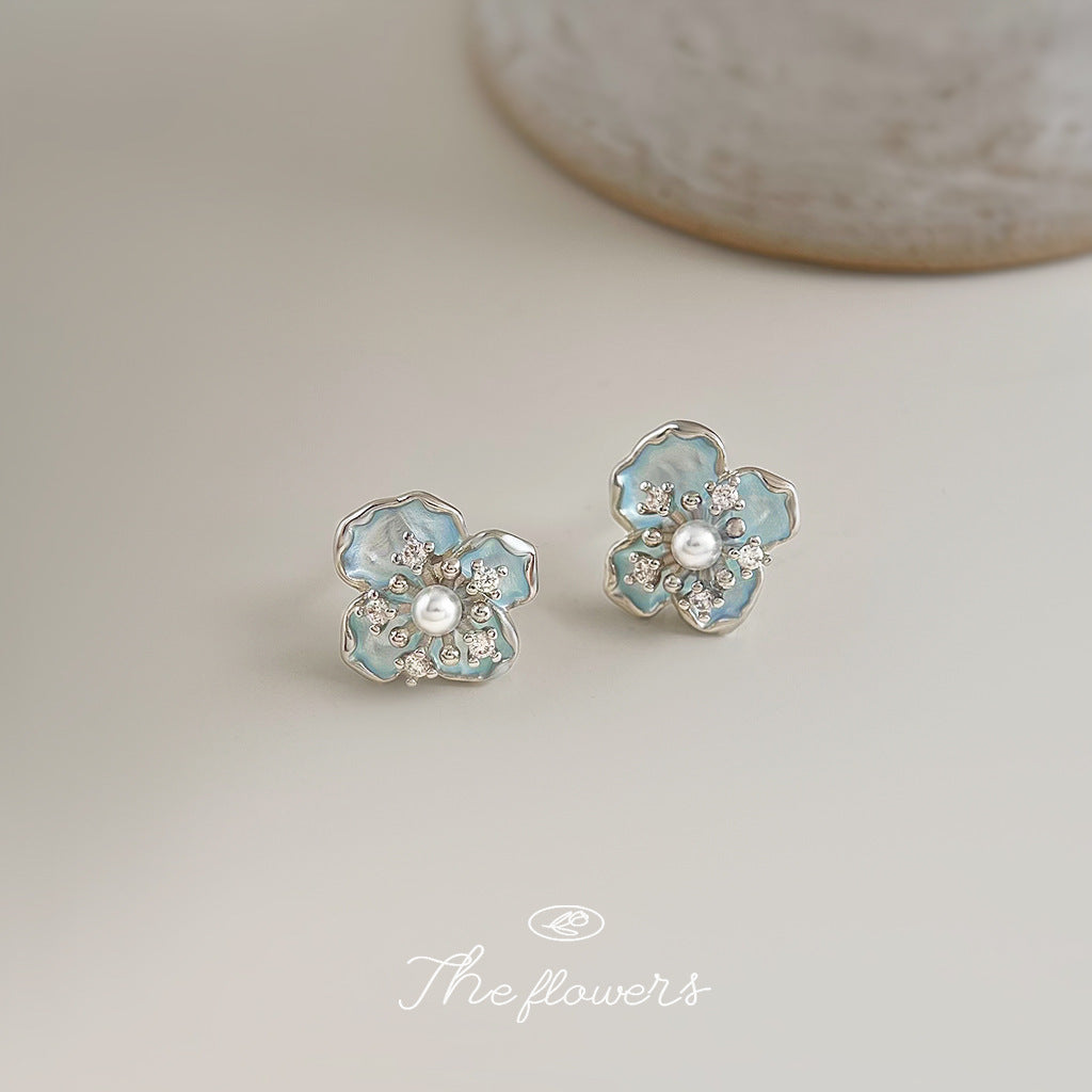 C廠【6414】森系清新甜美簡約小巧立體花朵925銀針手工彩繪藍色耳環 鋯石耳飾 25.07-2