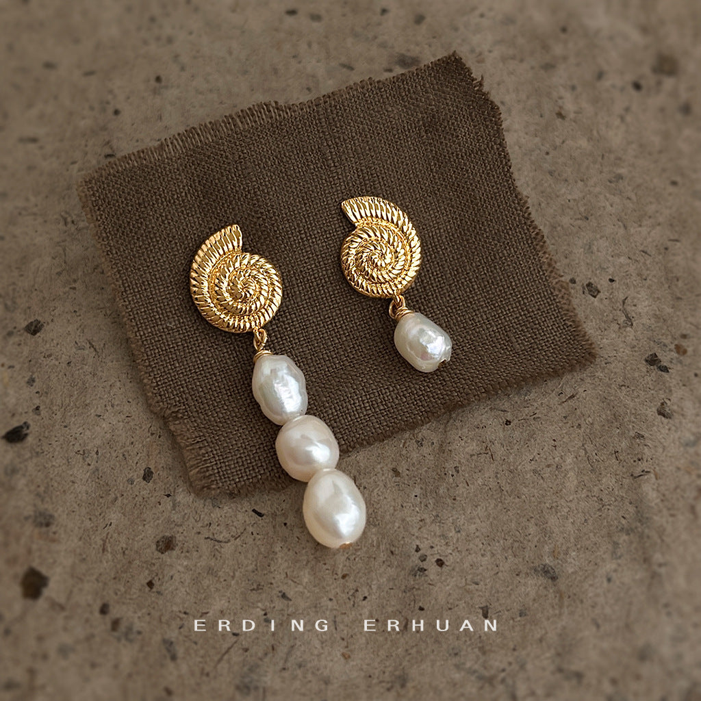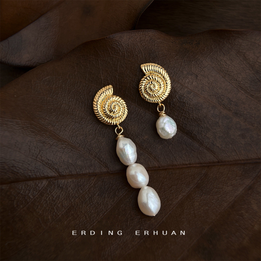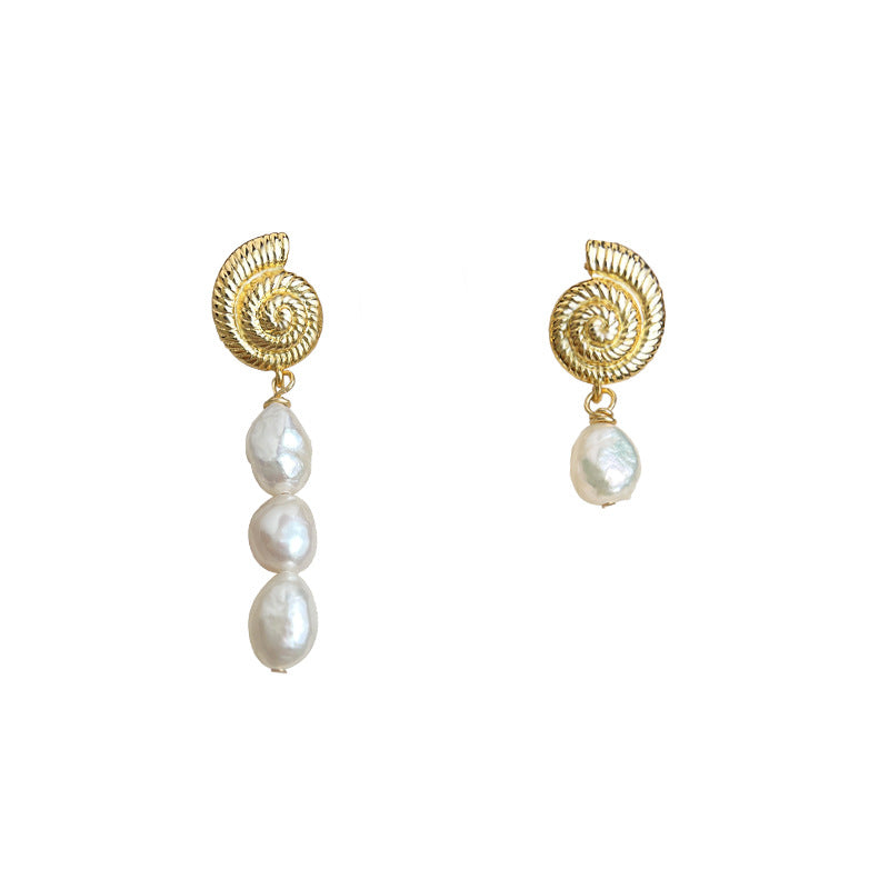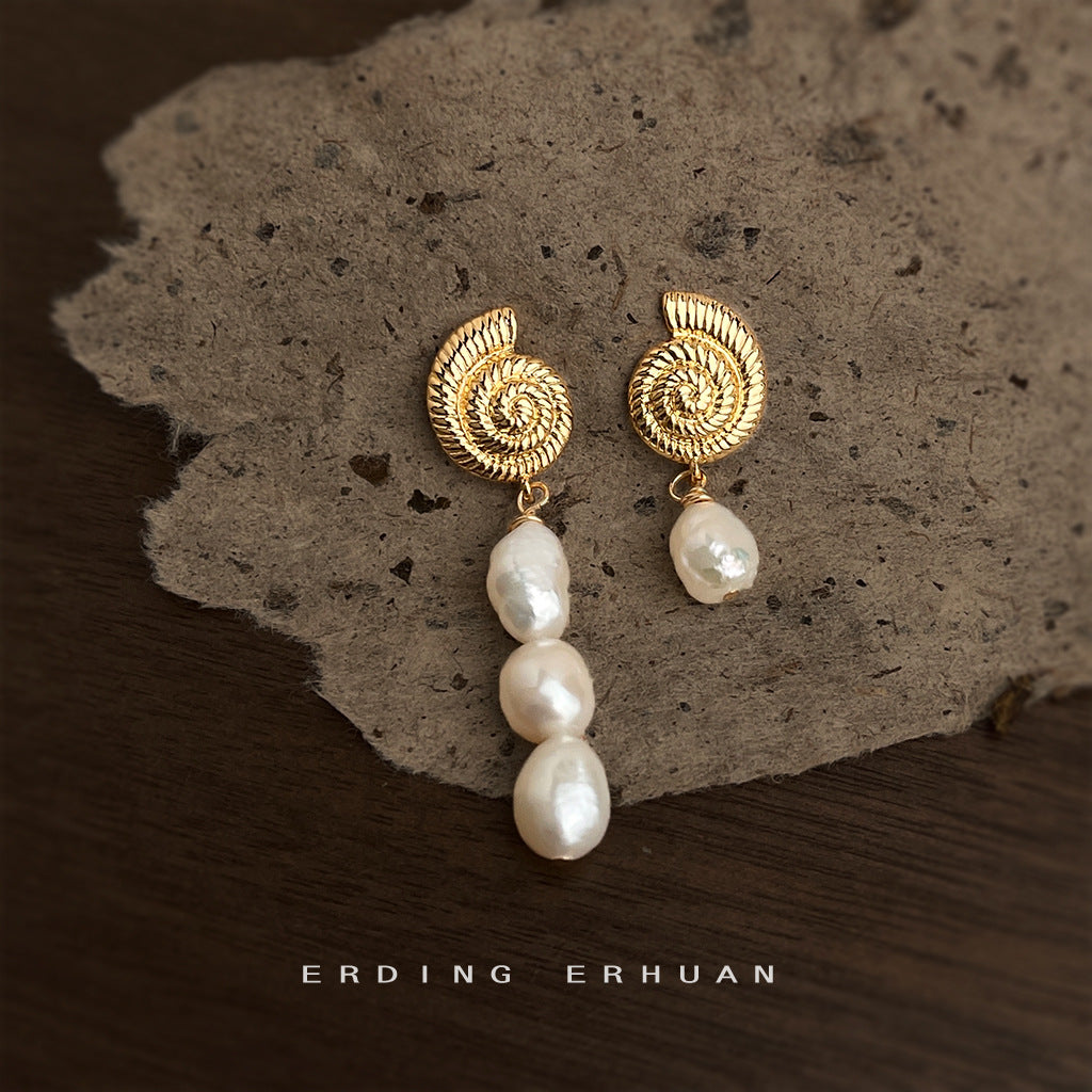 C廠【6493】巴洛克異形不規則天然淡水珍珠不對稱設計AB款海螺耳環耳環女 25.08-1