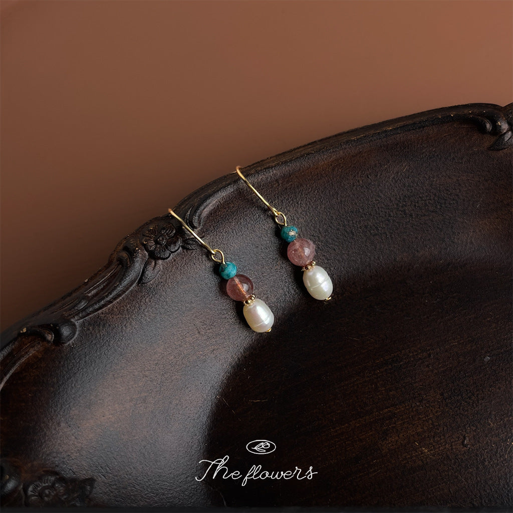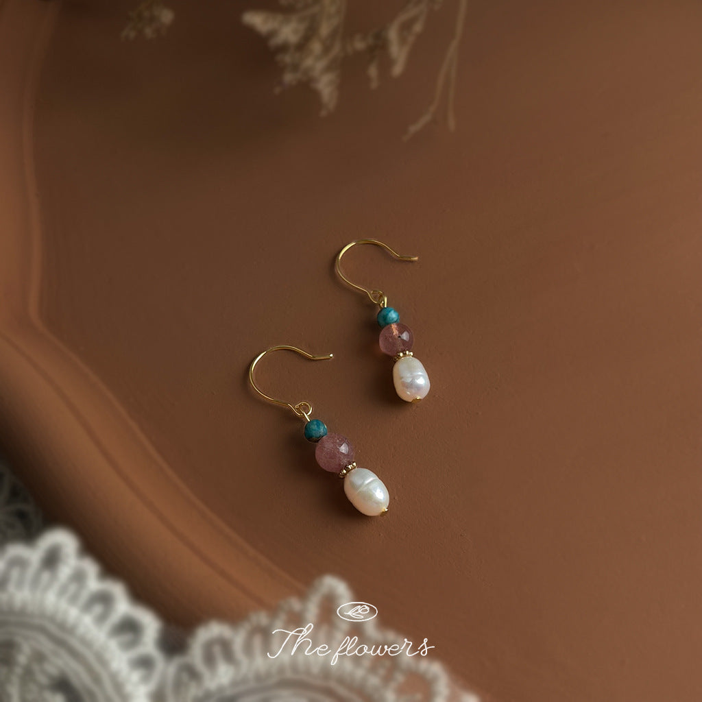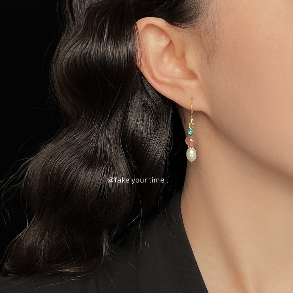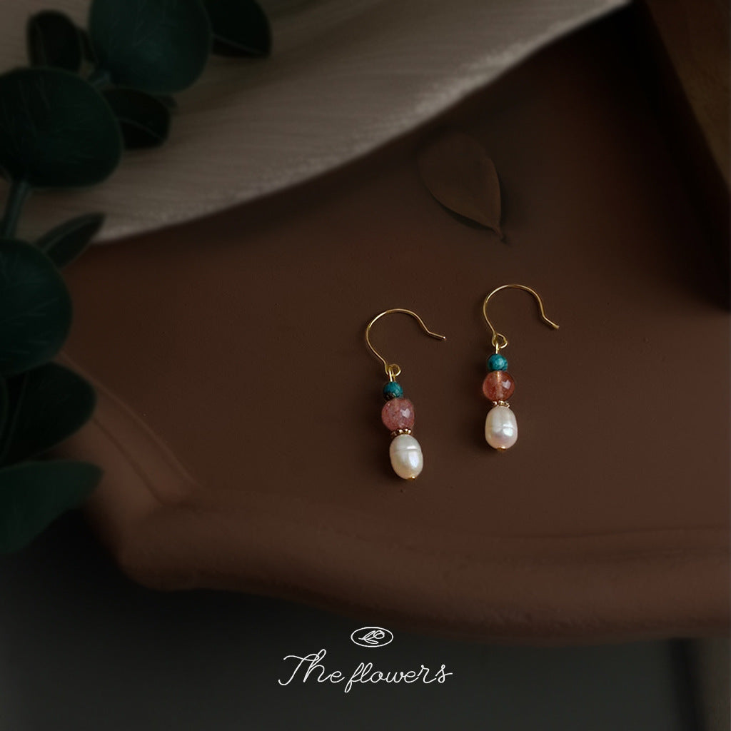 C廠【6523】天然淡水珍珠草莓晶天然石原創設計手工水滴耳環女輕奢風通勤耳環 25.08-2