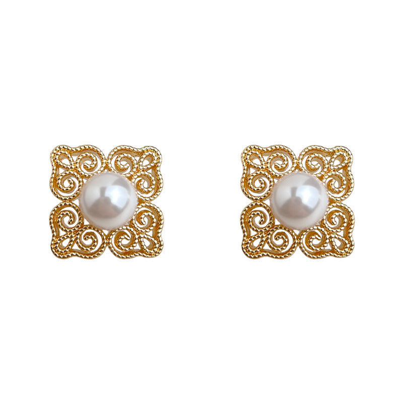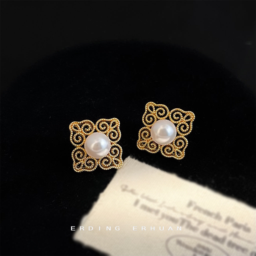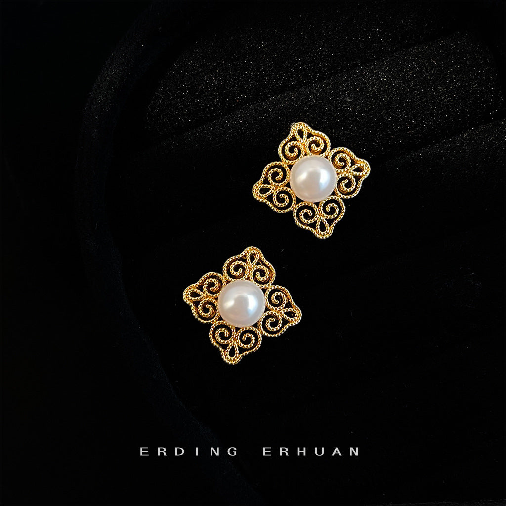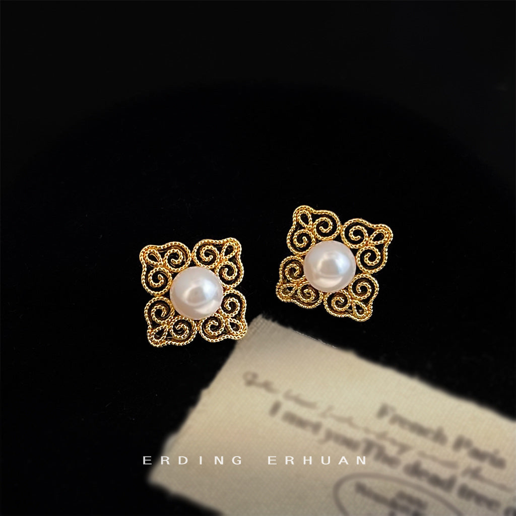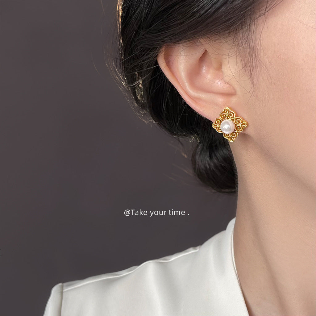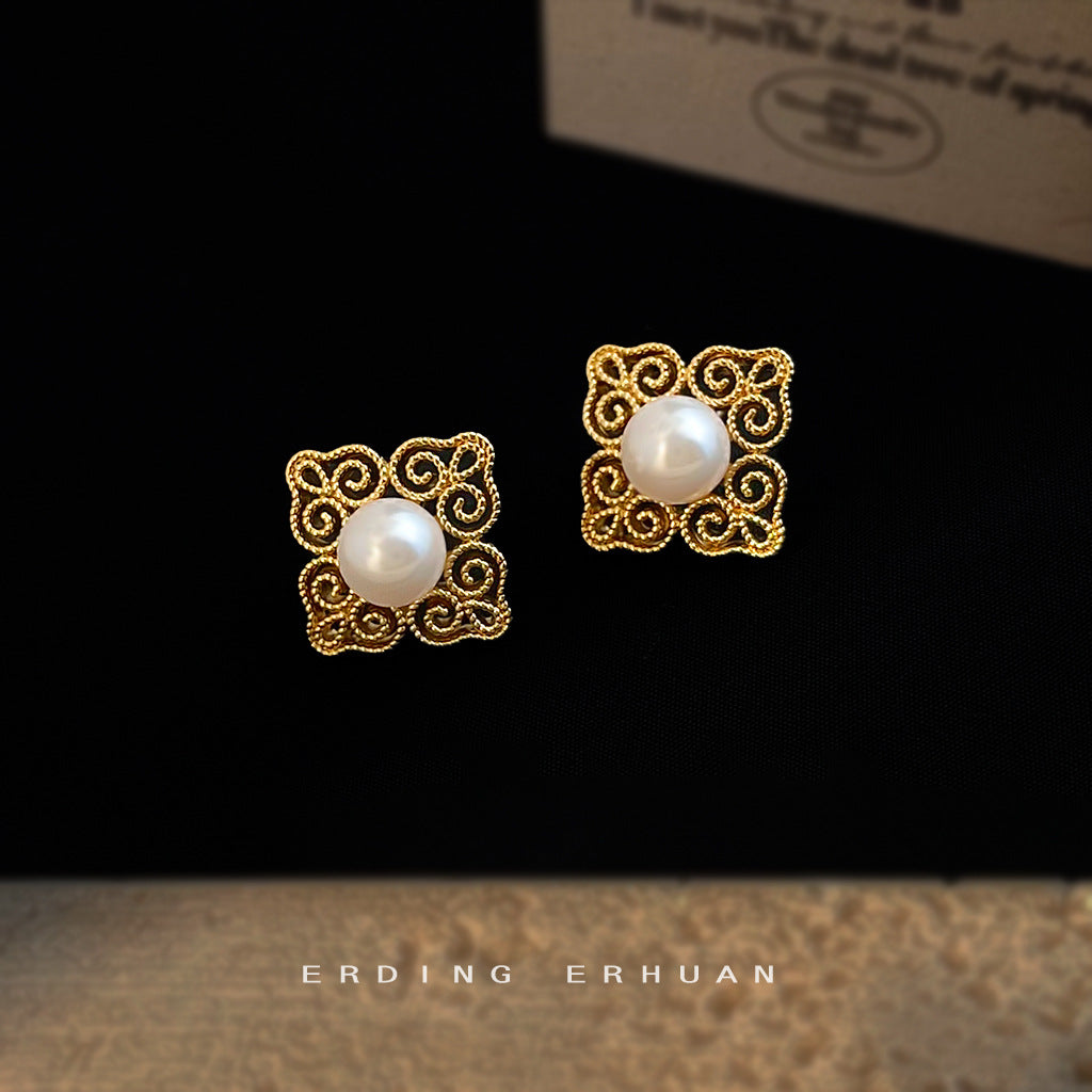 C廠【6556】文藝復古國潮925銀針玻璃珍珠電鍍14K紋樣幾何高級感耳飾耳環 25.08-3