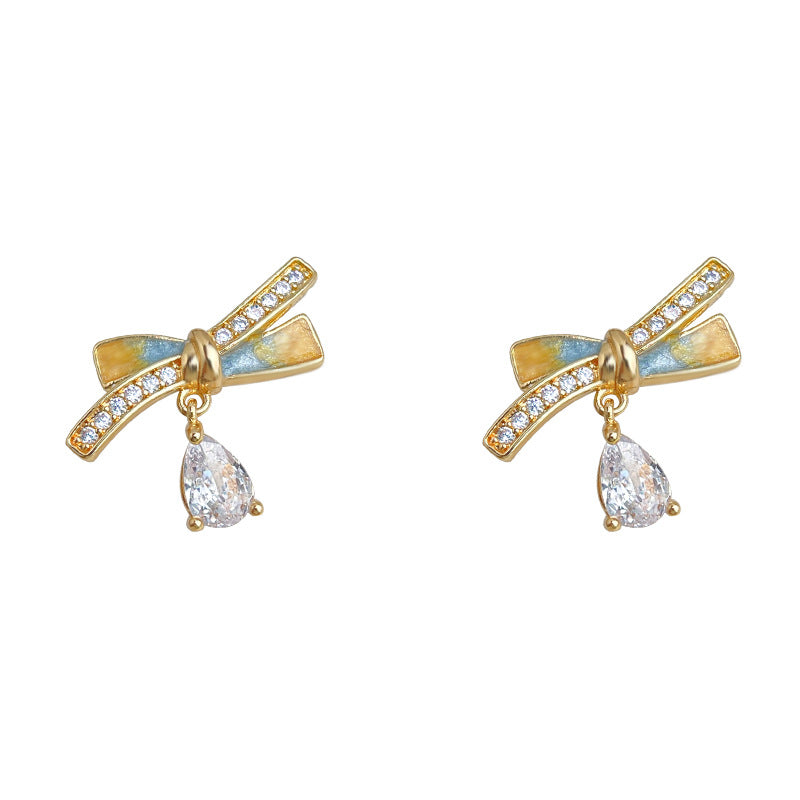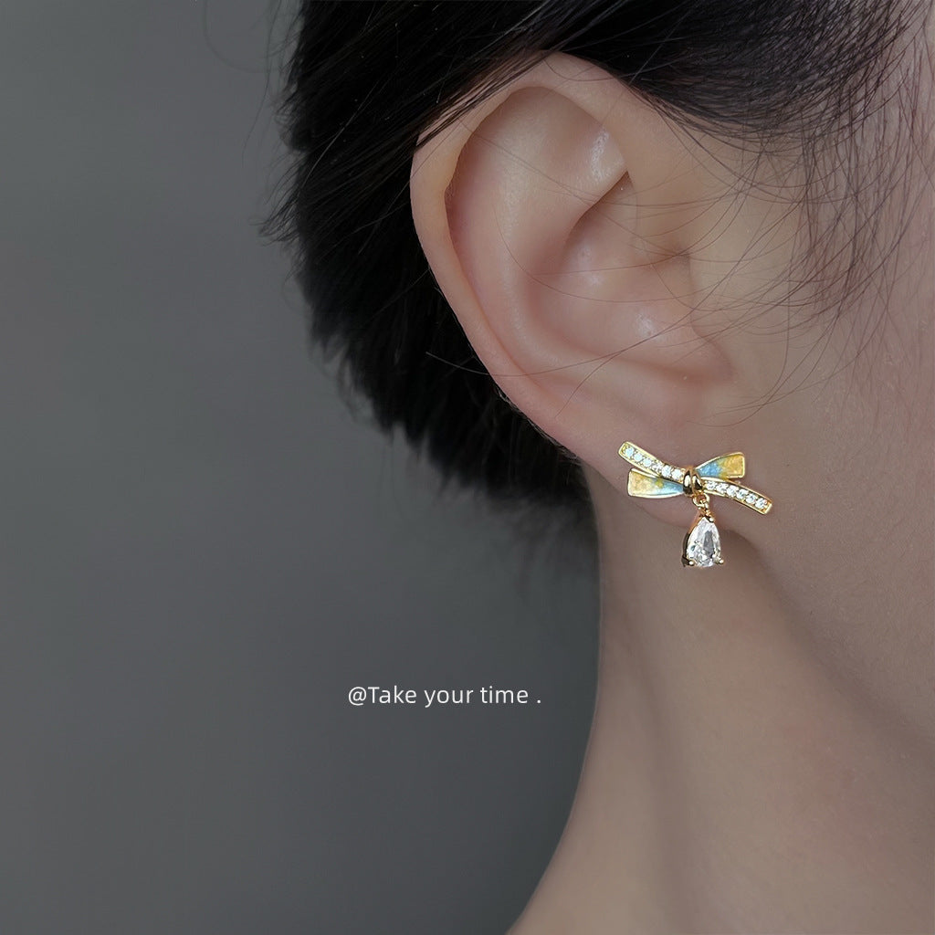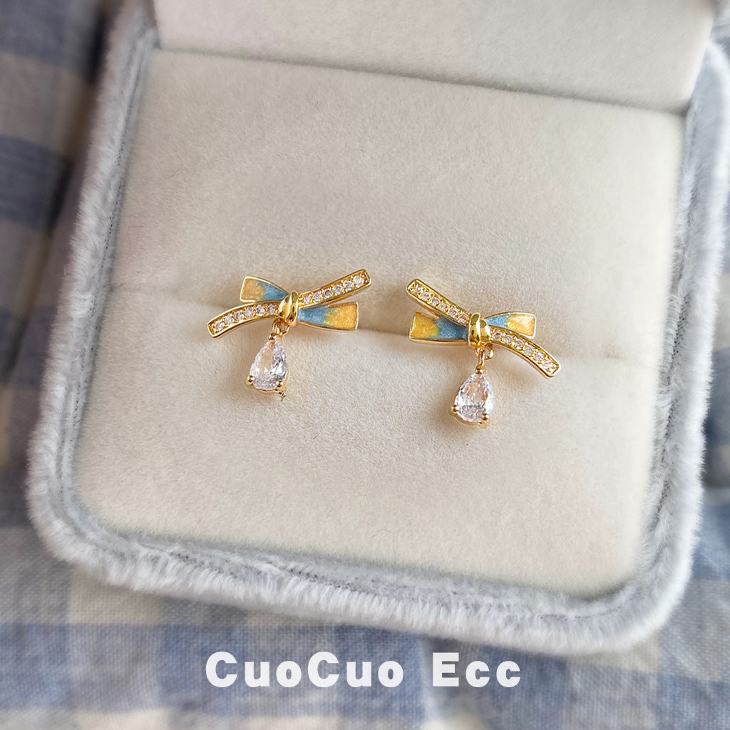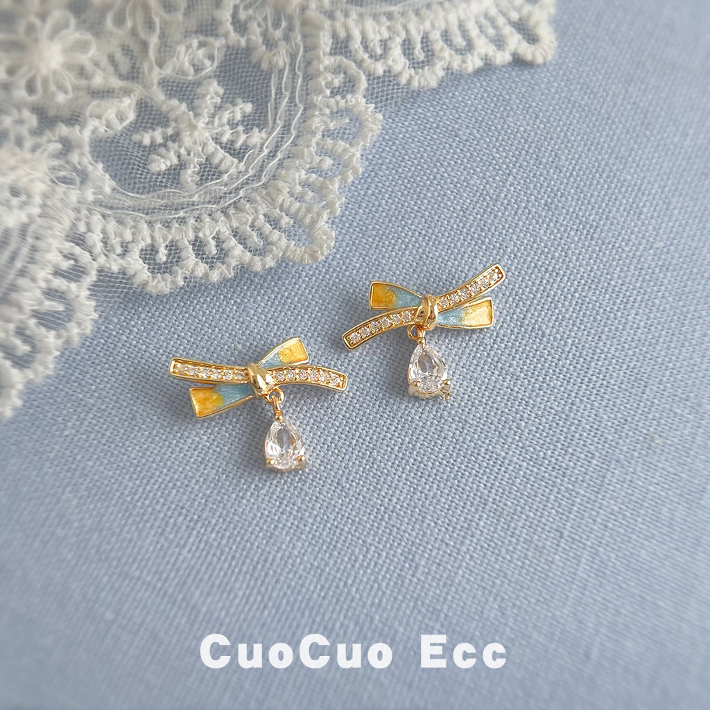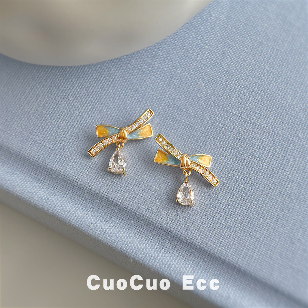 C廠【6721】清新甜美微鑲鋯石925銀針鍍14K彩繪琺瑯滴釉蝴蝶結耳環新款耳飾女 25.09-4