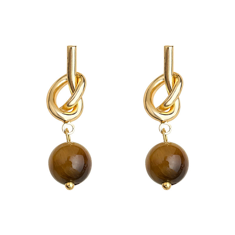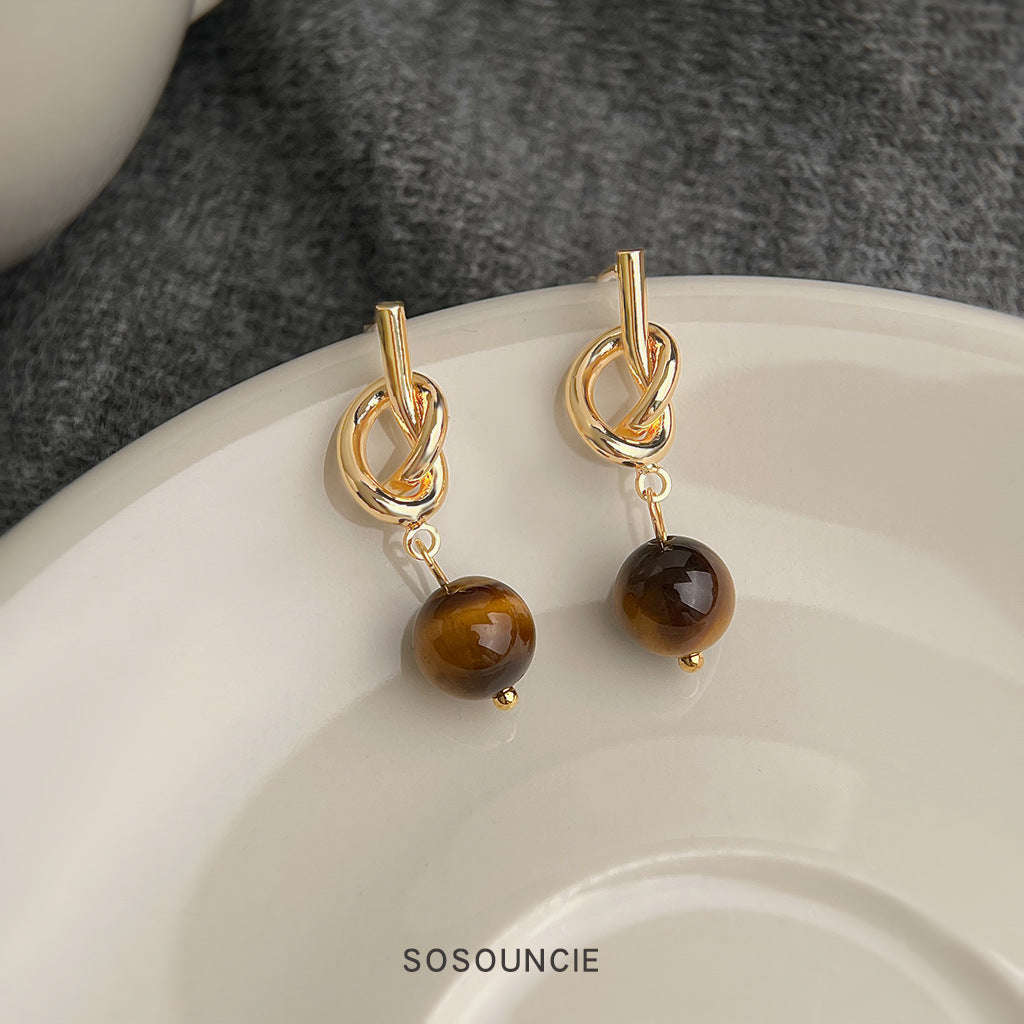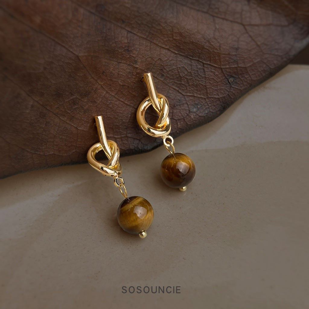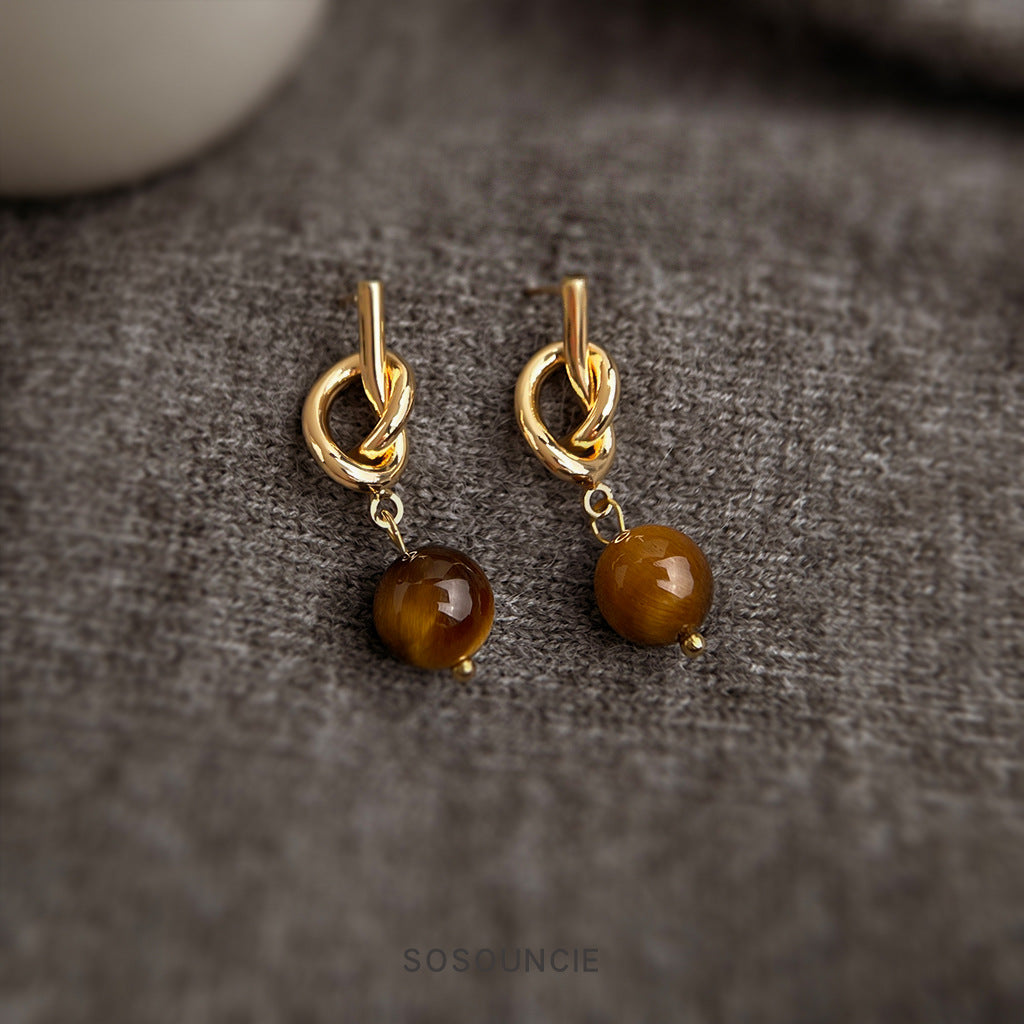 C廠【6810】天然石虎眼石美拉德風簡約法式中古風時尚高級感繩結耳飾耳環 25.09-4