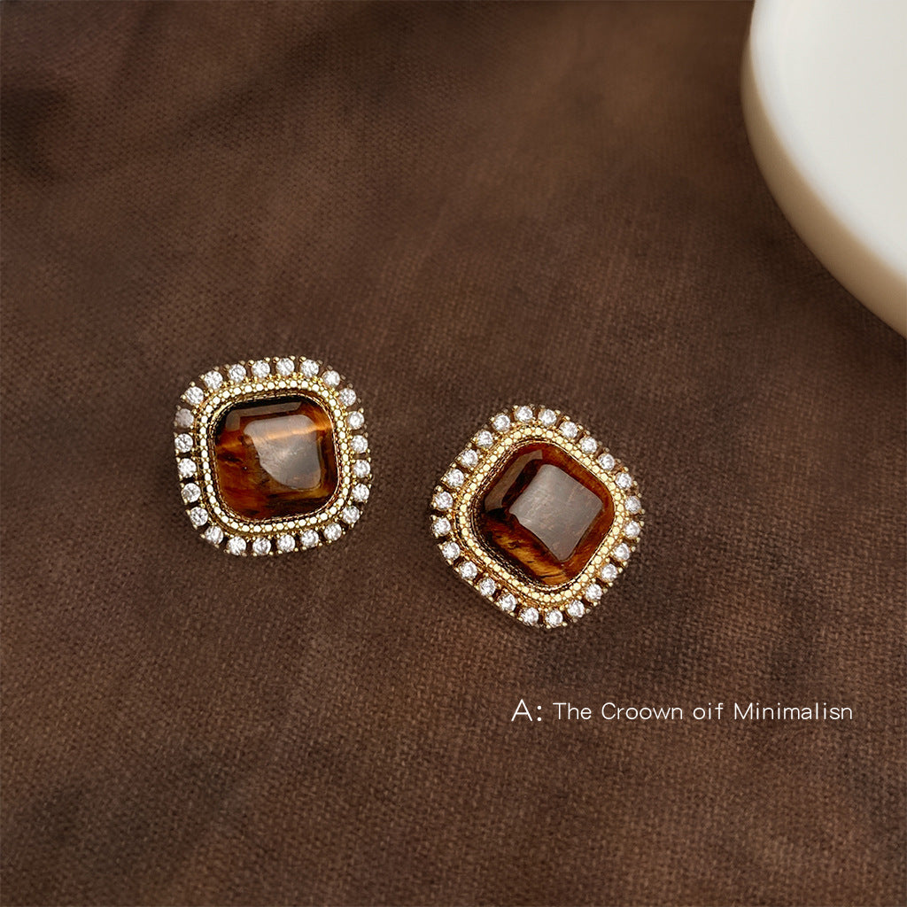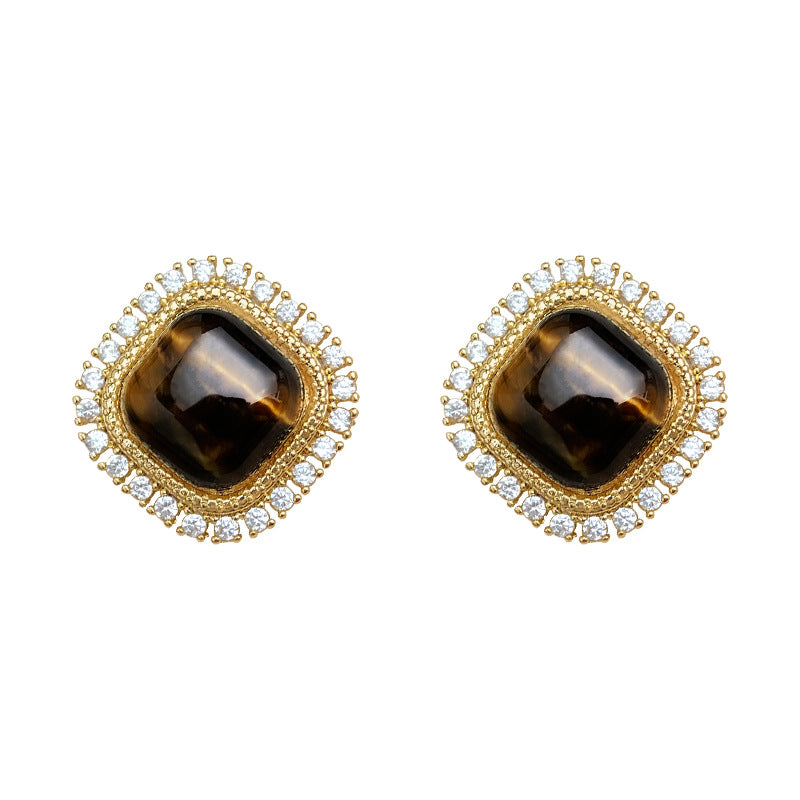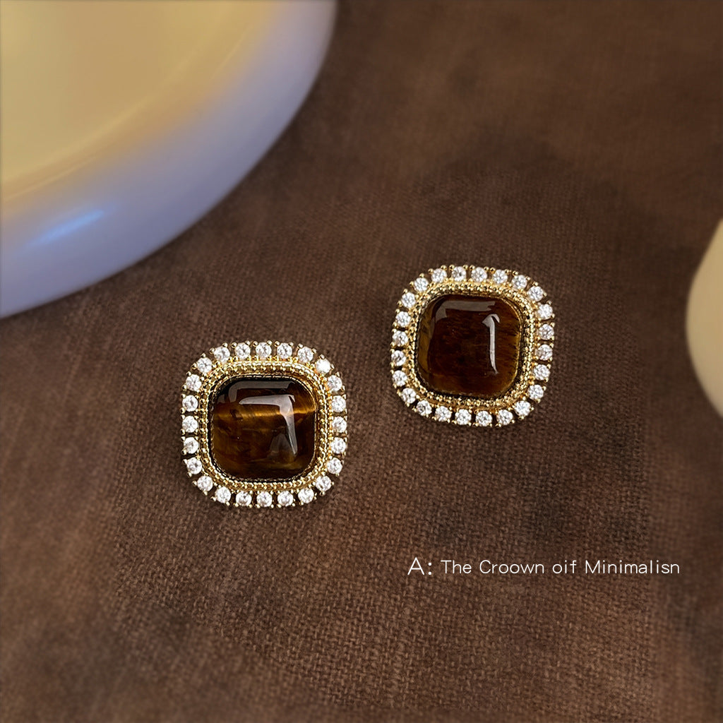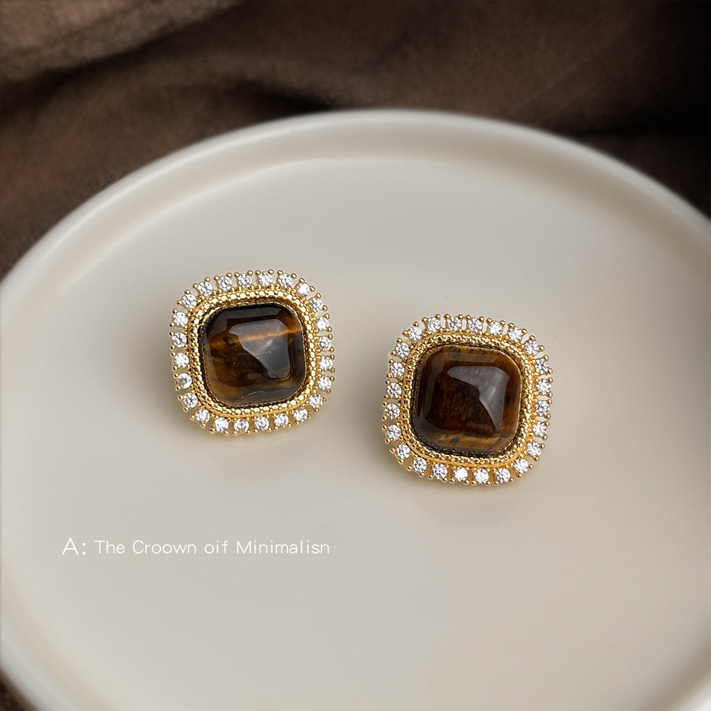 C廠【6850】文藝復古微鑲鋯石美拉德風鑲嵌虎眼石幾何方形高級感新款耳環耳環 25.09-4
