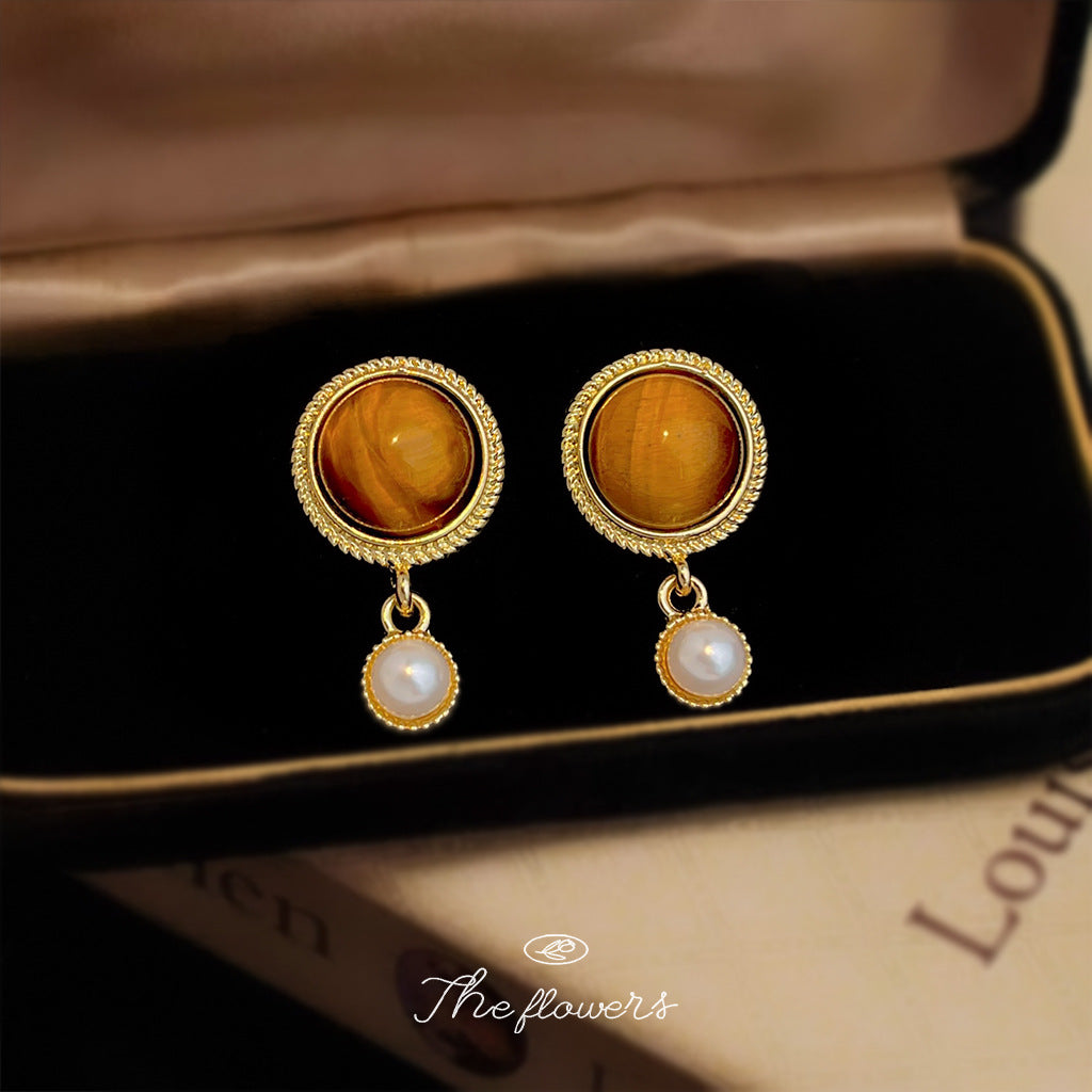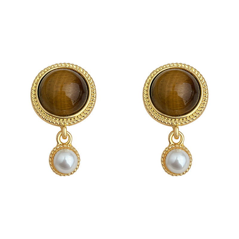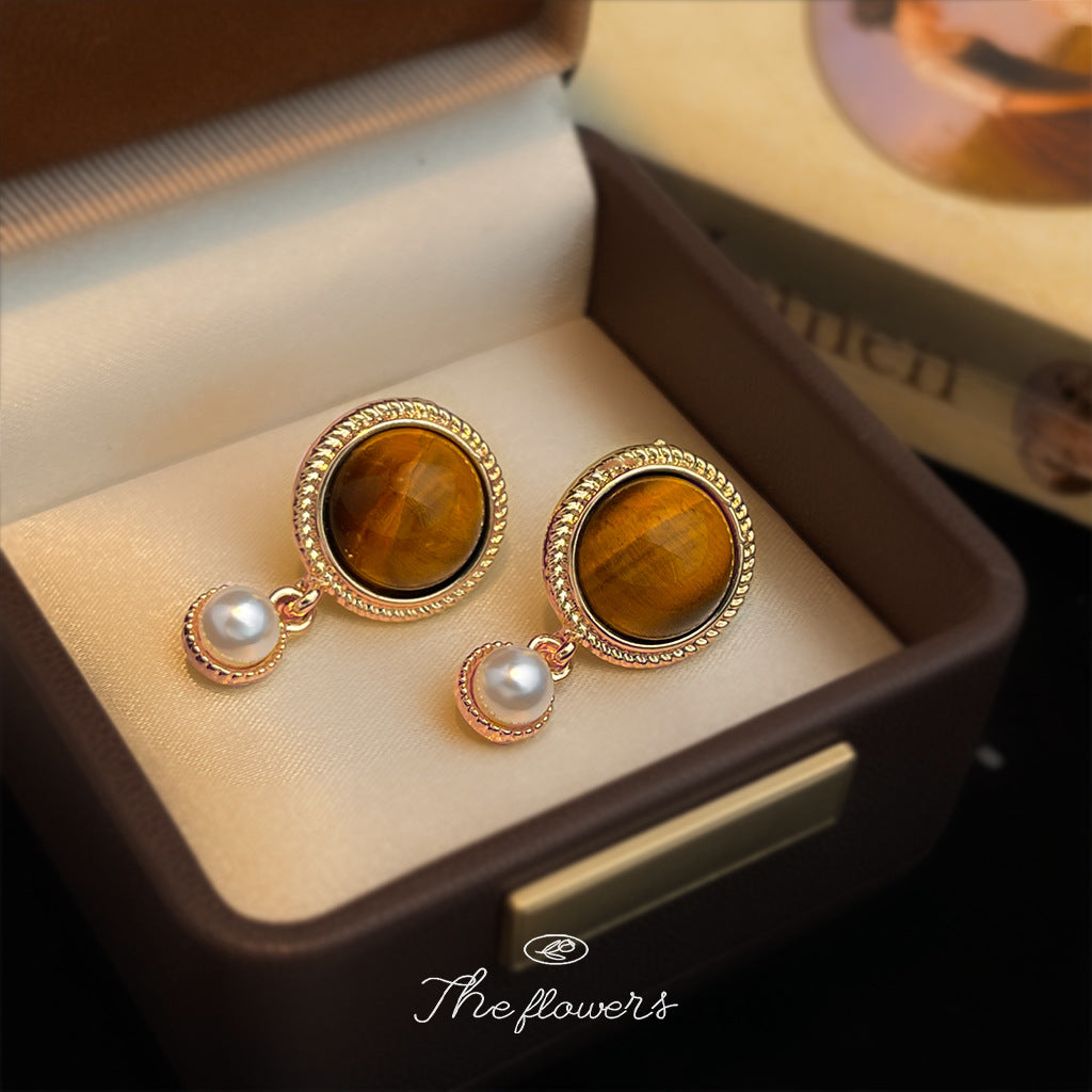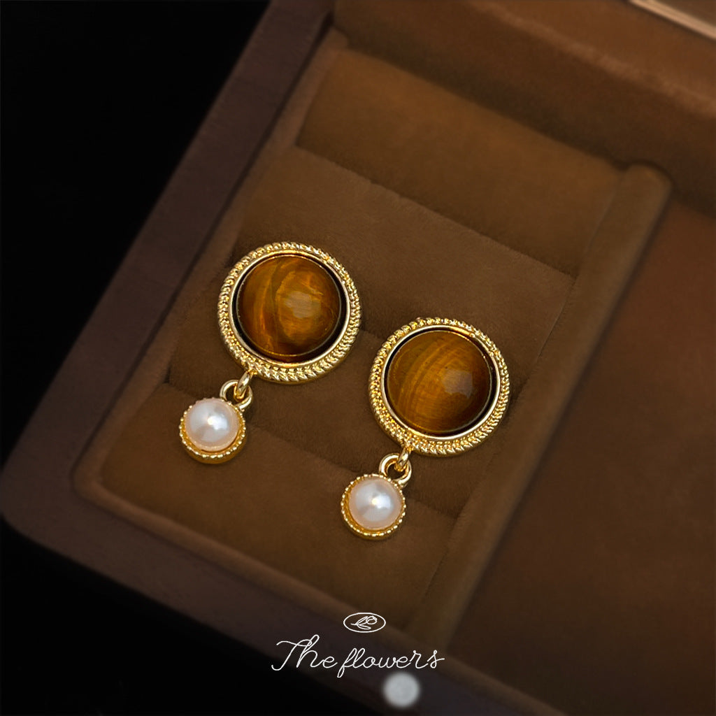 C廠【6853】天然石虎眼石美拉德風文藝復古圓形幾何新款耳環高級感耳環女 25.09-4