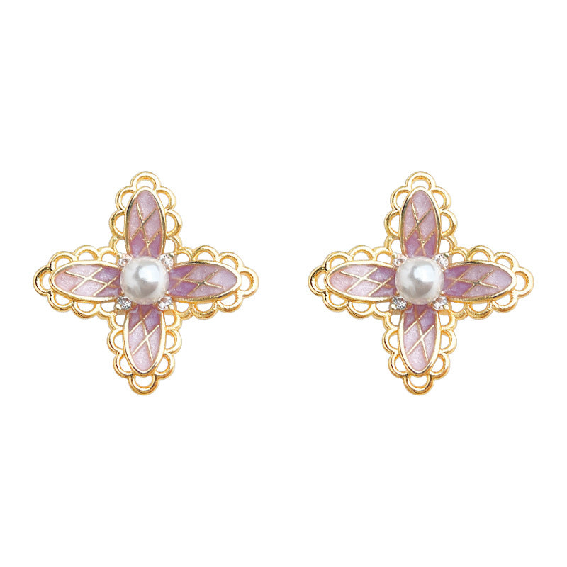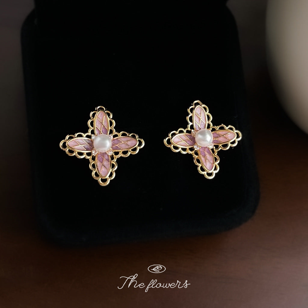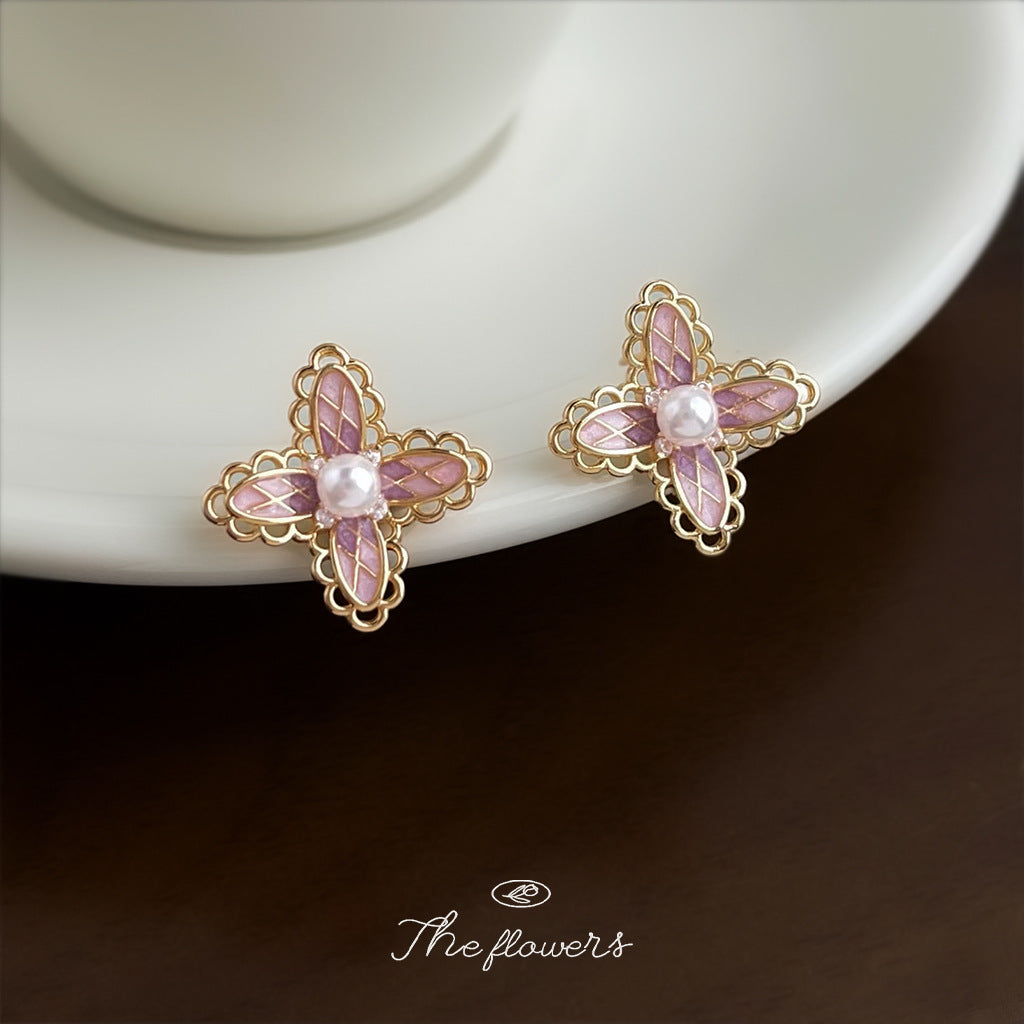 C廠【6864】洛麗塔 原創少女心漸變色925銀針微鑲鋯石彩繪粉色蕾絲花耳環耳飾 25.10-1