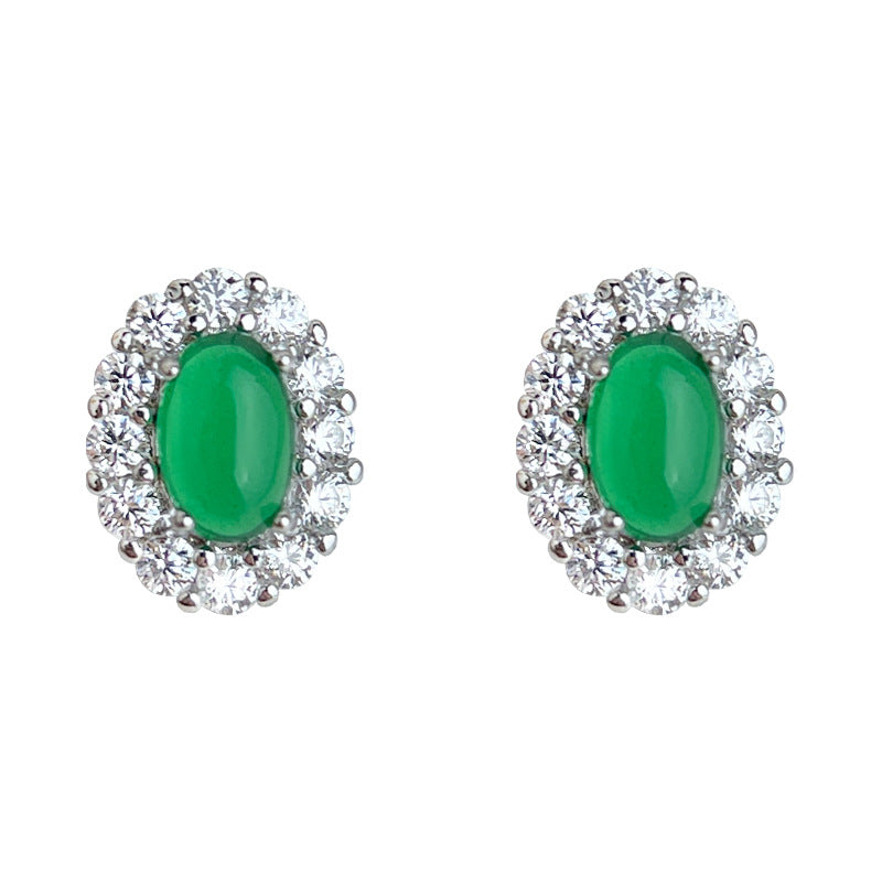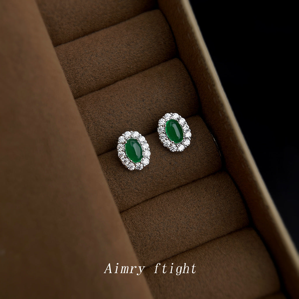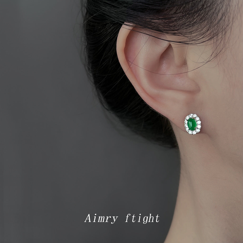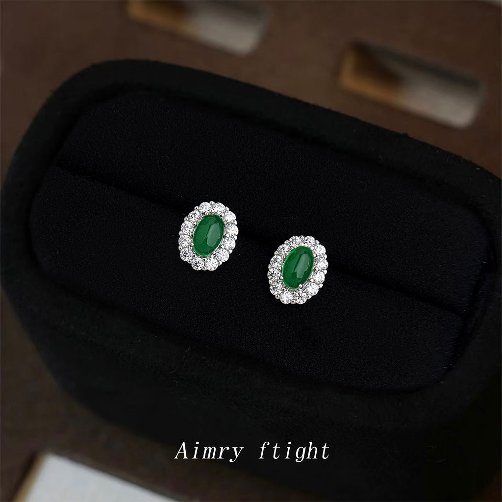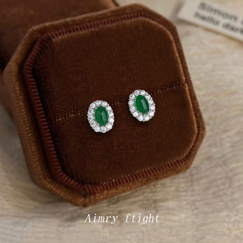 A廠【6876】高級感輕奢風微鑲鋯石925銀針橢圓祖母綠迷你小巧耳環女 氣質耳飾 25.10-3