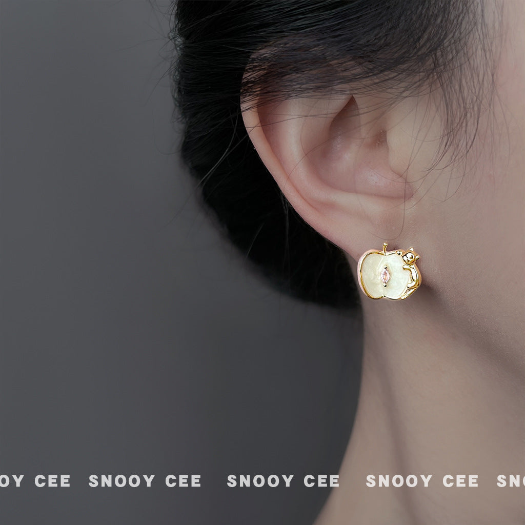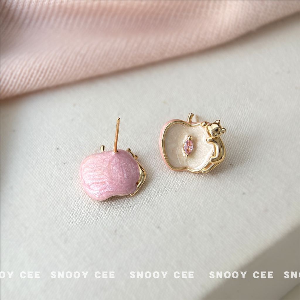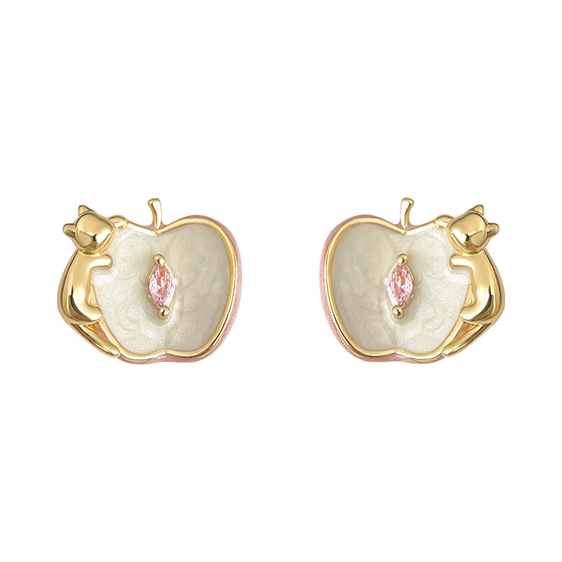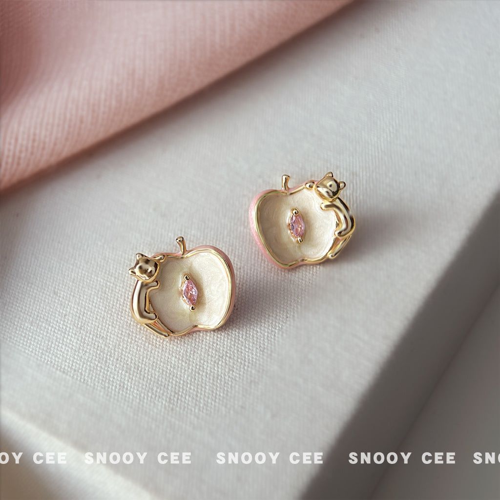 C廠【6895】原創設計師款蘋果與貓咪925銀針琺瑯滴釉彩繪鋯石耳環耳飾女 25.10-2