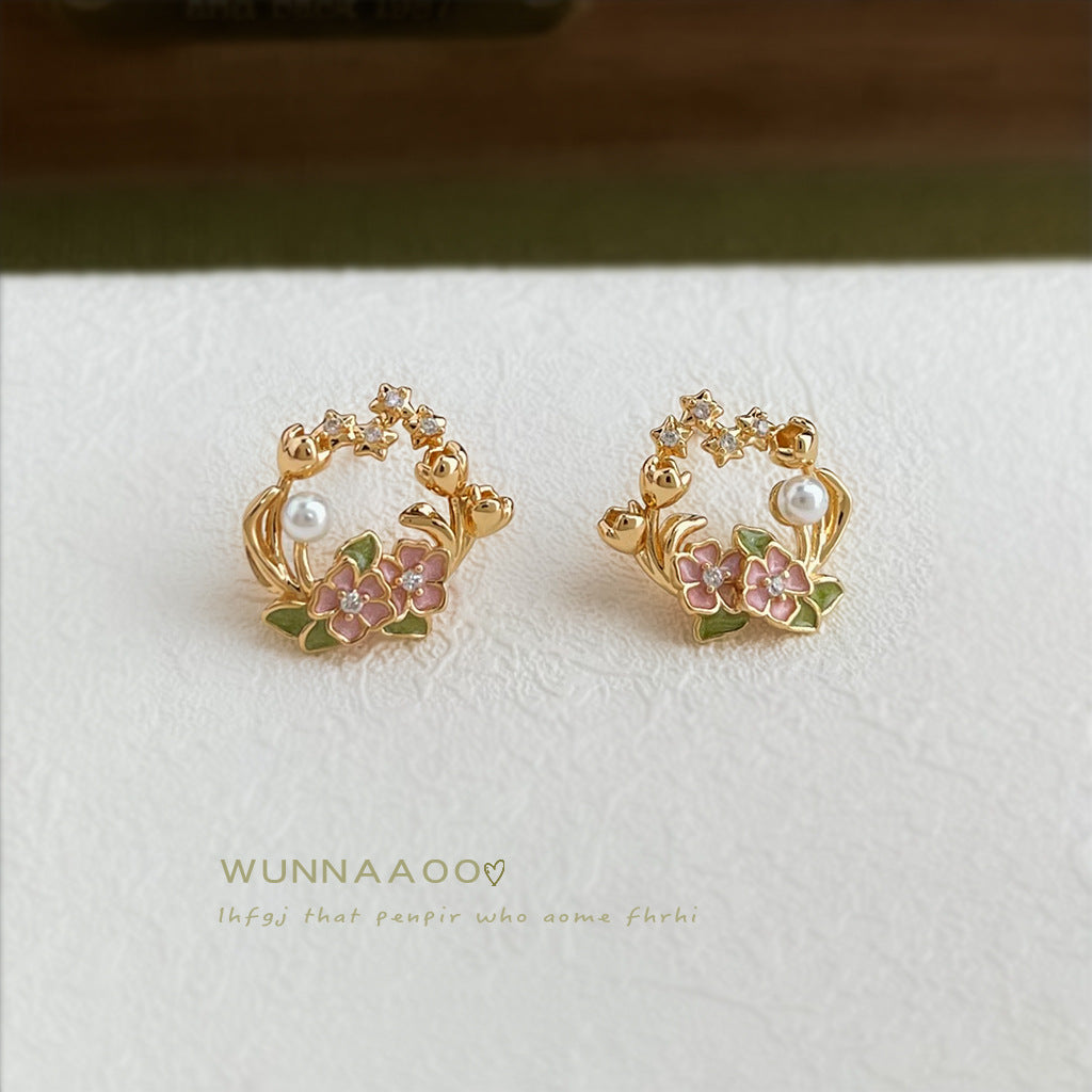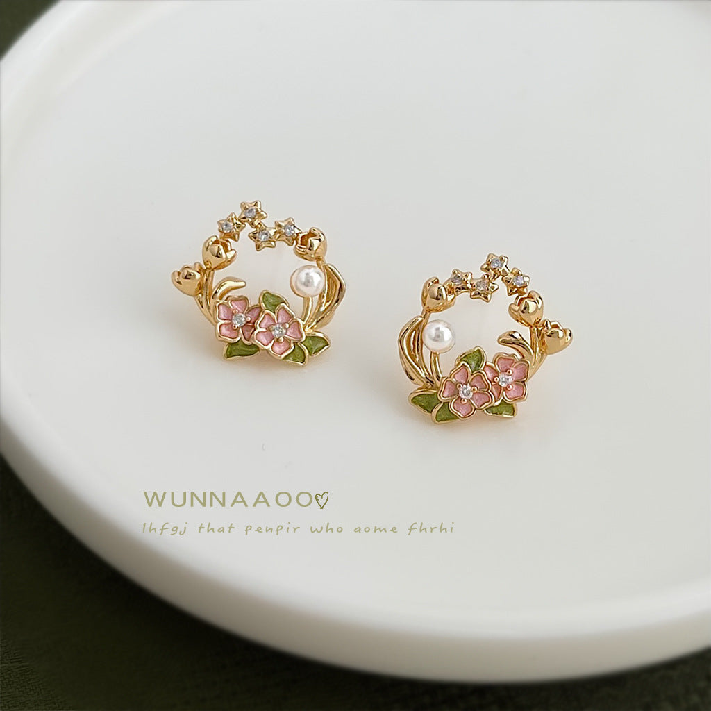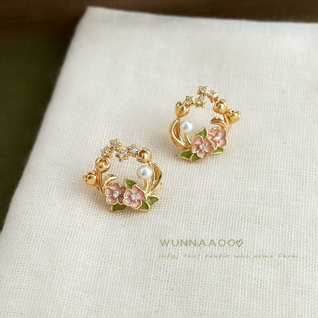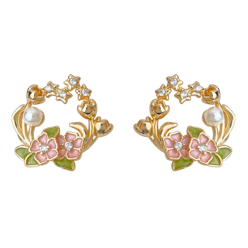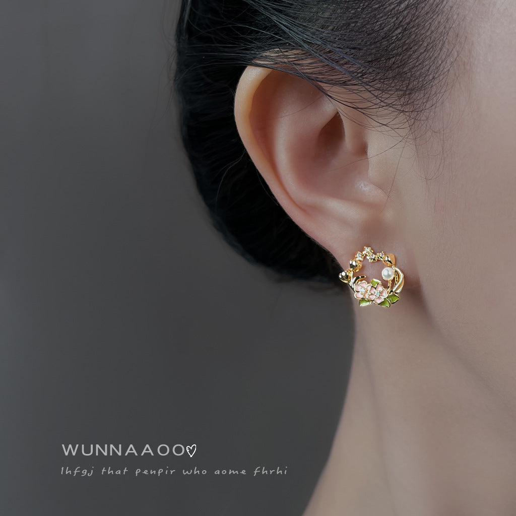 C廠【6961】原創微鑲鋯石925銀針鍍14K彩繪琺瑯滴釉花環森系清新甜美耳環耳飾 25.10-4