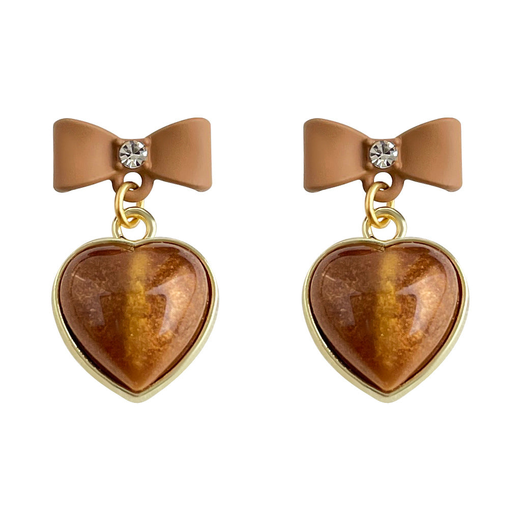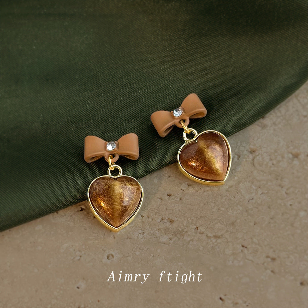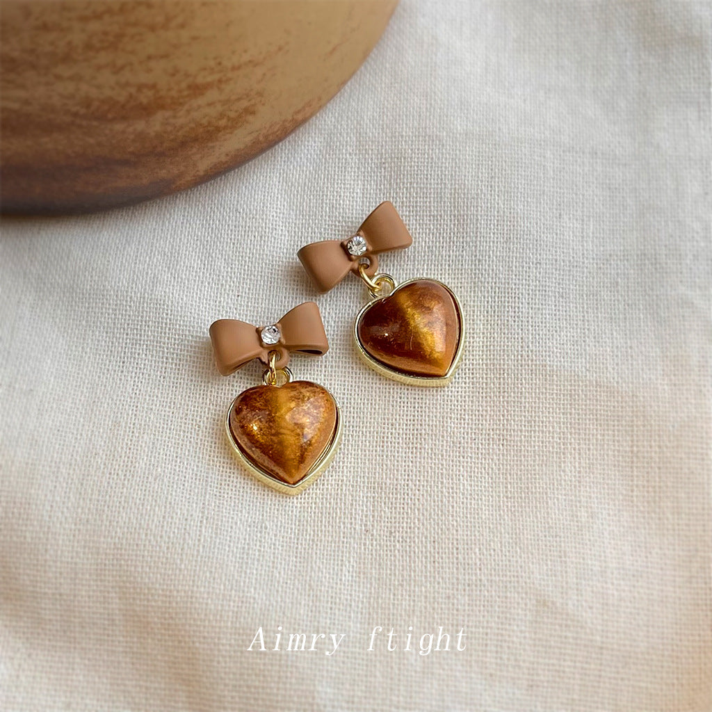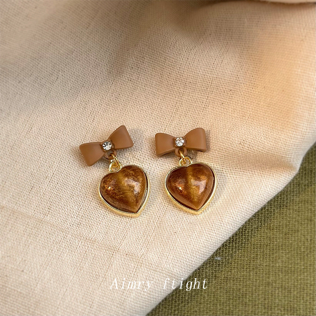 C廠【7018】秋冬熱賣美拉德風咖色大地色蝴蝶結愛心銀針耳環新款耳飾 25.11-1