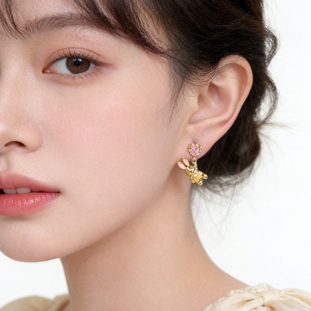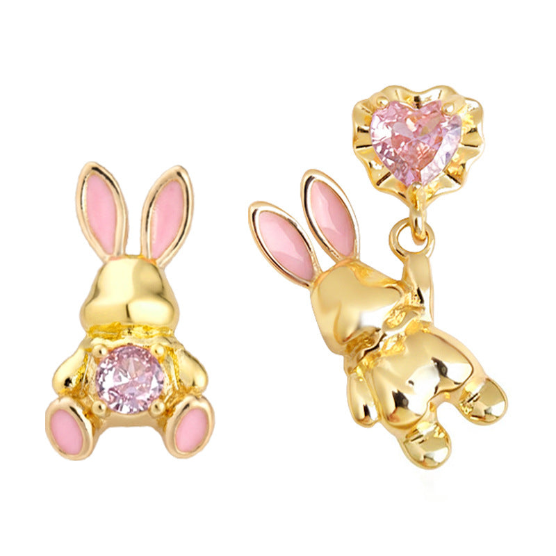 A廠【7361】原創設計可愛不對稱甜美兔子耳環鑲嵌鋯石銀針趣味童趣耳飾女 26.01-3