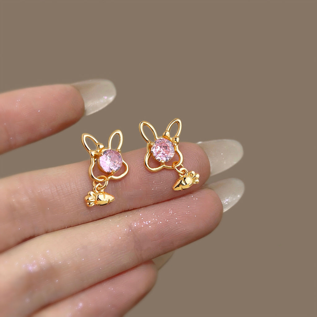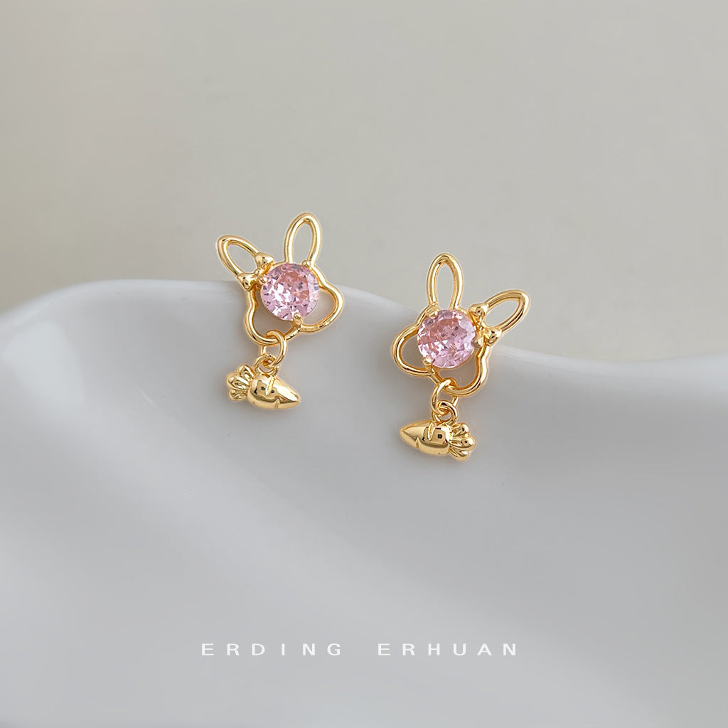A廠【7390】原創設計師款甜美可愛微鑲鋯石粉色小兔子胡蘿蔔耳飾新款耳環 26.02-4