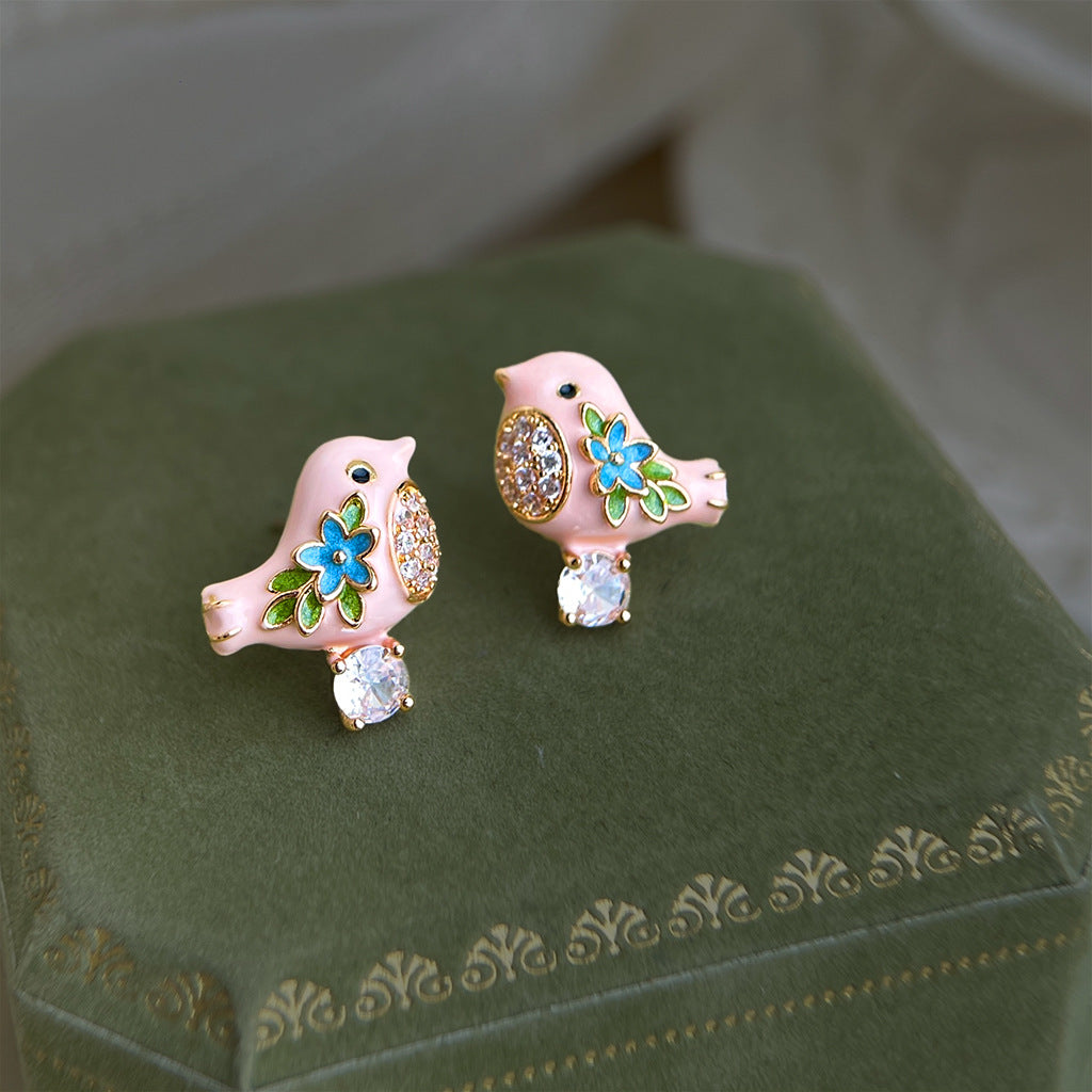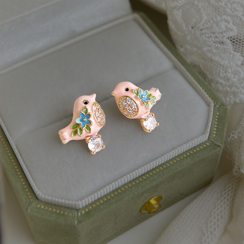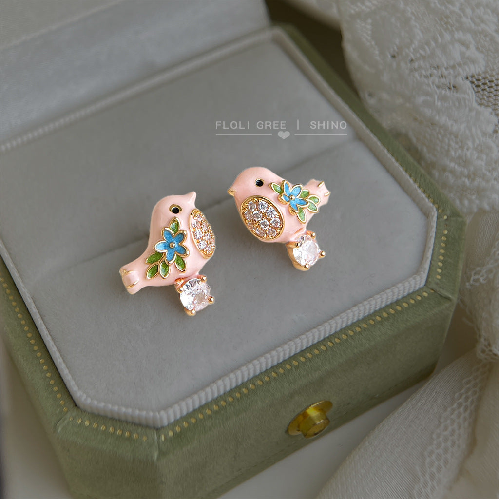 A廠【7523】原創甜美可愛琺瑯滴釉彩繪微鑲鋯石銀針小鳥耳環飾品耳飾 26.04-3