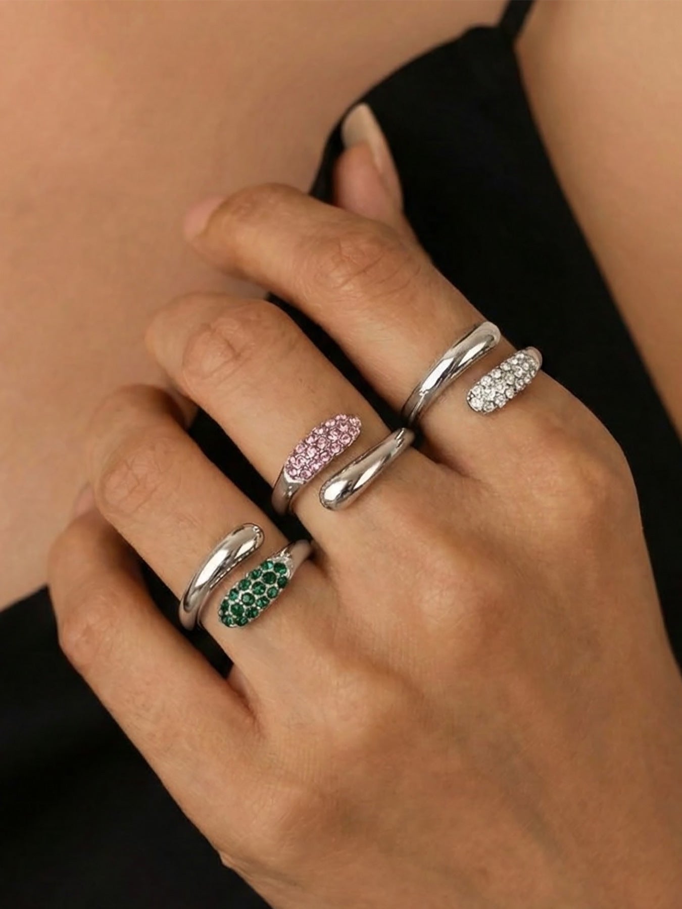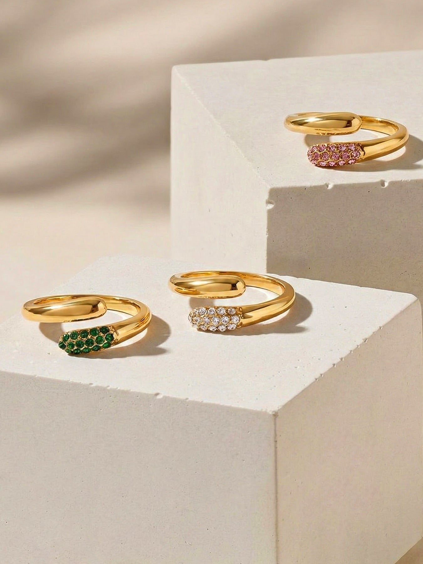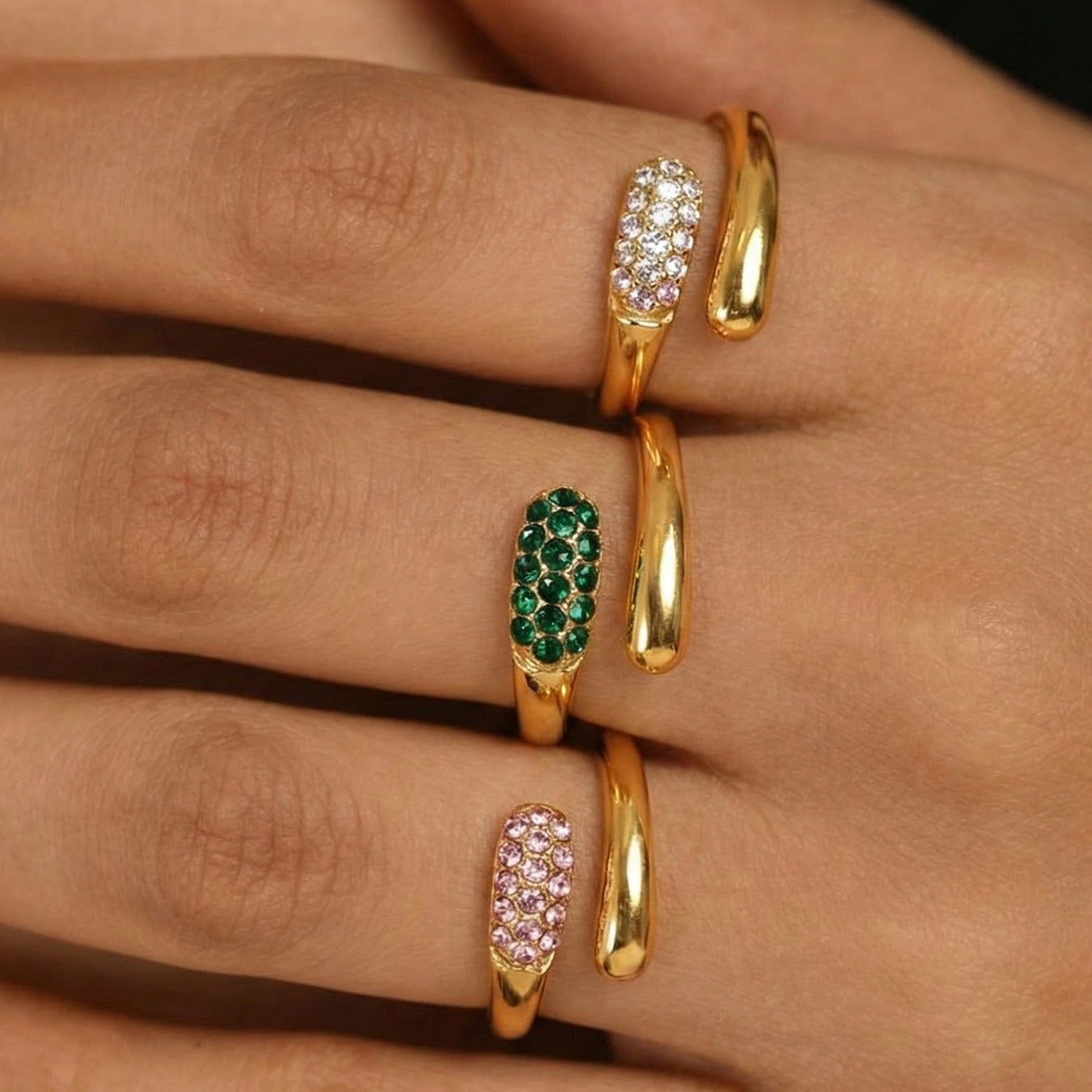 B廠【A002】跨國歐美ins時尚簡約粉綠白三色水鑽開口戒指不鏽鋼鍍18K真金飾品 26.01-2
