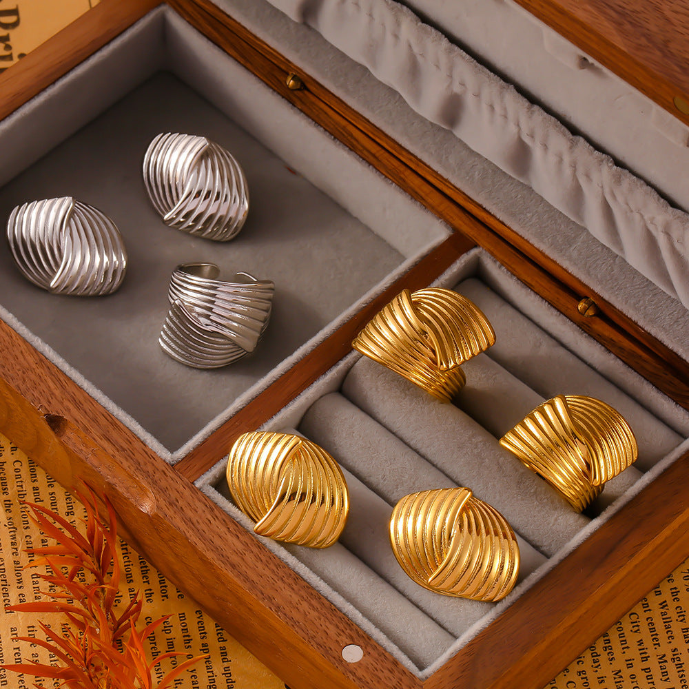 B廠【A045】歐美18K鍍金鈦鋼手工拋光線條紋路耳環Ins時尚簡約設計戒指 24.05-4