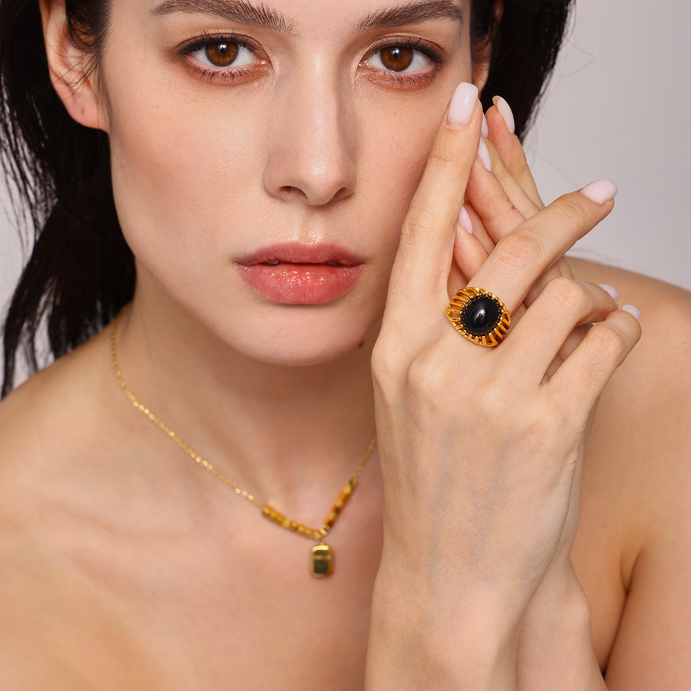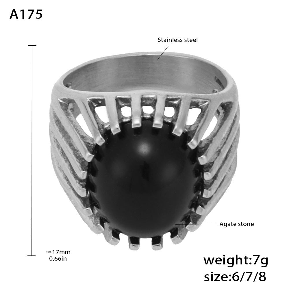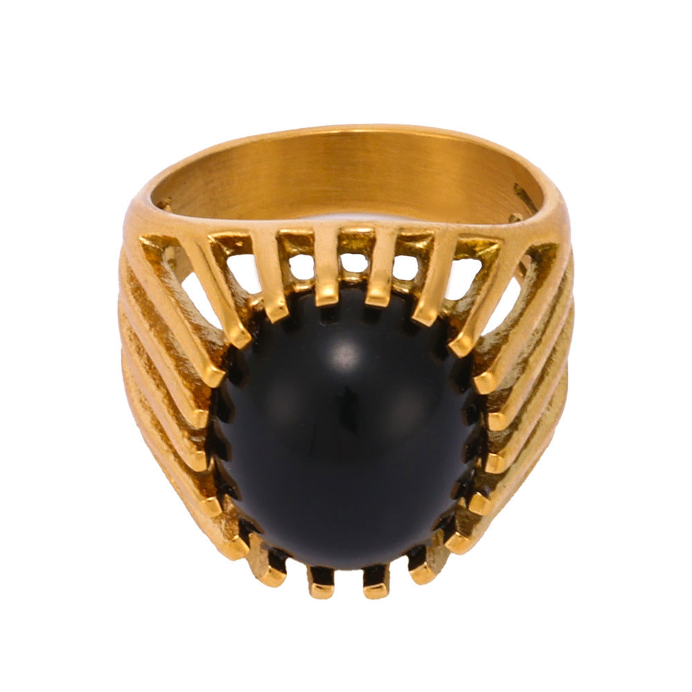 B廠【A175】歐美飾品黑瑪瑙鏤空重工戒指鈦鋼鍍18k真金食指戒指環 25.01-4