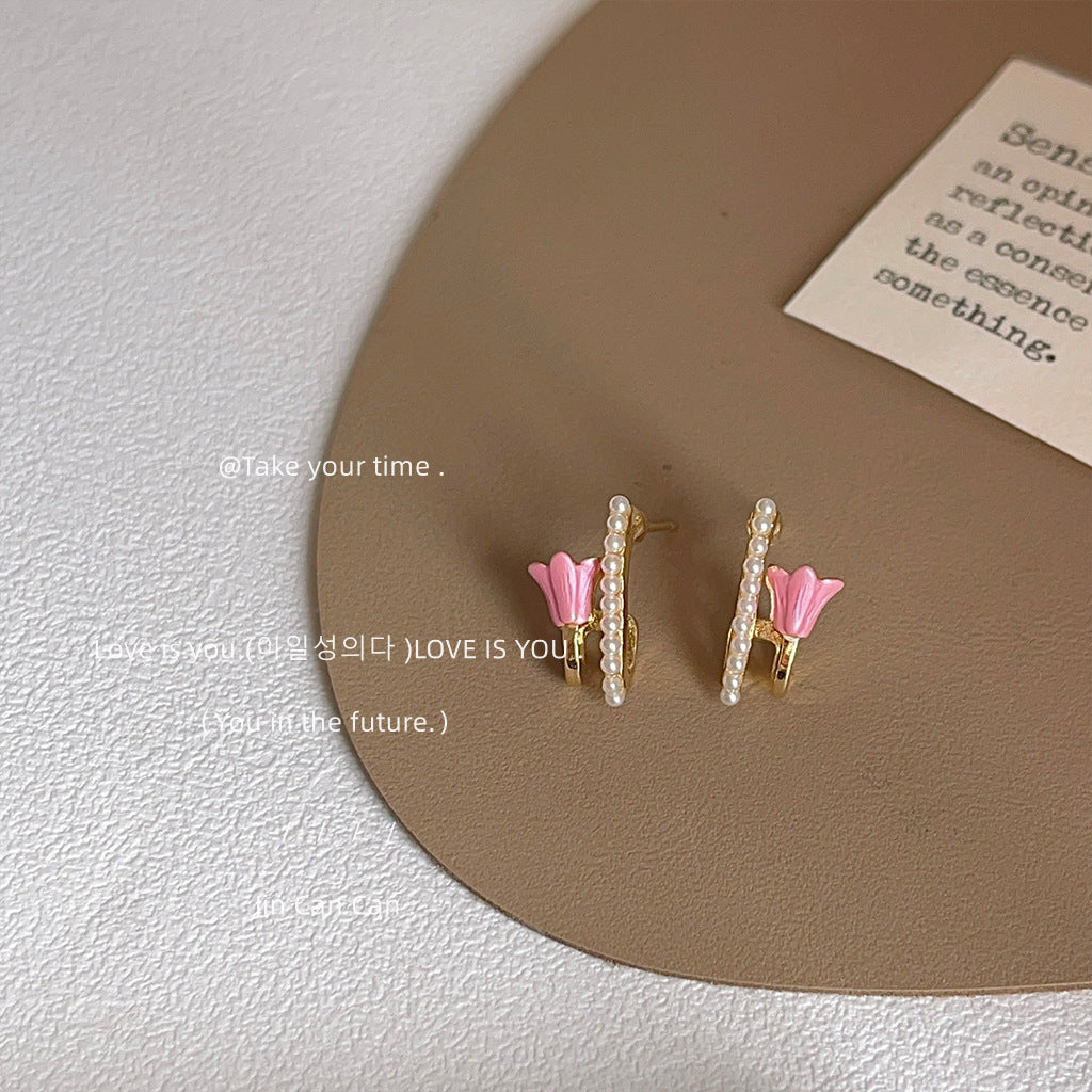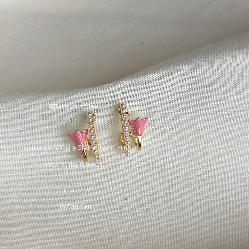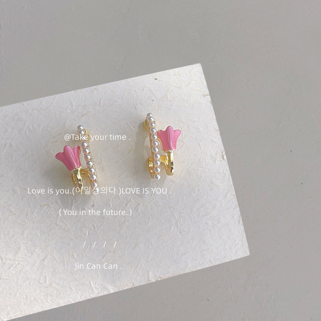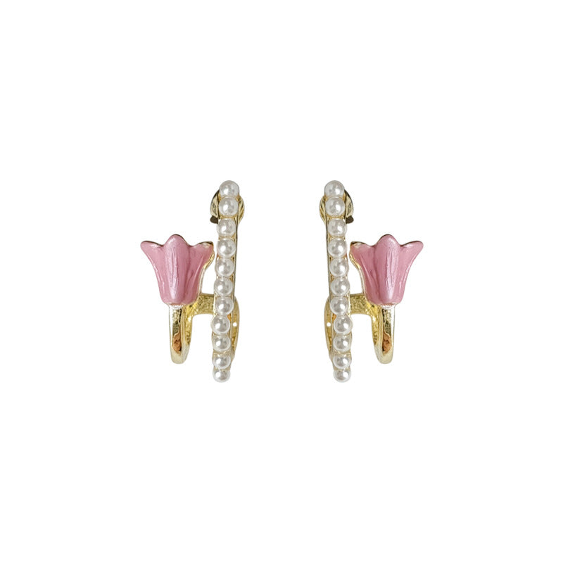 C廠【A244】森系超仙手工藝粉紅色滴釉立體鬱金香耳環雙層設計感珍珠氣質甜美耳飾 24.01-3