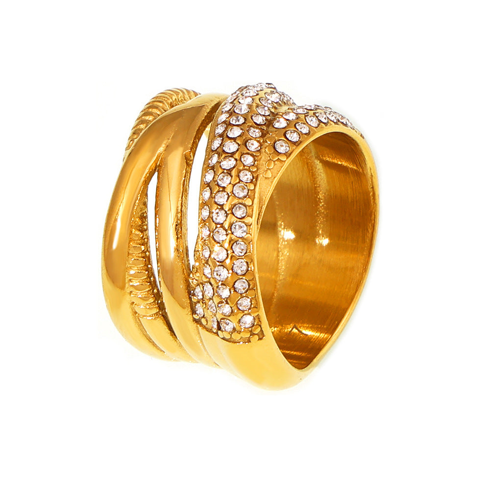 B廠【A347】熱銷歐美新款交叉編織鑲多重排鑽戒指鈦鋼鍍18k真金輕奢時髦指環 24.08-2