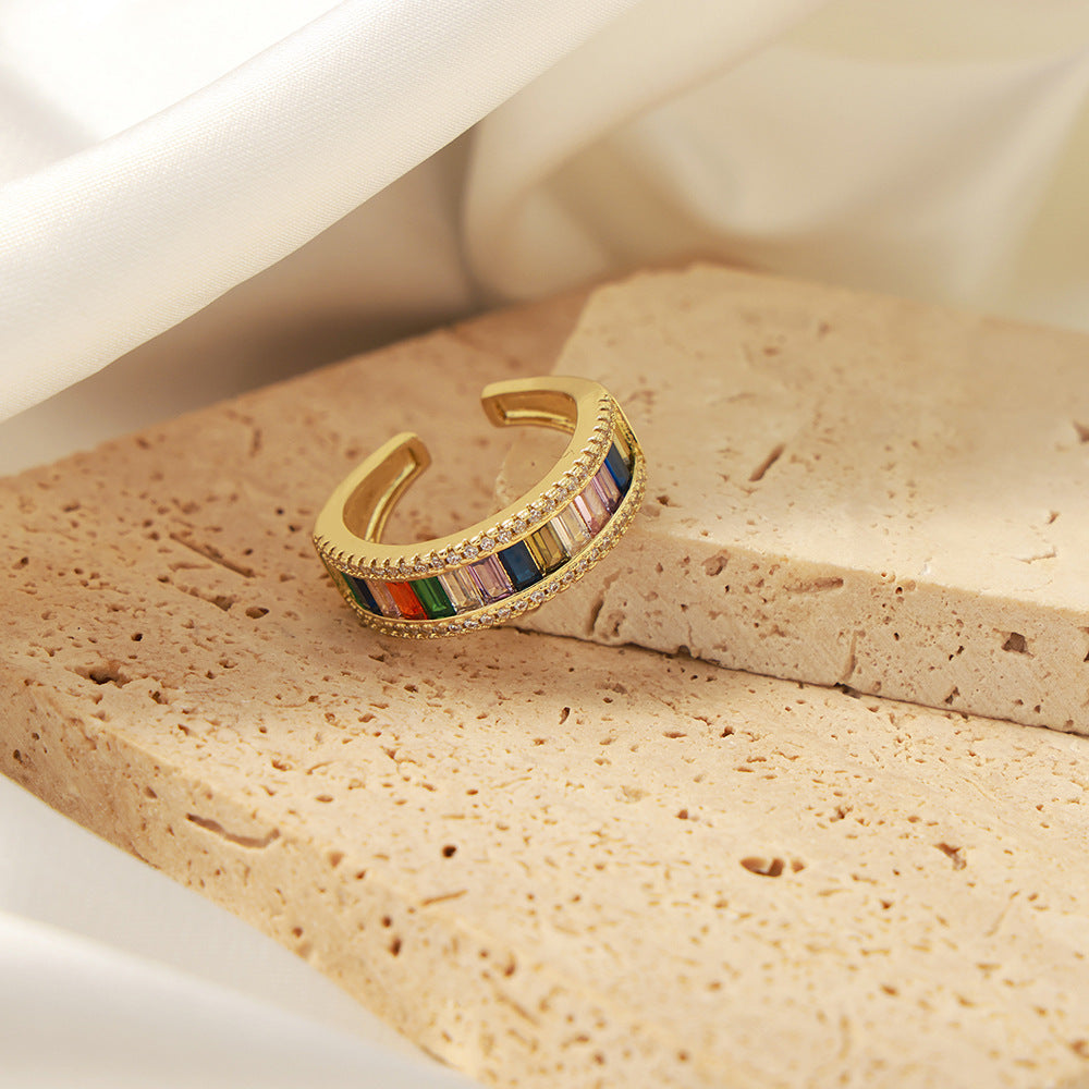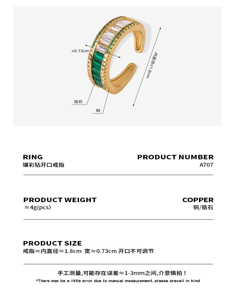 B廠【A707】歐美跨國新款輕奢個性小眾設計銅材質鑲彩色鋯石開口戒指時尚飾品 24.01-1