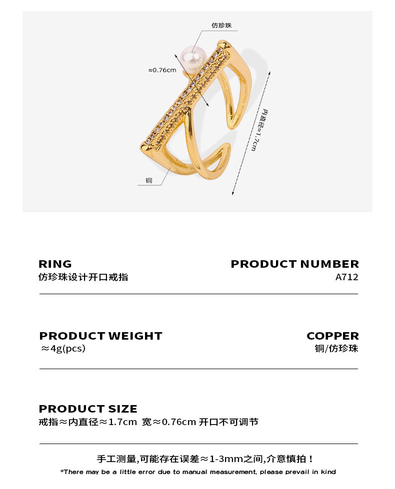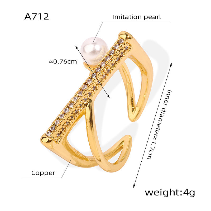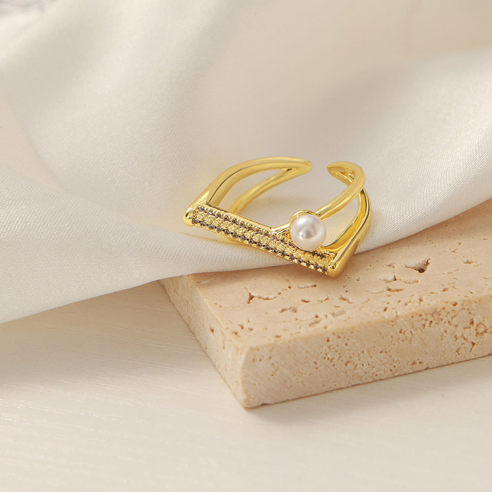 B廠【A712】英倫風幾何交叉奢華戒指微鑲鋯石珍珠尾戒銅鍍金小眾設計指環 24.01-3