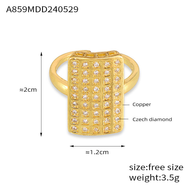 B廠【A859】歐美簡約個性戒指女熱賣飾品方形鑲鑽嘻哈誇張指環銅材質鍍18k金 24.06-1
