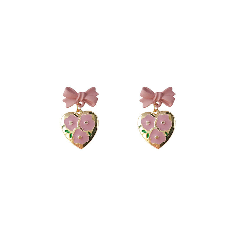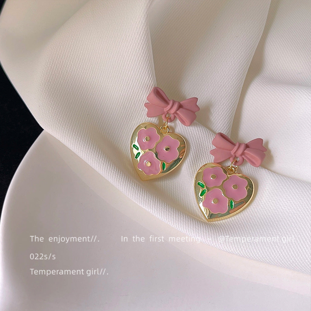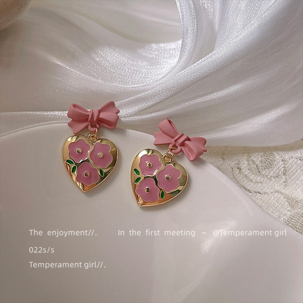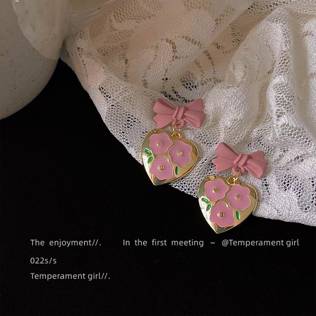 C廠【A954】春夏清新甜美粉紅花朵愛心耳環小眾設計感可愛蝴蝶結公主風耳飾女 24.05-4