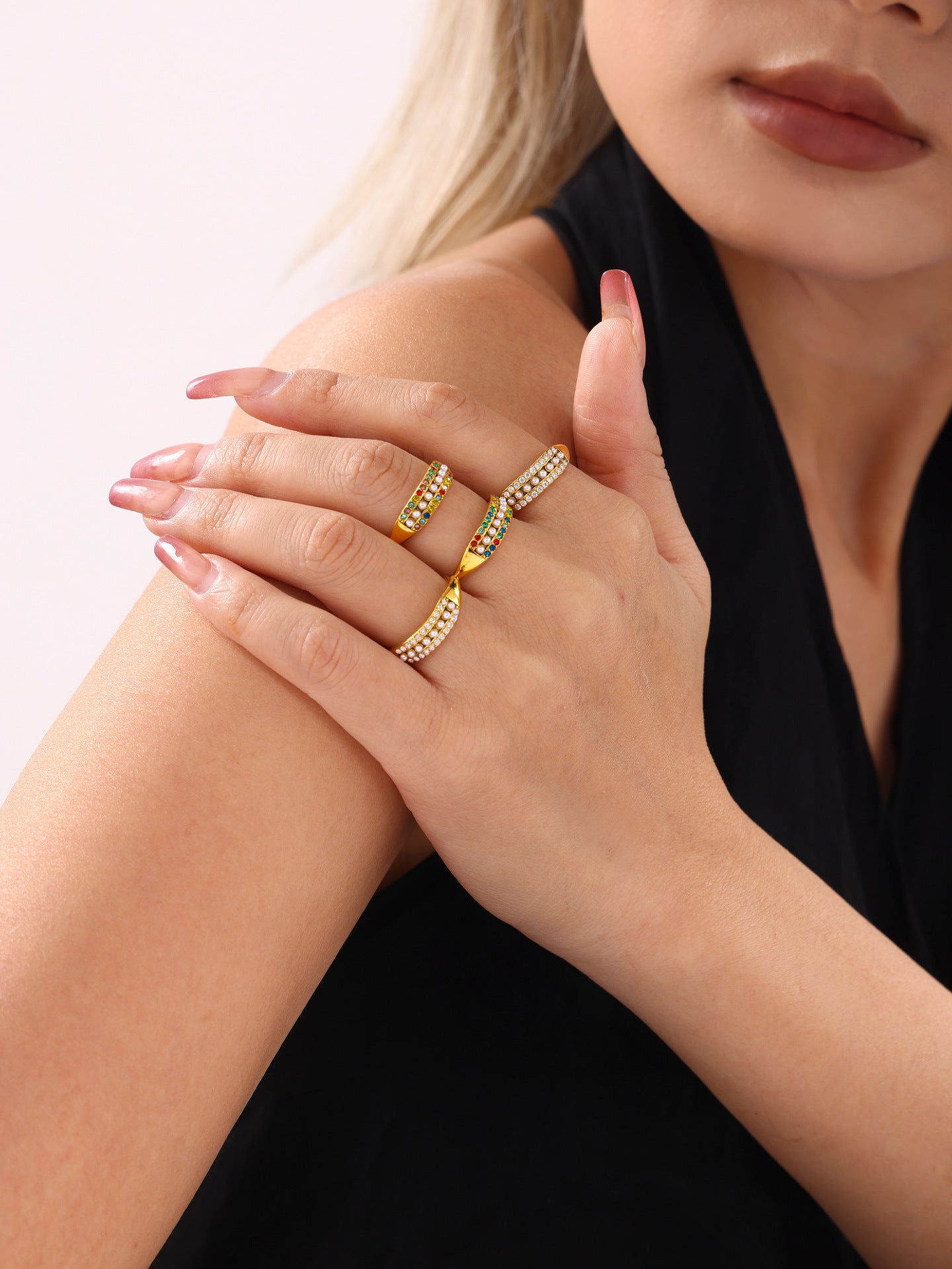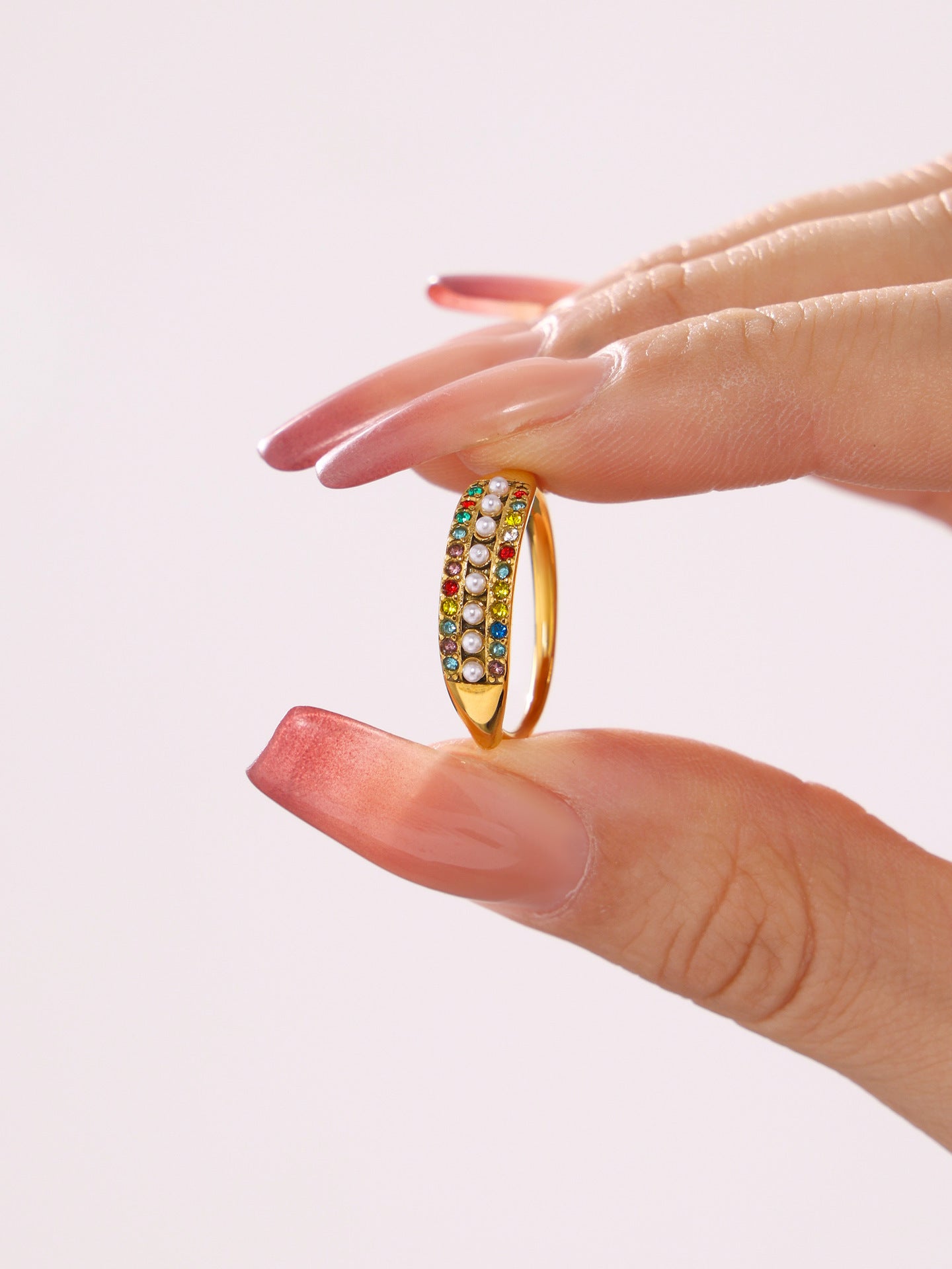 B廠【A965】不鏽鋼可調整精緻小巧貝珠彩色鋯石側邊開口食指戒尾戒 24.12-3