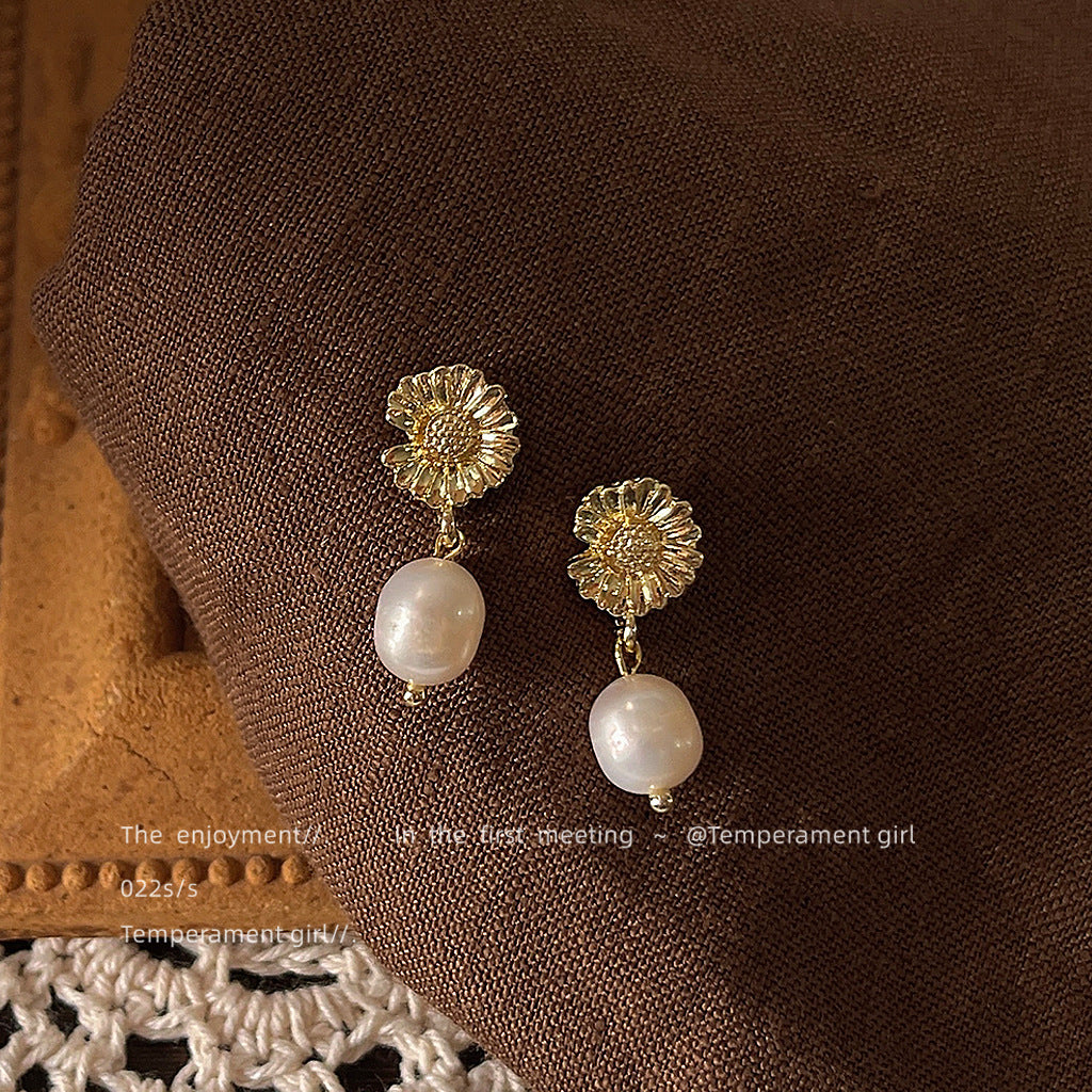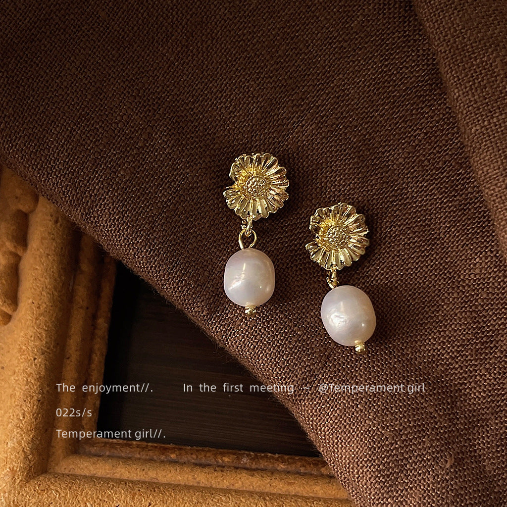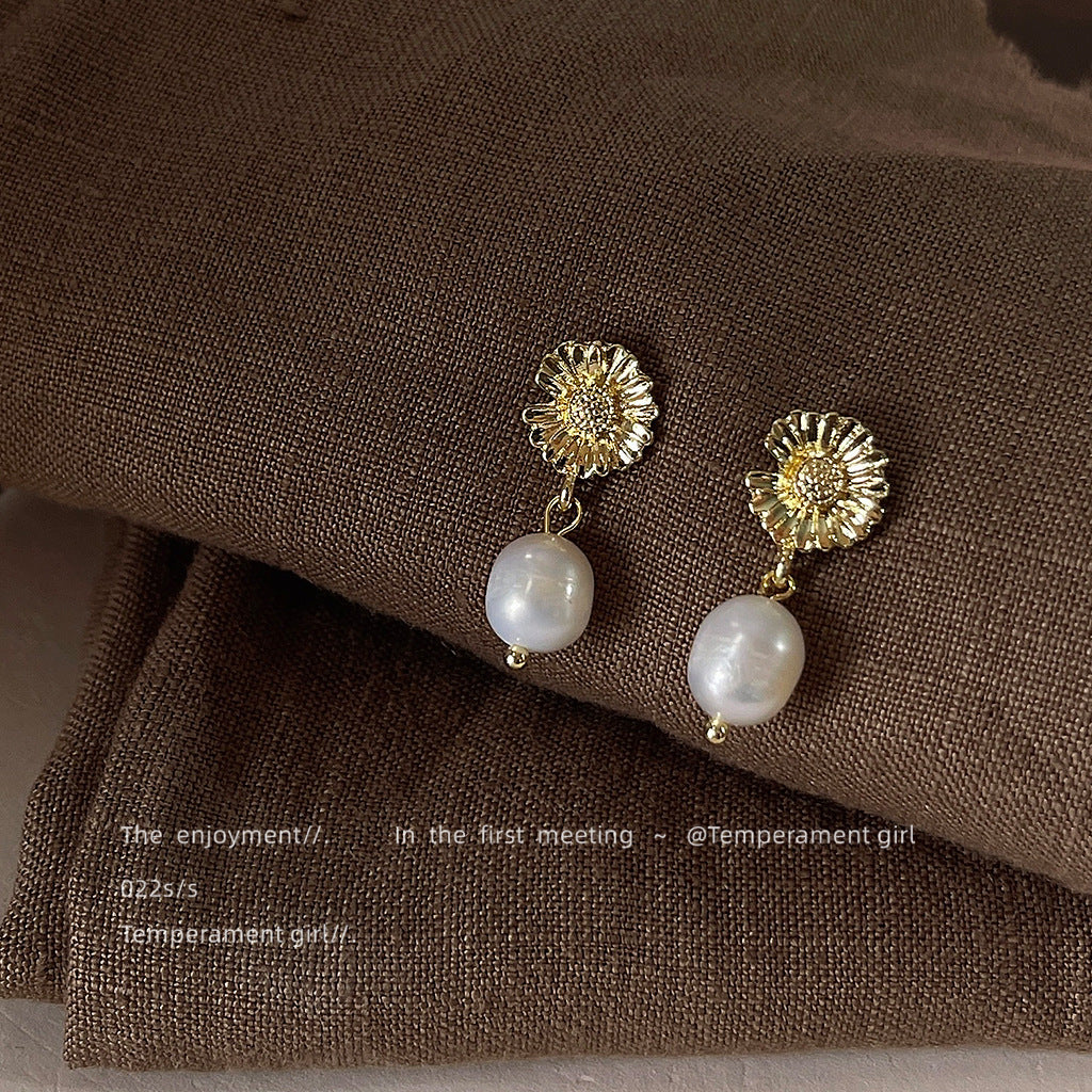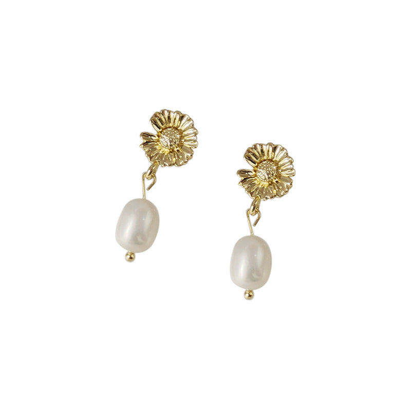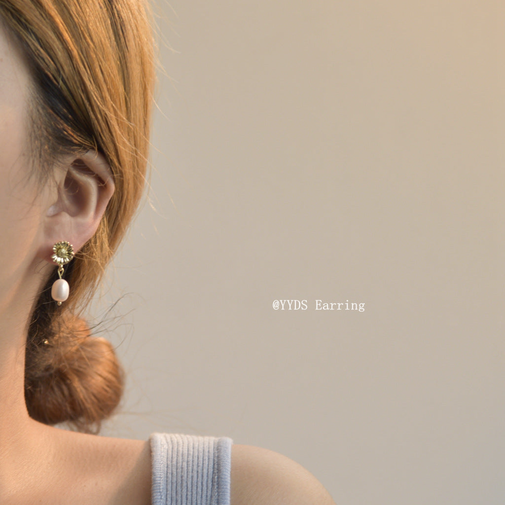 C廠【B-910】925銀針鍍14K淡水珍珠手工耳環 女雛菊日韓簡約耳飾耳環 24.04-2