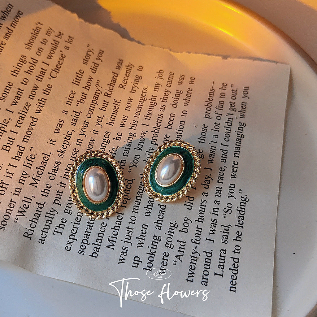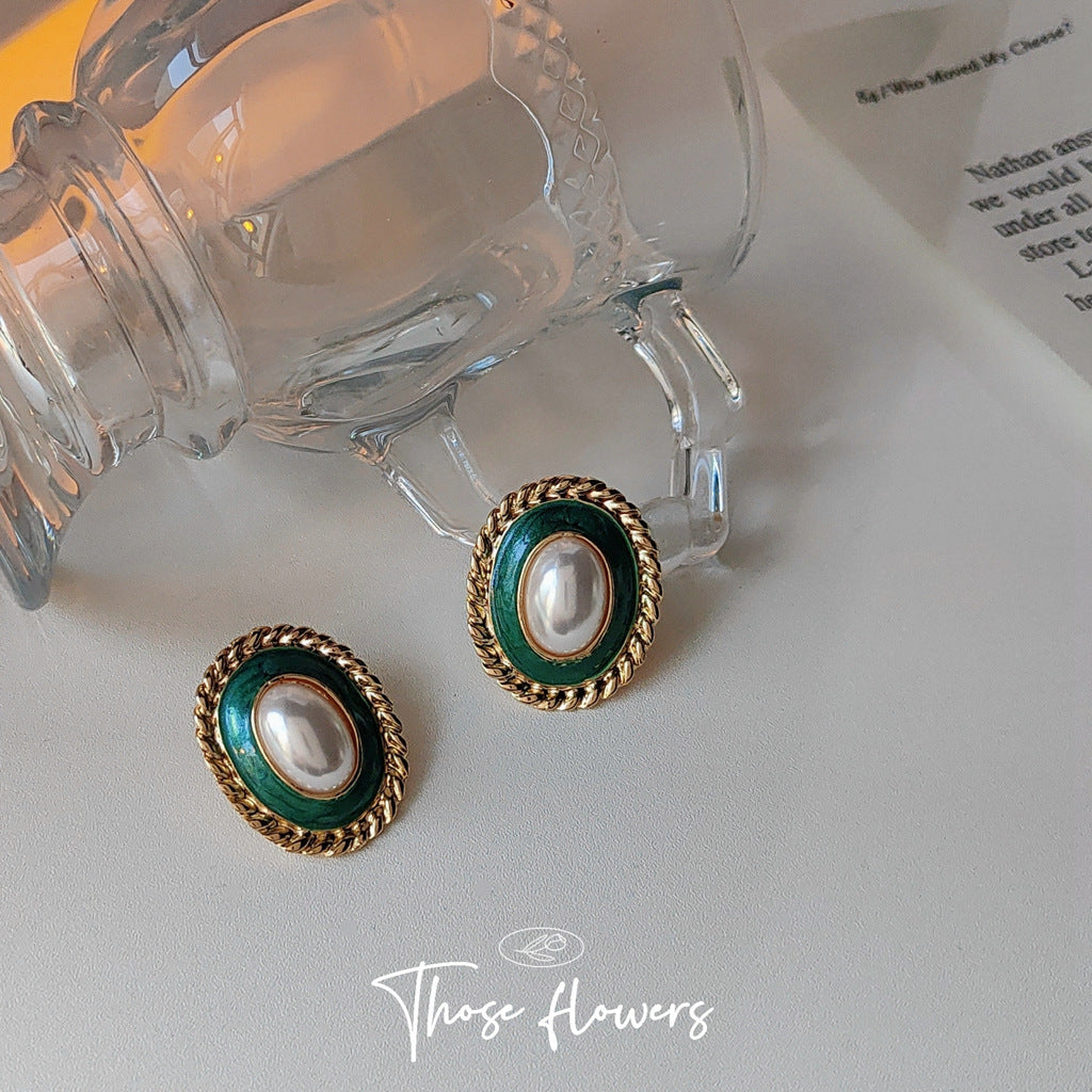 C廠【C-447】法式宮廷風橢圓琺瑯滴釉高級感氣質耳環復古珍珠輕奢耳飾925銀針 24.02-4