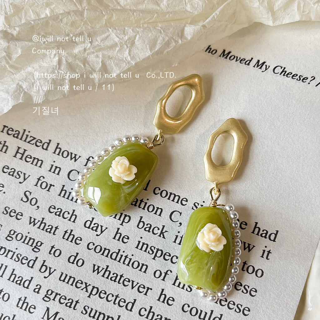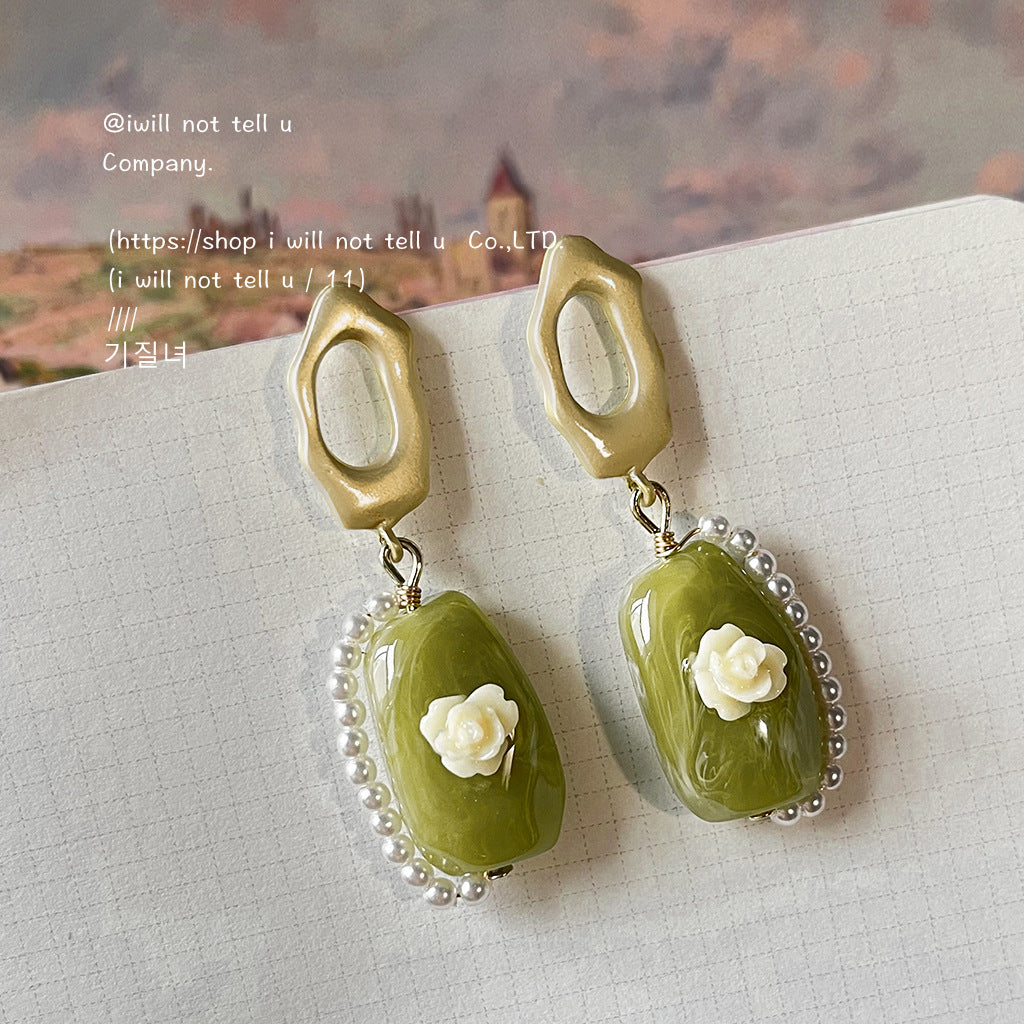 耳環頭是銅鍍啞光金色 下面的綠色是樹脂 珍珠是樹脂高亮珍珠