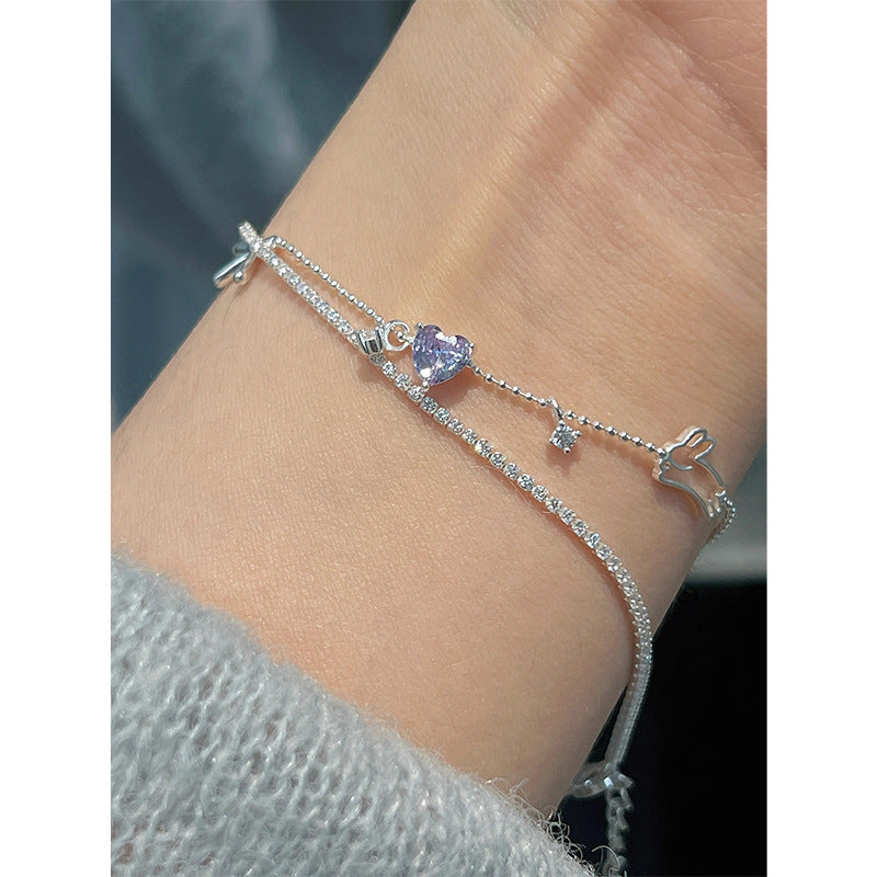 F廠【DQ0193S】小清新可愛兔子蝴蝶結手鍊女S925純銀精緻紫色愛心閃鑽手飾 25.07-4