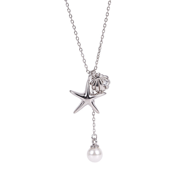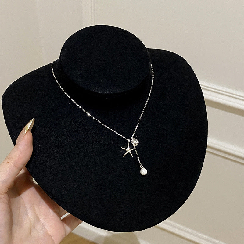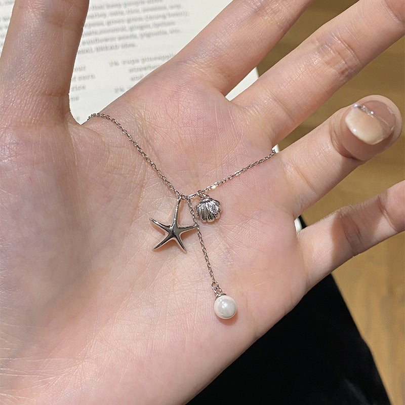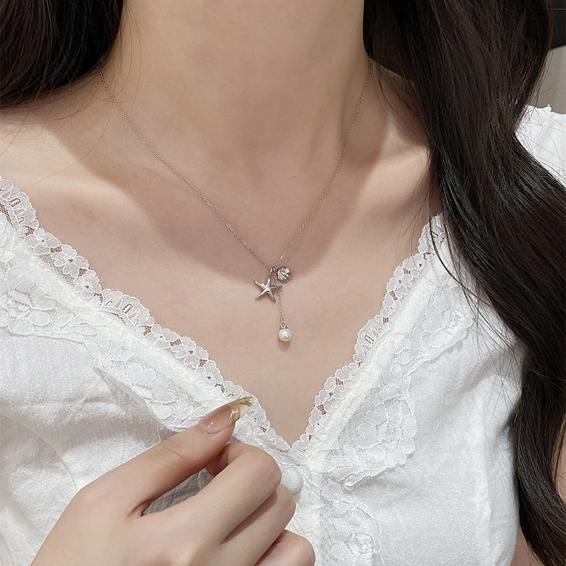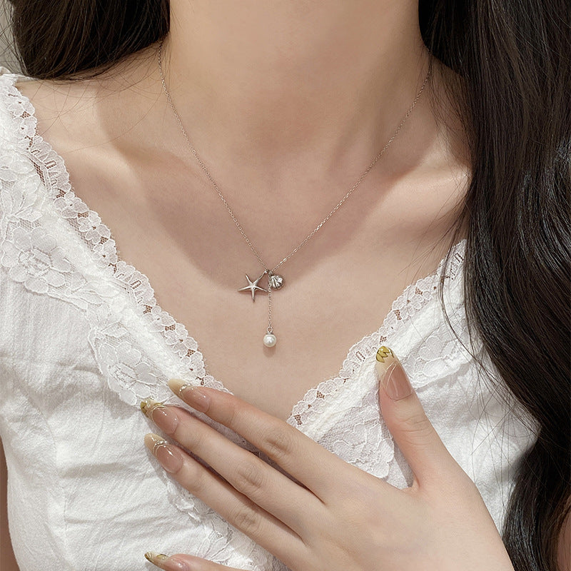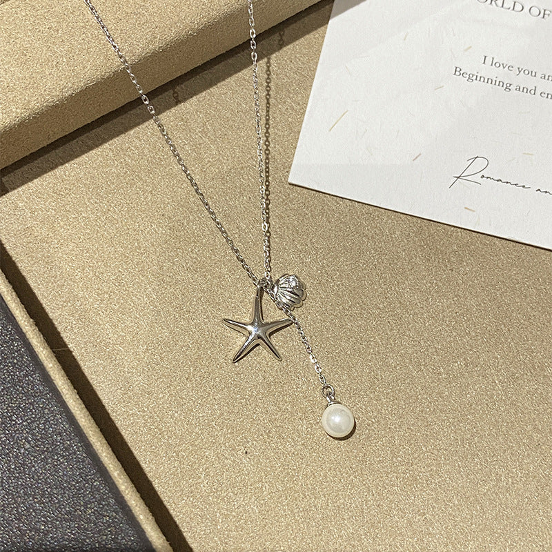 F廠【DQ0434N】原創S925純銀氣質甜美海星貝殼項鍊女時尚個性珍珠流蘇鎖骨鏈 25.09-3