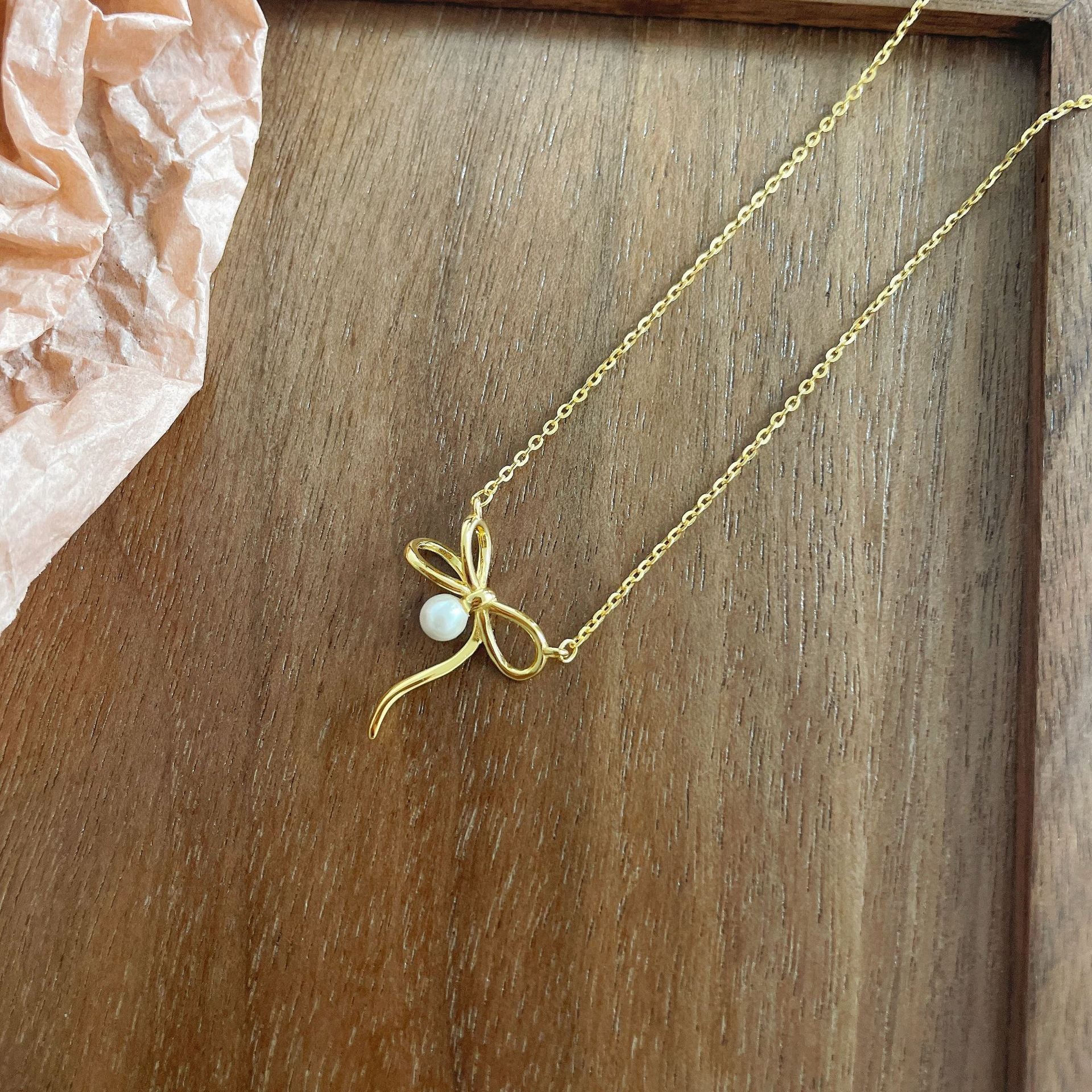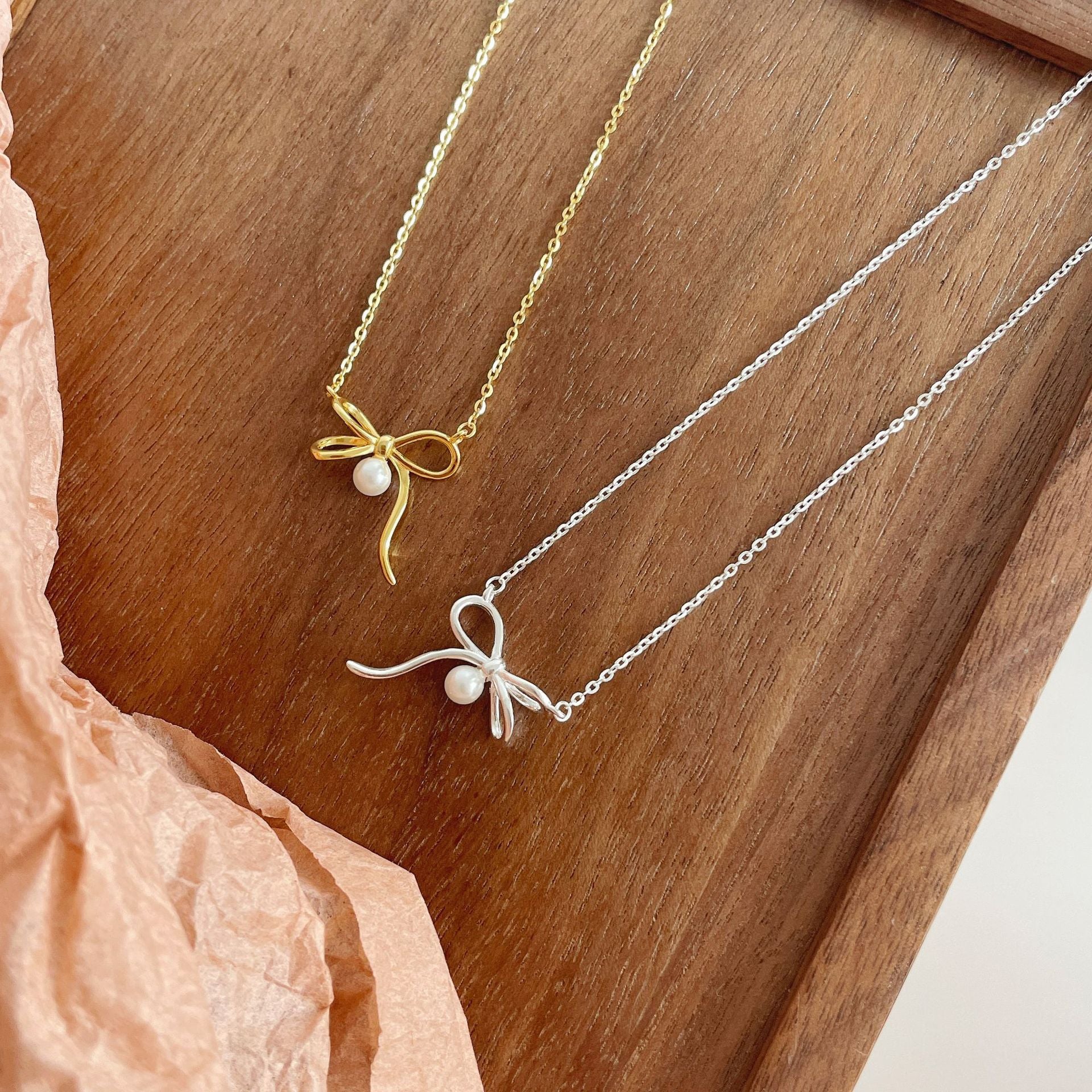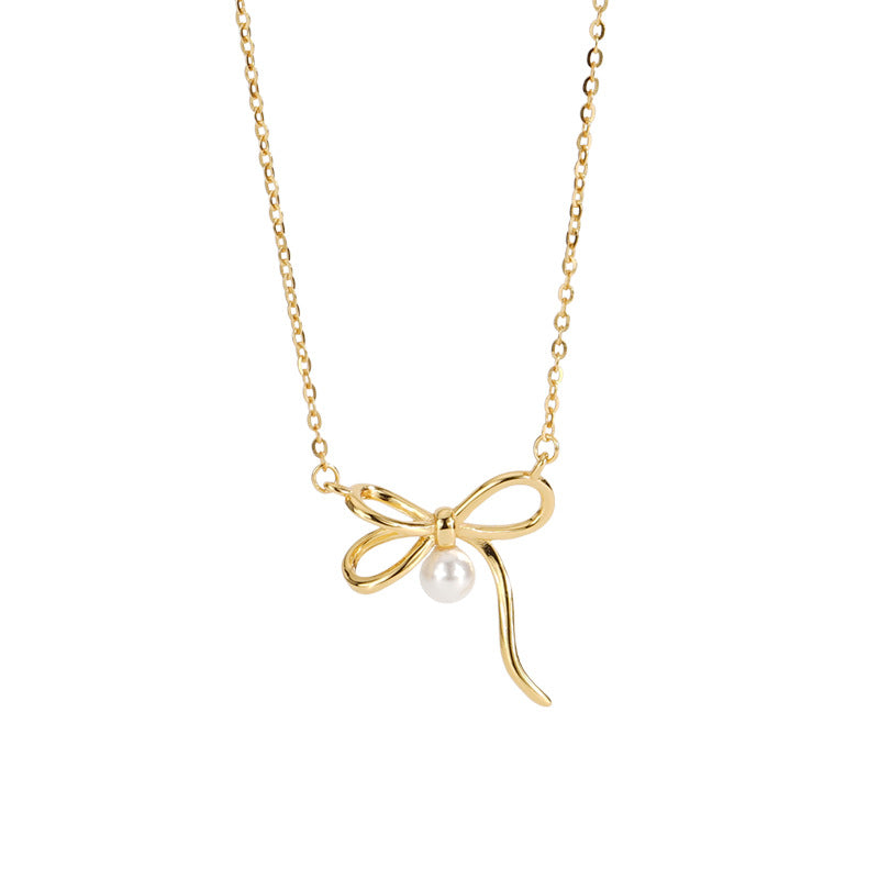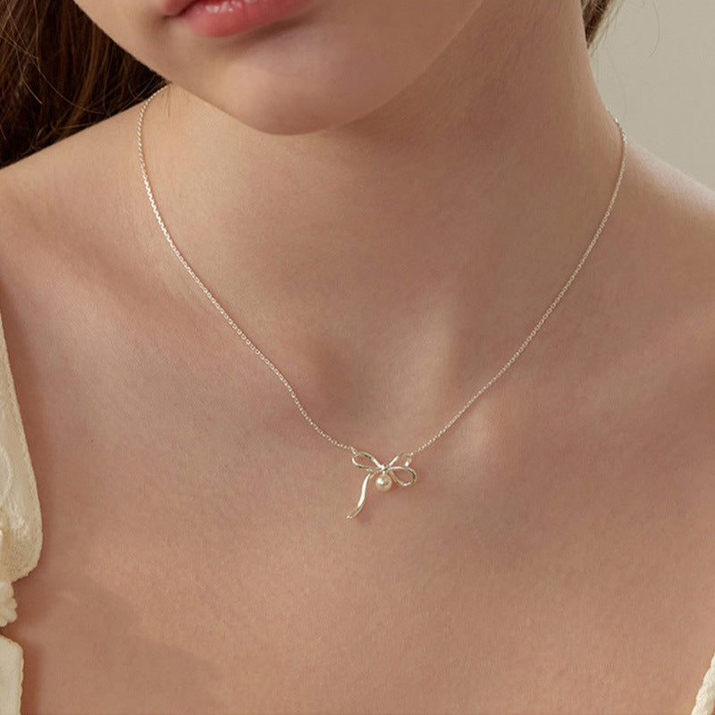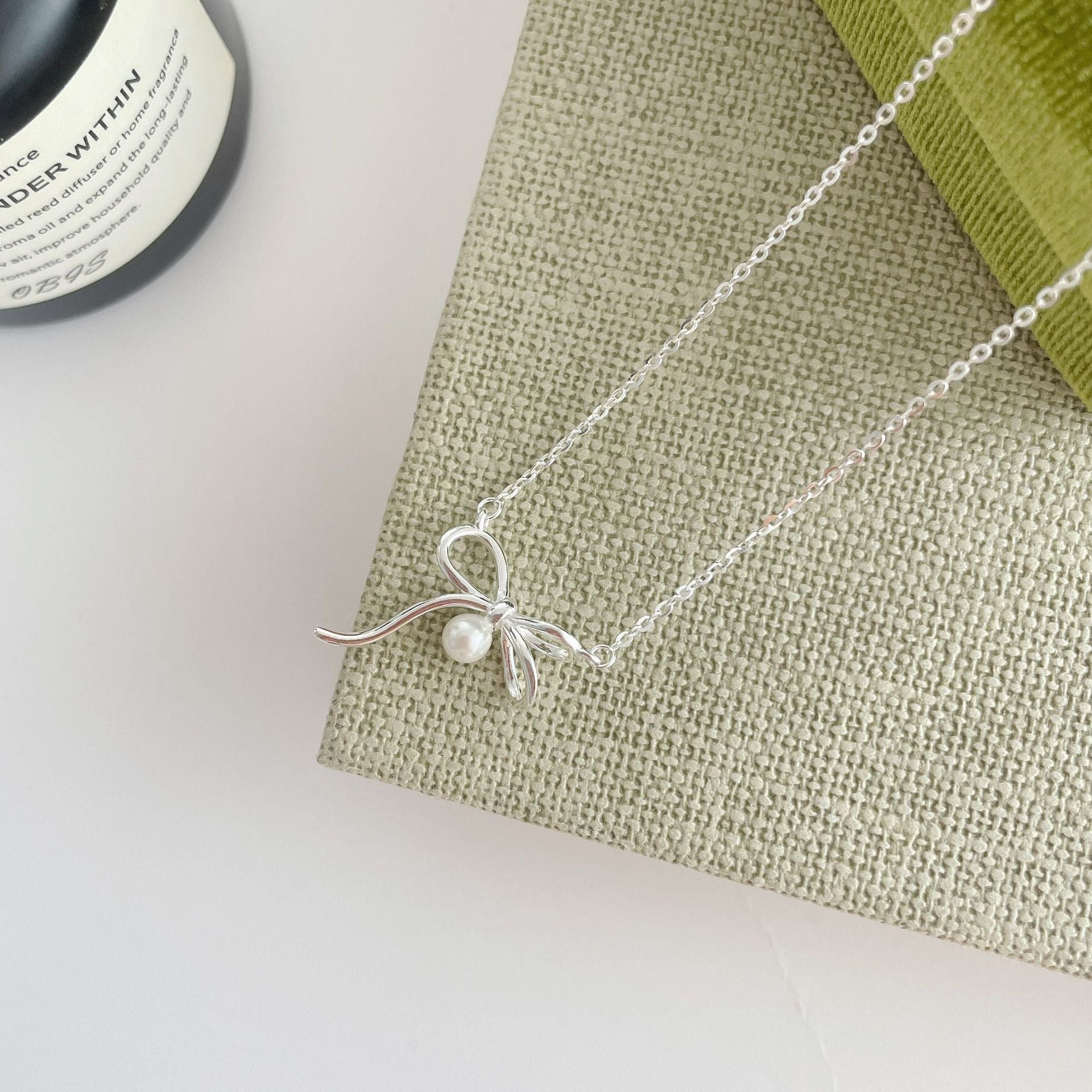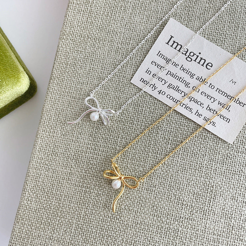 F廠【DQ0449N】韓國S925純銀蝴蝶結仿珍珠項鍊女輕奢高級感緞帶蝴蝶結鎖骨鏈 25.02-4
