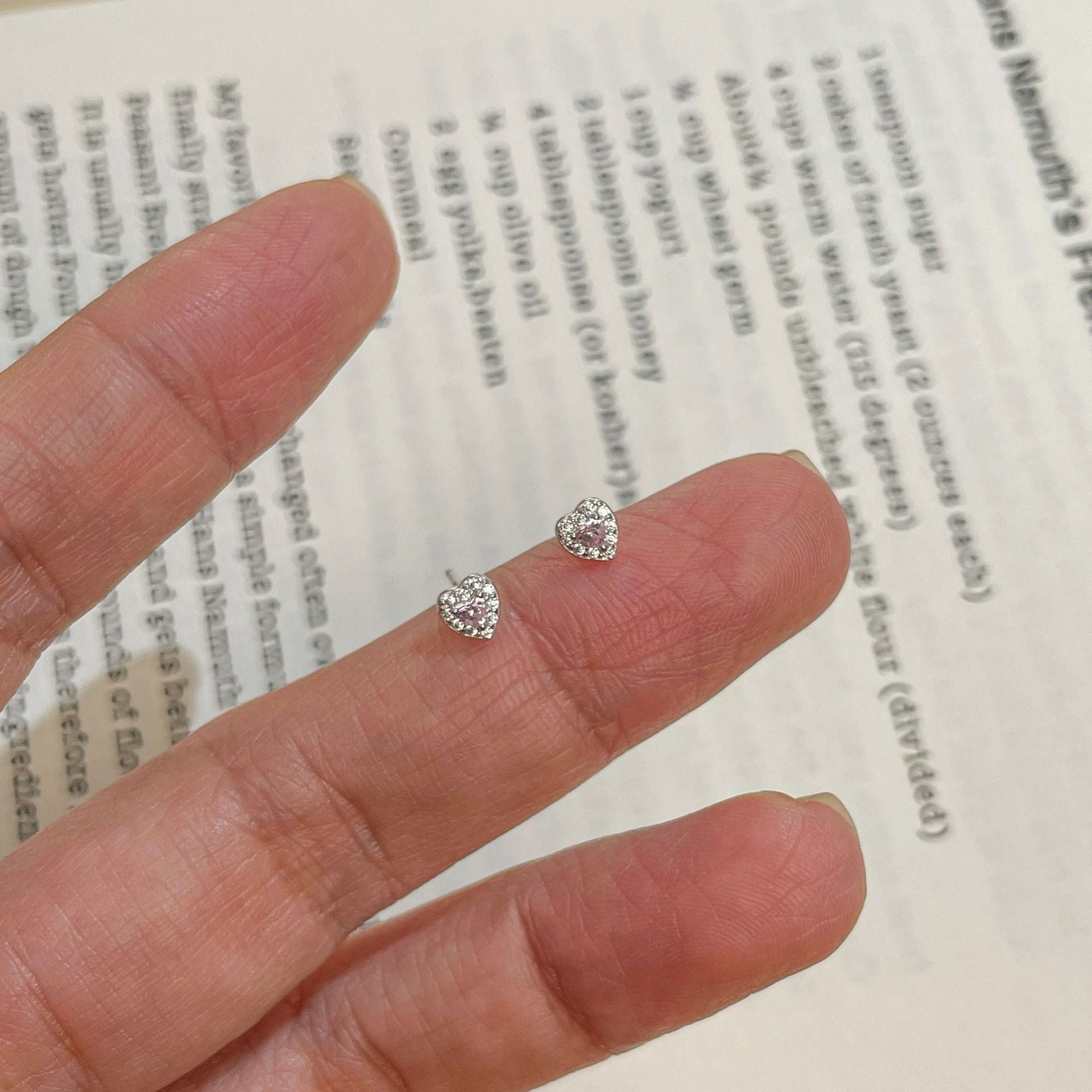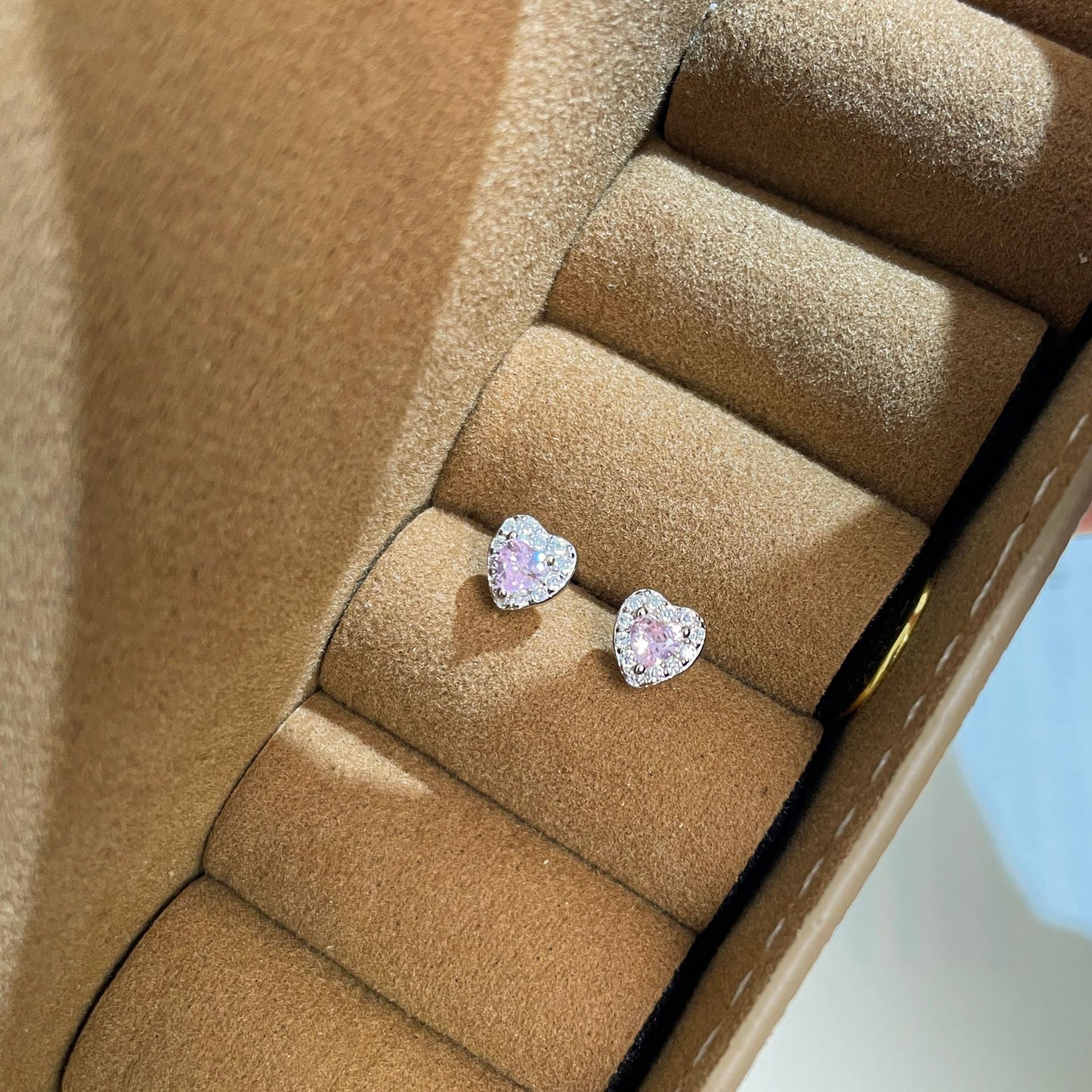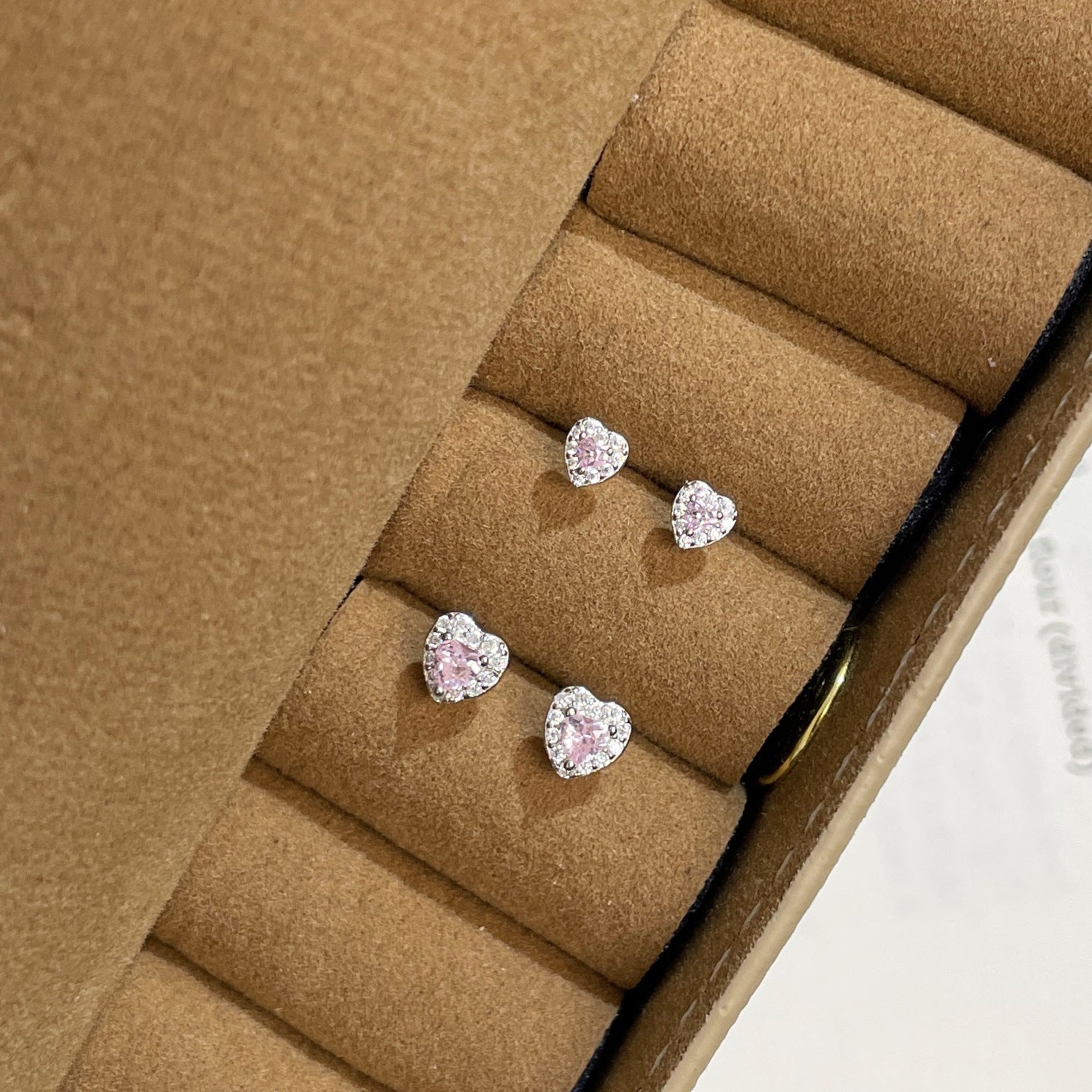 F廠【DQ10022E】S925銀粉紅愛心耳環女小眾設計高級感心形鋯石耳骨釘疊戴耳飾 25.10-1