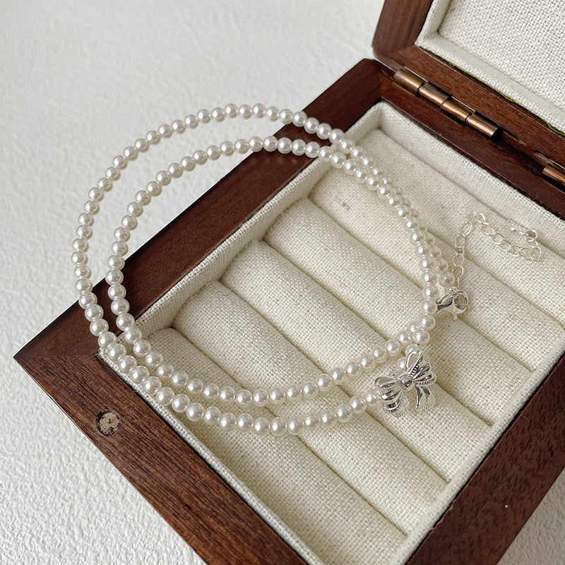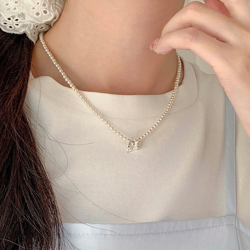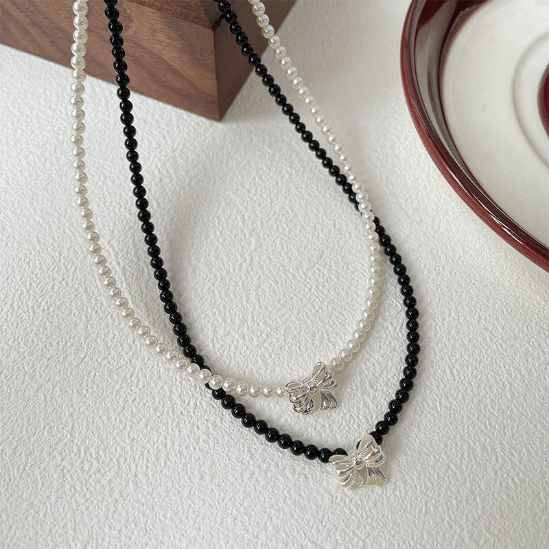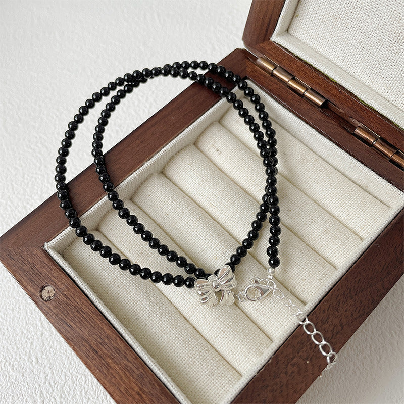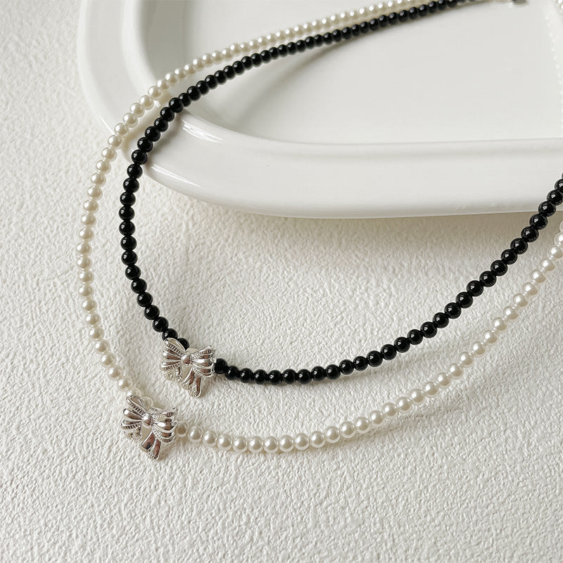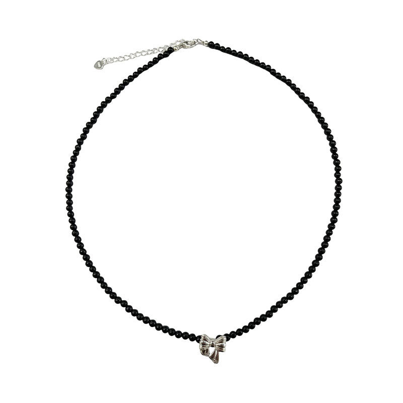 F廠【DQ1035N】韓國ins風甜蝴蝶結仿珍珠鍊項鍊女氛圍感黑瑪瑙鎖骨鏈 25.09-4