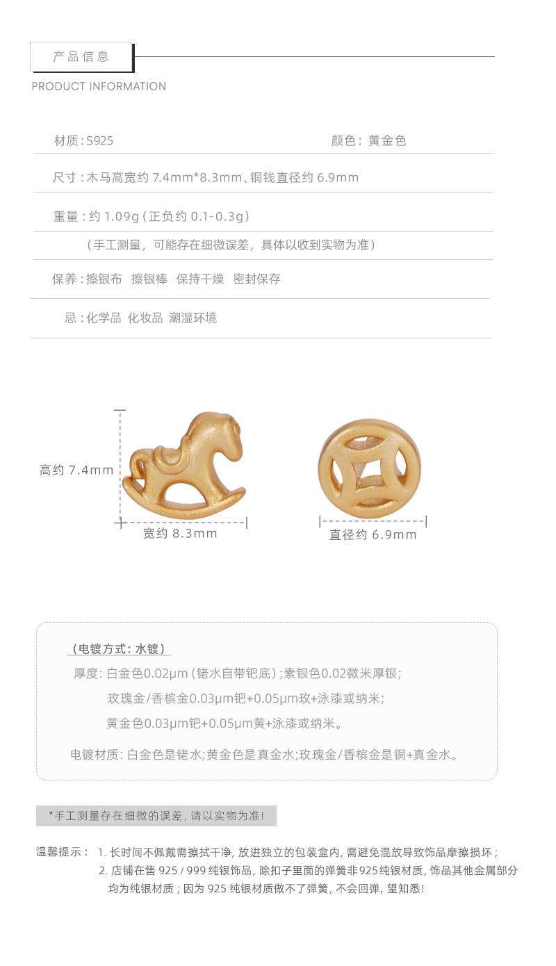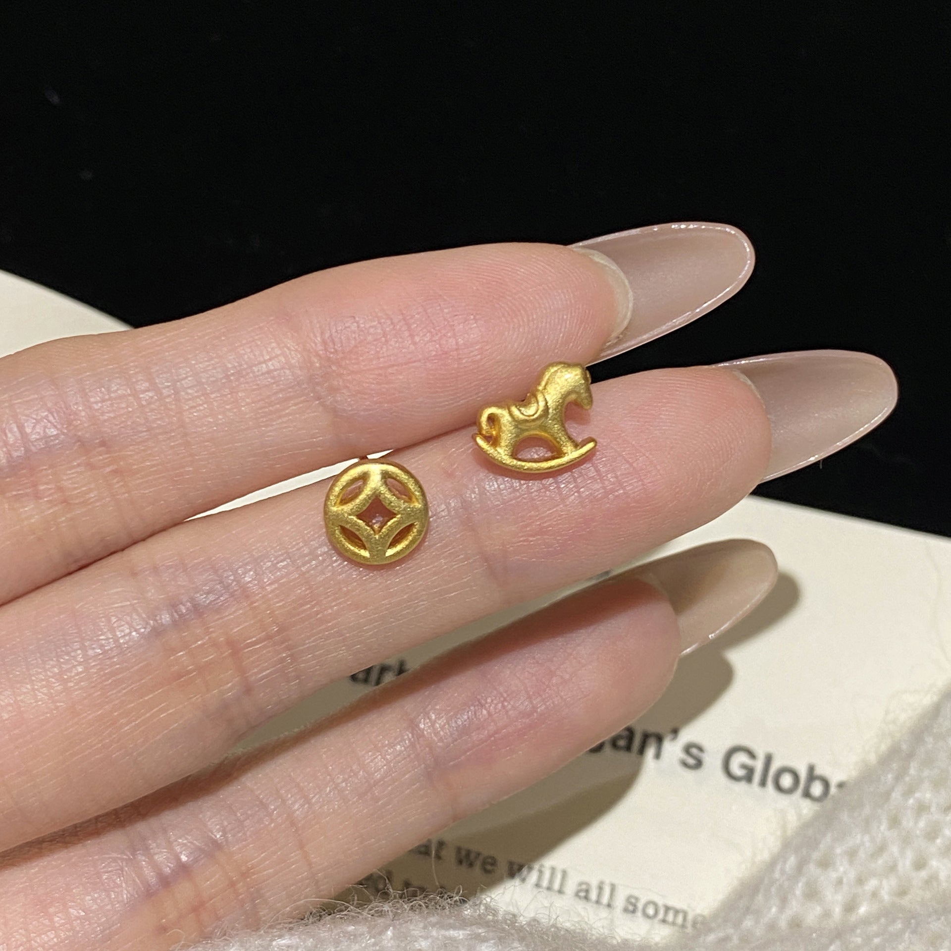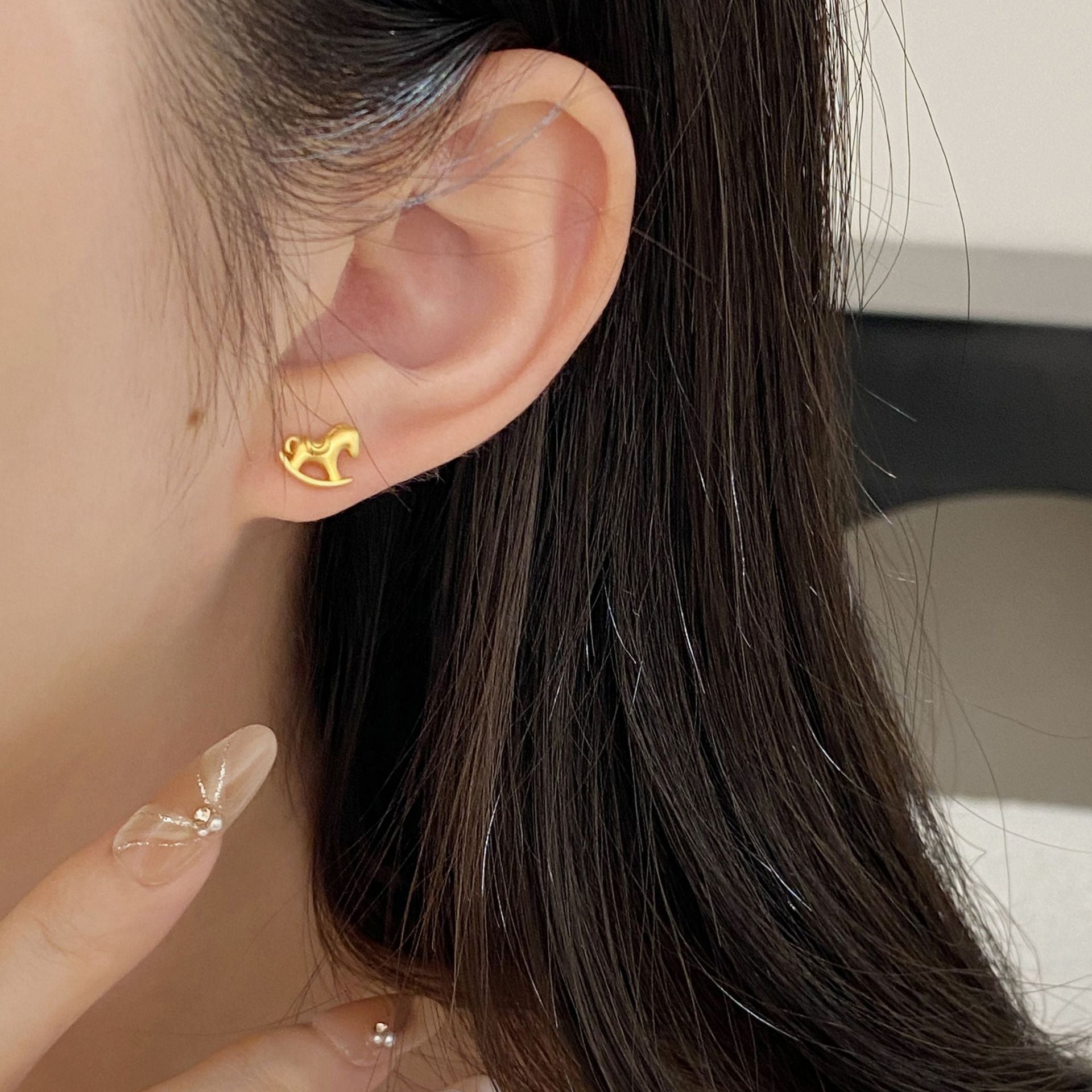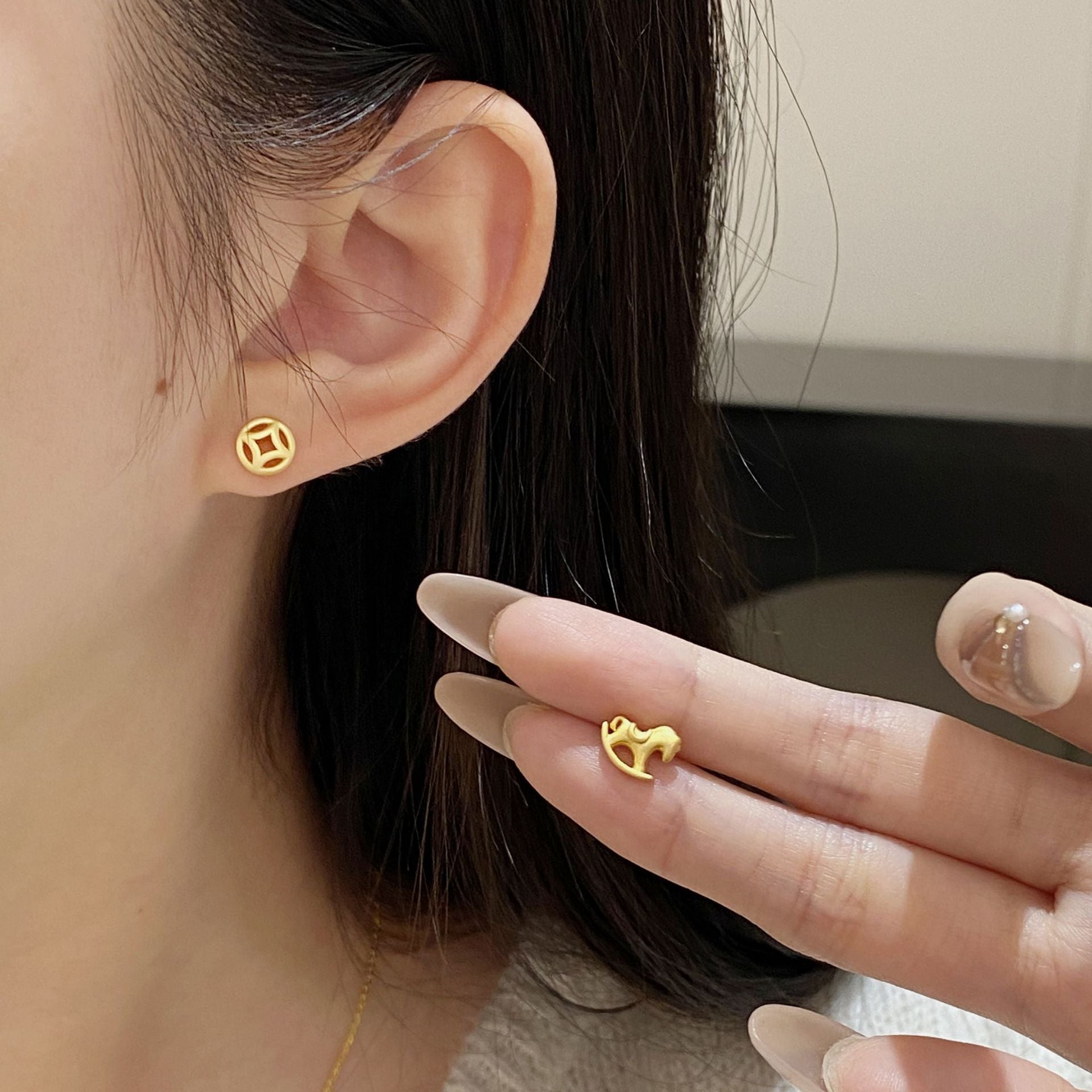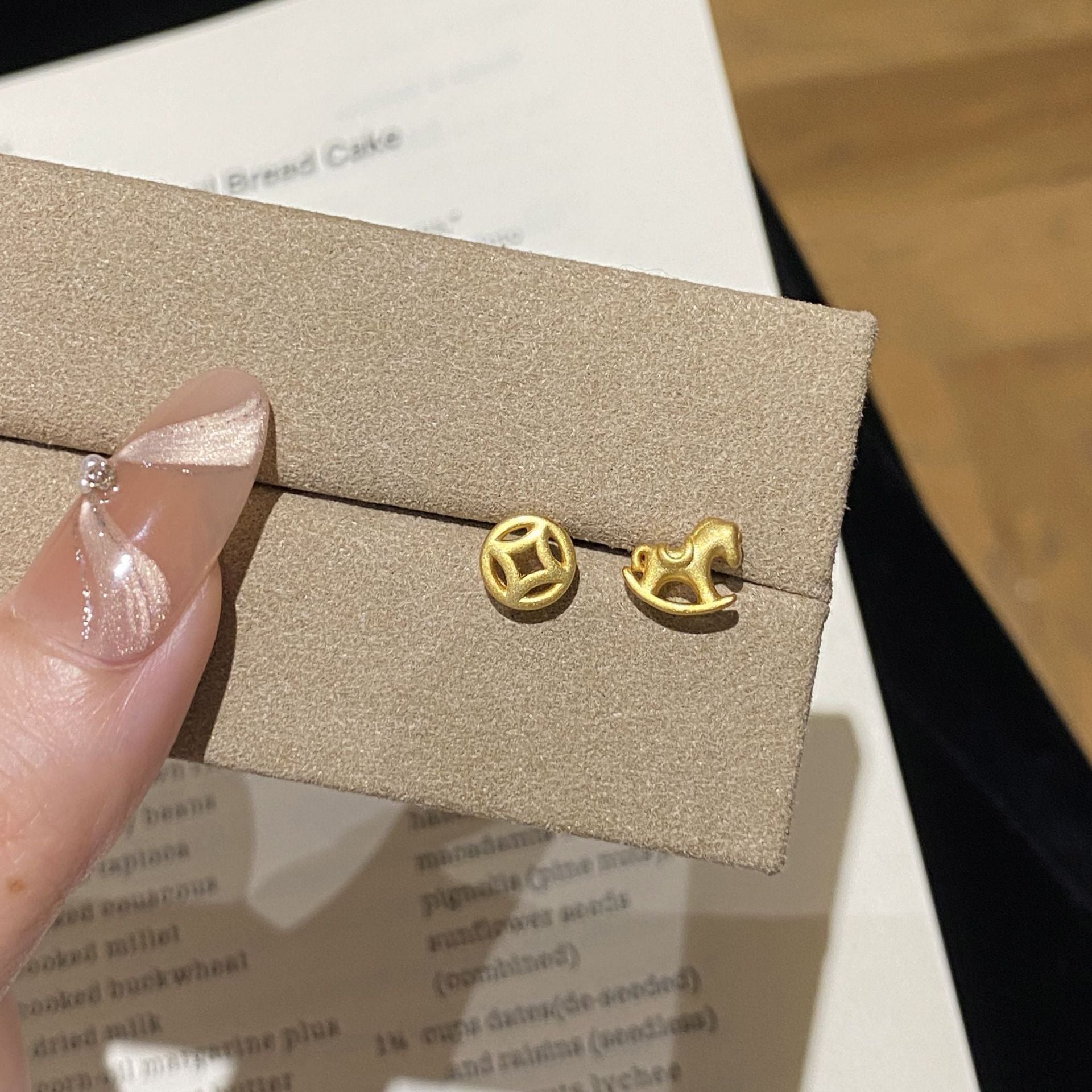 F廠【DQ10403E】S925純銀精緻木馬銅錢不對稱耳環女簡約高級感馬年百搭耳飾潮 25.10-4