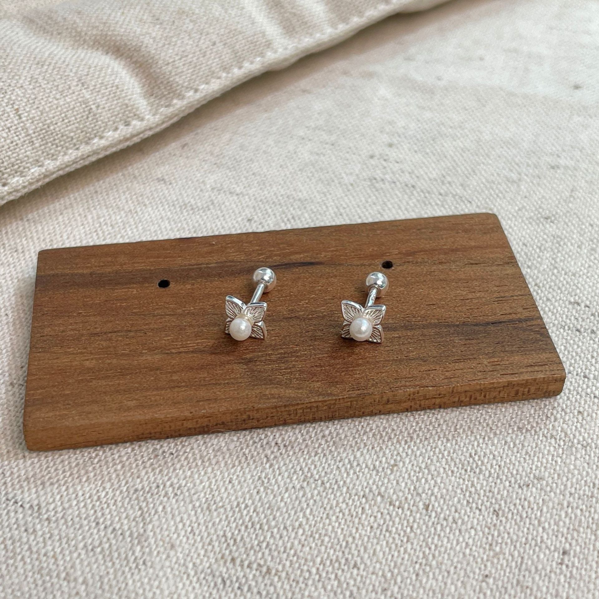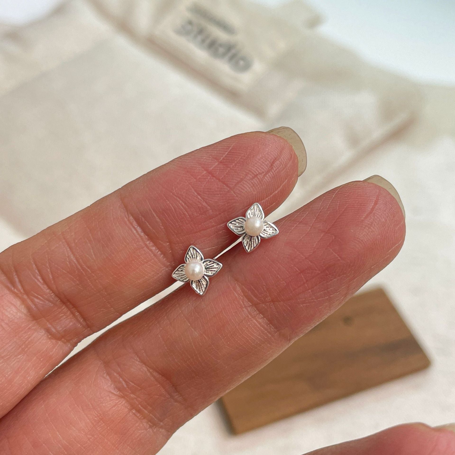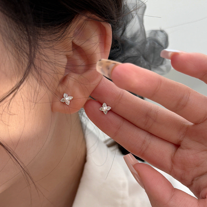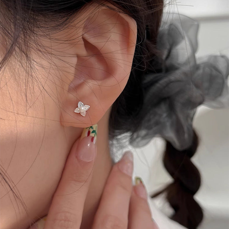 F廠【DQ10928E】S999純銀仿珍珠丁香花耳環女甜美小清新四葉花螺帽百搭耳飾潮 25.10-1