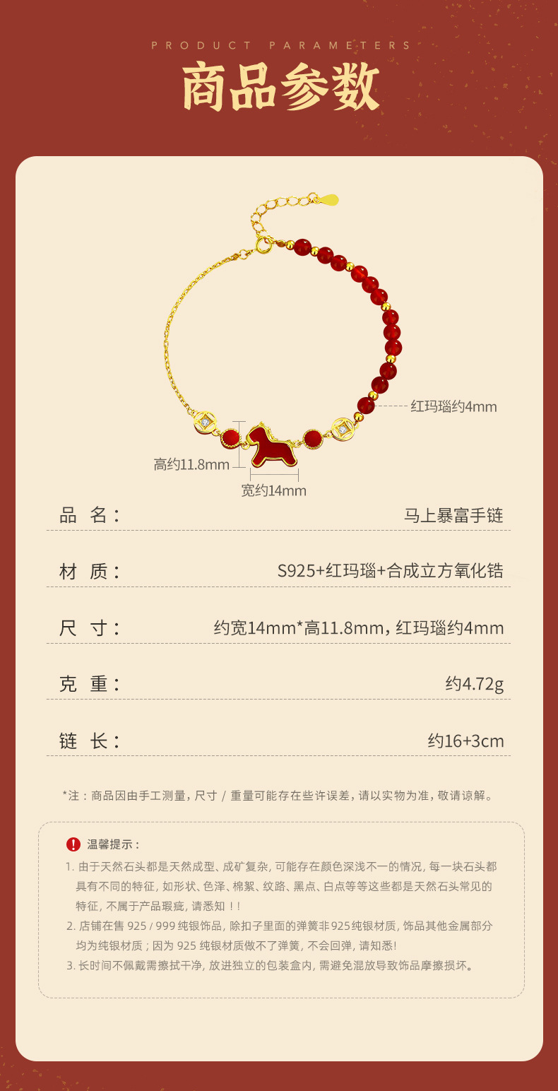 E廠【DQ1227S】蒂原創馬上有錢紅瑪瑙手鍊女S925純銀復古國潮本命年馬年手飾品 25.12-4