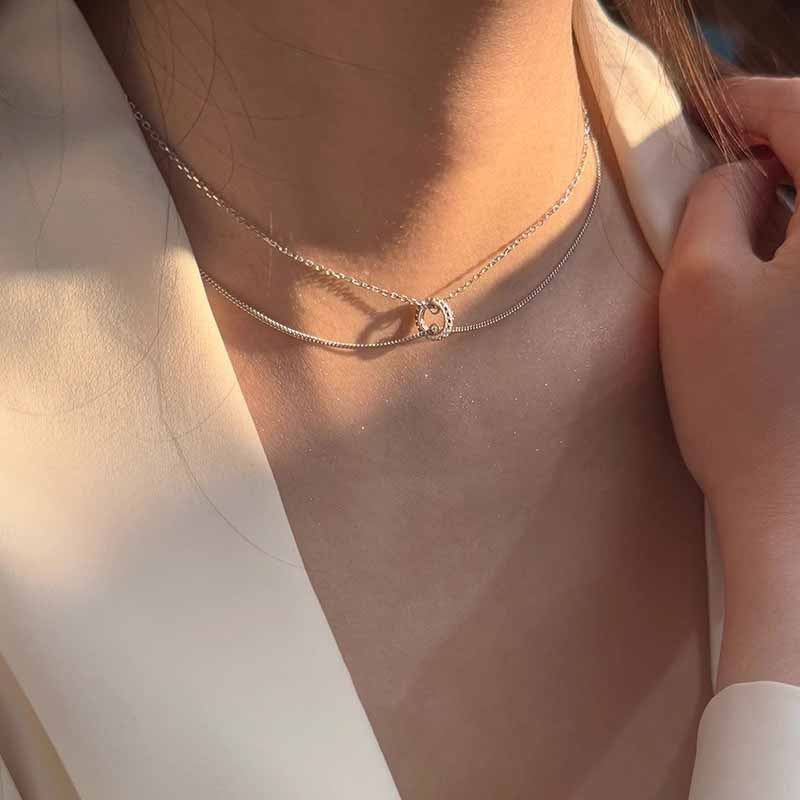 F廠【DQ1313N】S925純銀小眾設計簡約雙層疊戴項鍊女冷淡風鑲鑽圓環鎖骨鏈潮 25.04-3