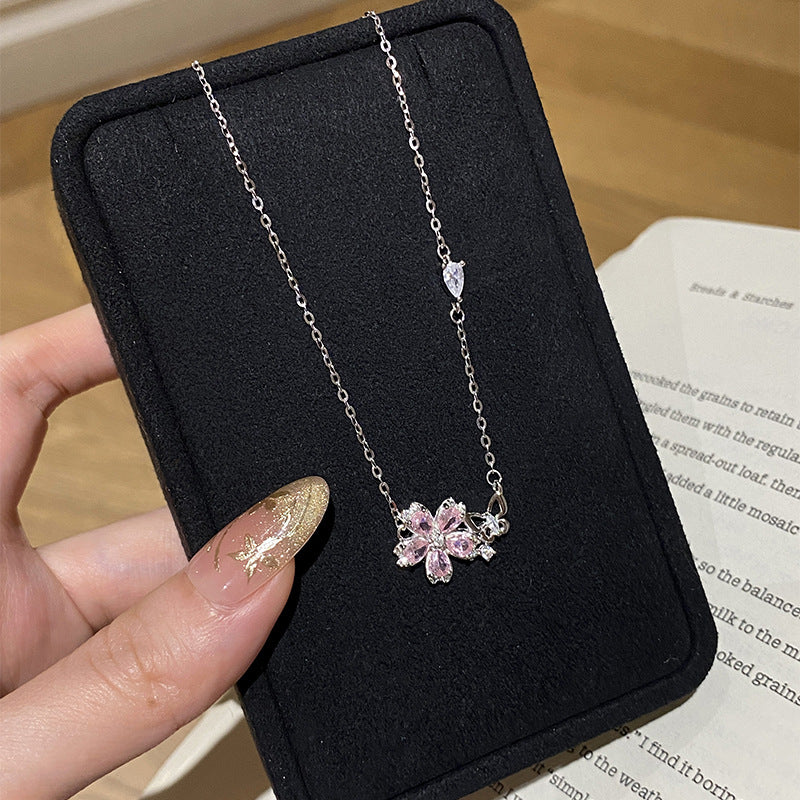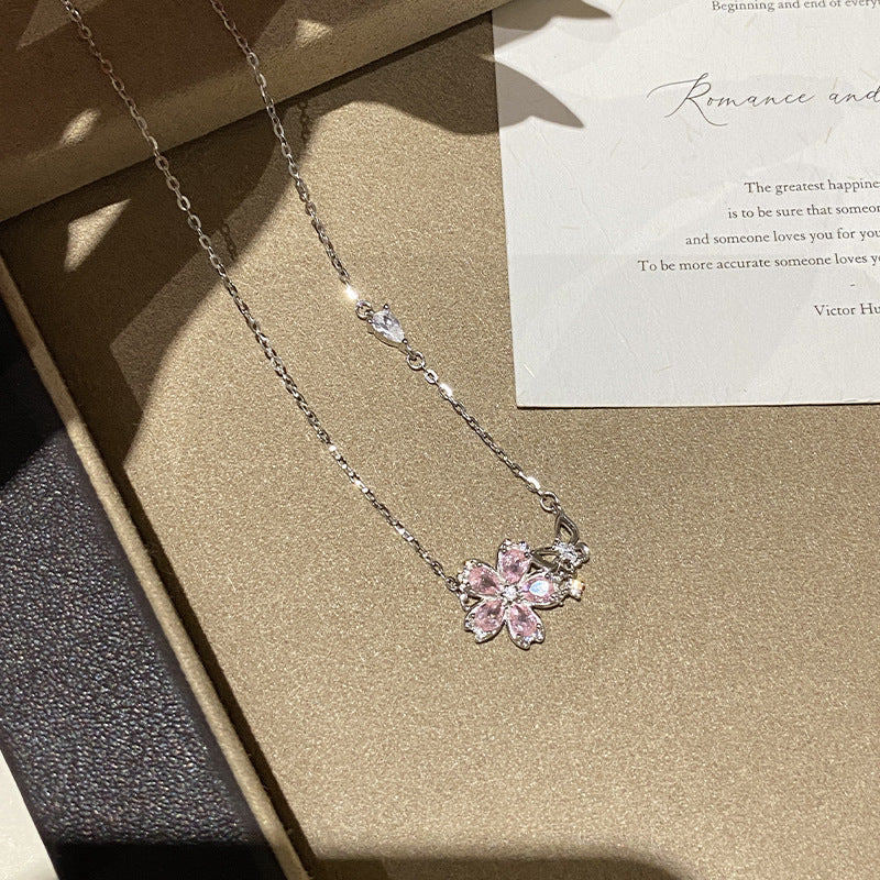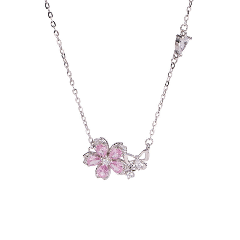 F廠【DQ1843N】甜美小清新桃花粉鋯項鍊女S925純銀高級感蝴蝶花朵鎖骨鏈 25.09-4