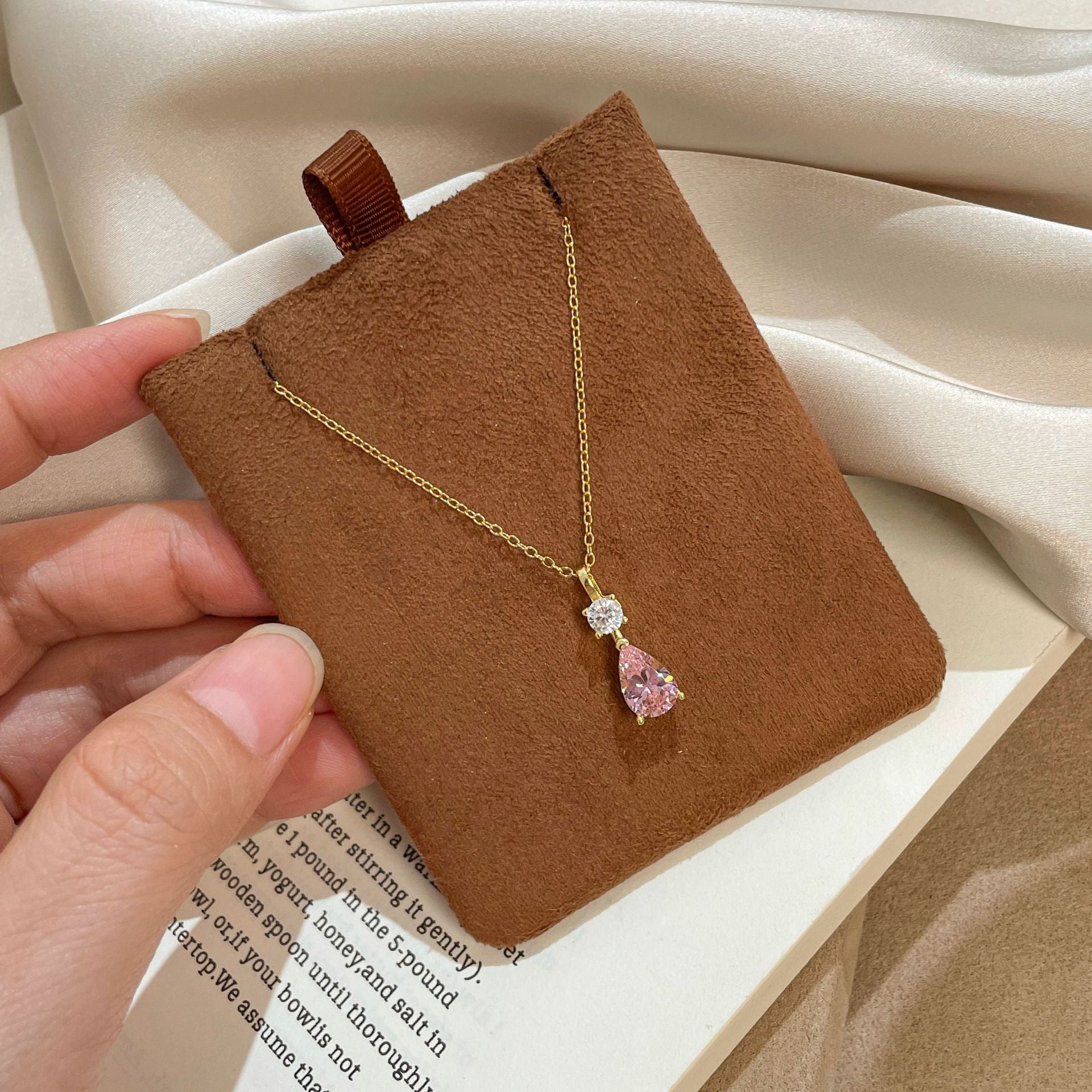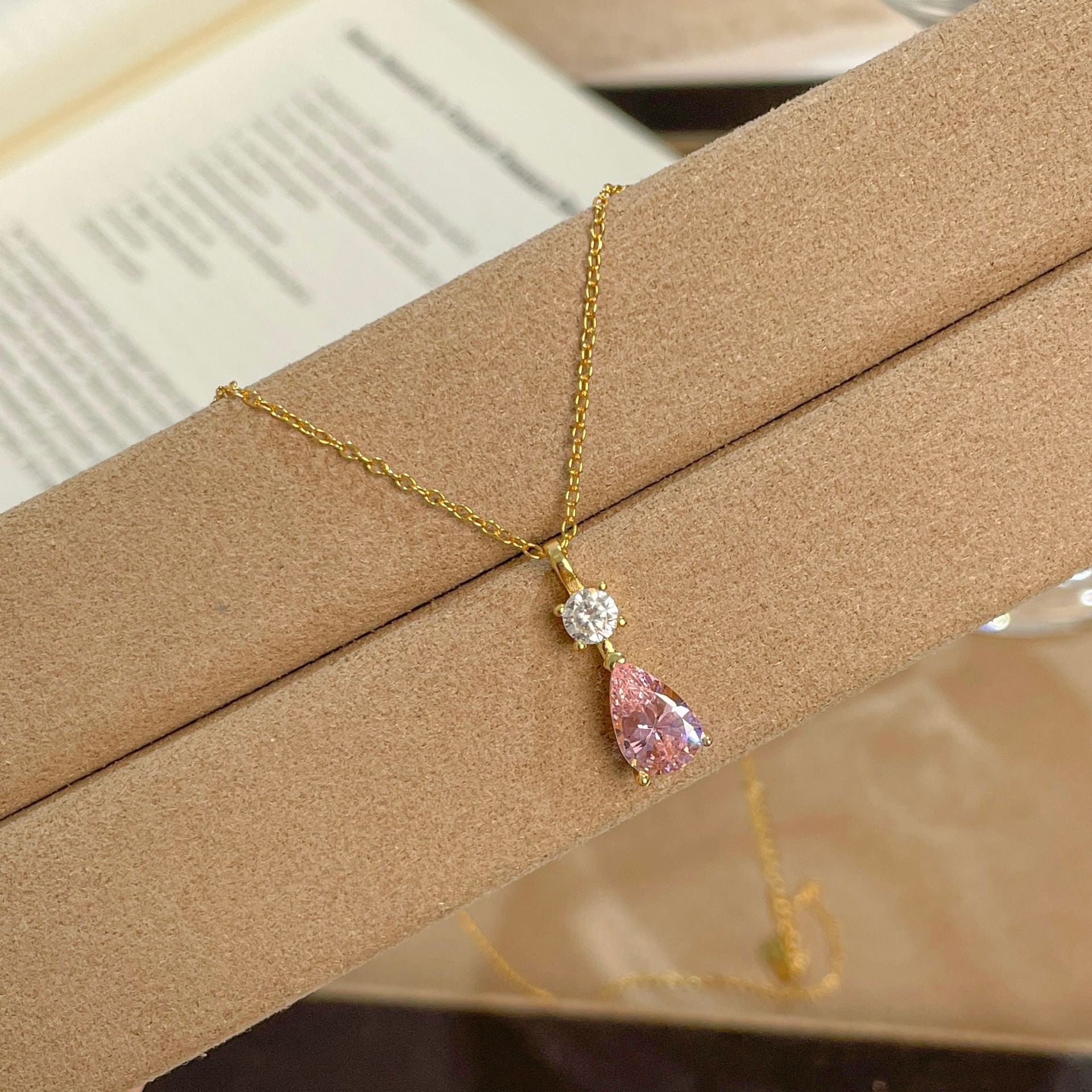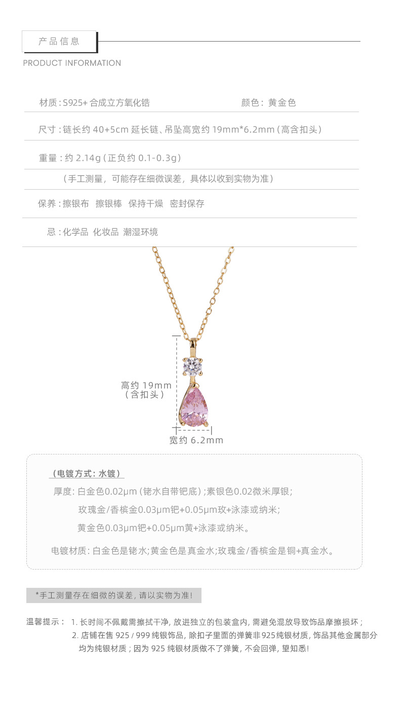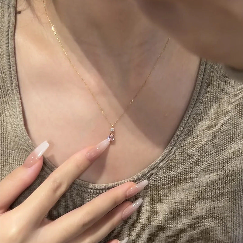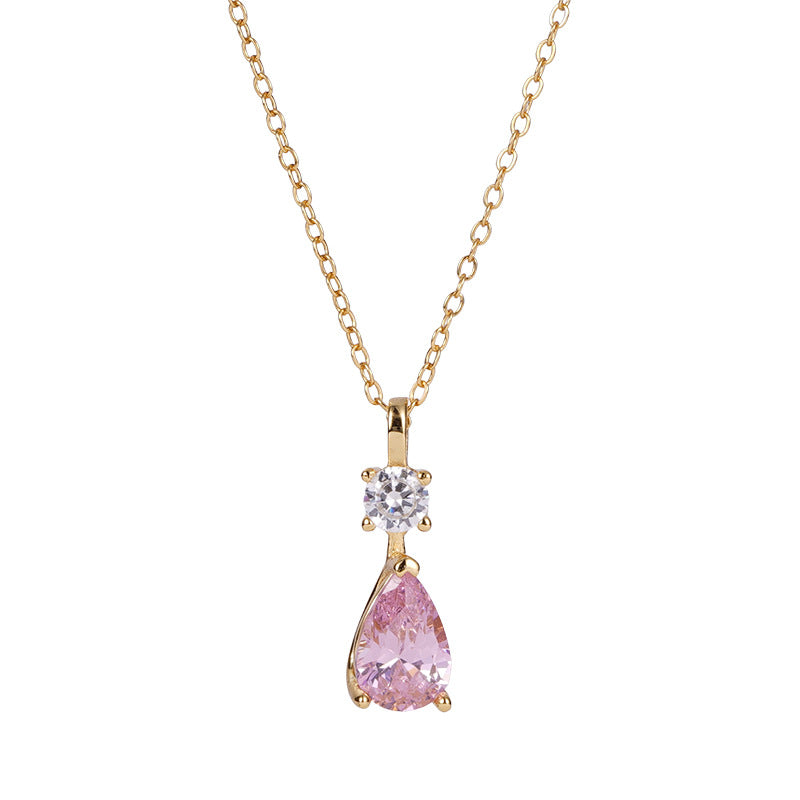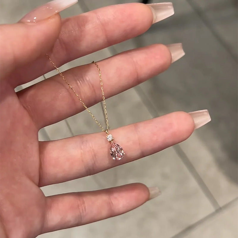 E廠【DQ1992N】S925純銀韓系甜美粉色水滴項鍊簡約精緻爆閃鋯石鎖骨鏈 25.10-3
