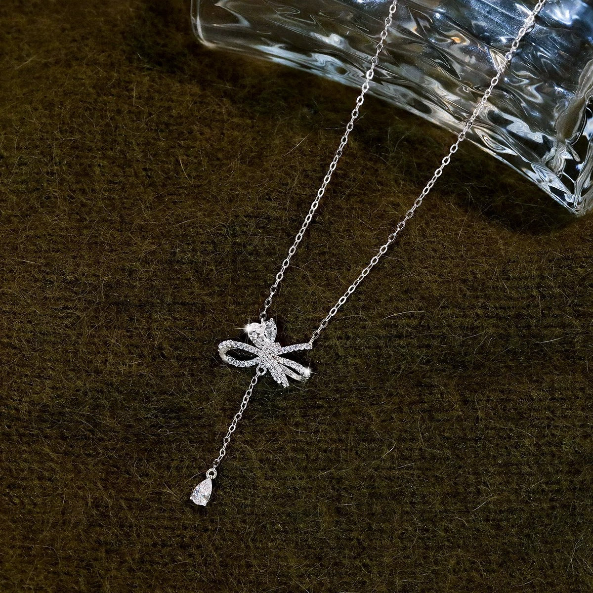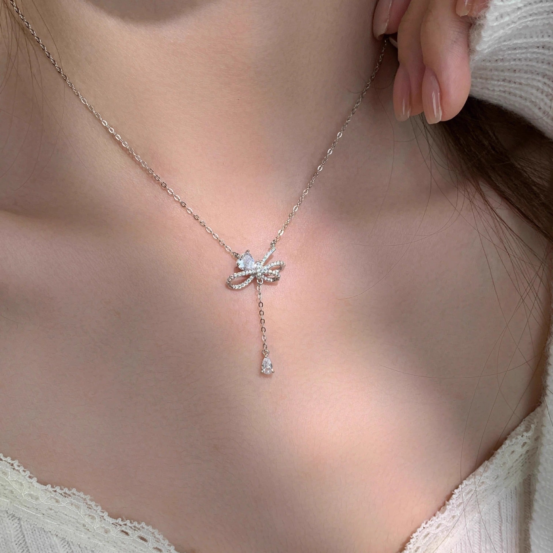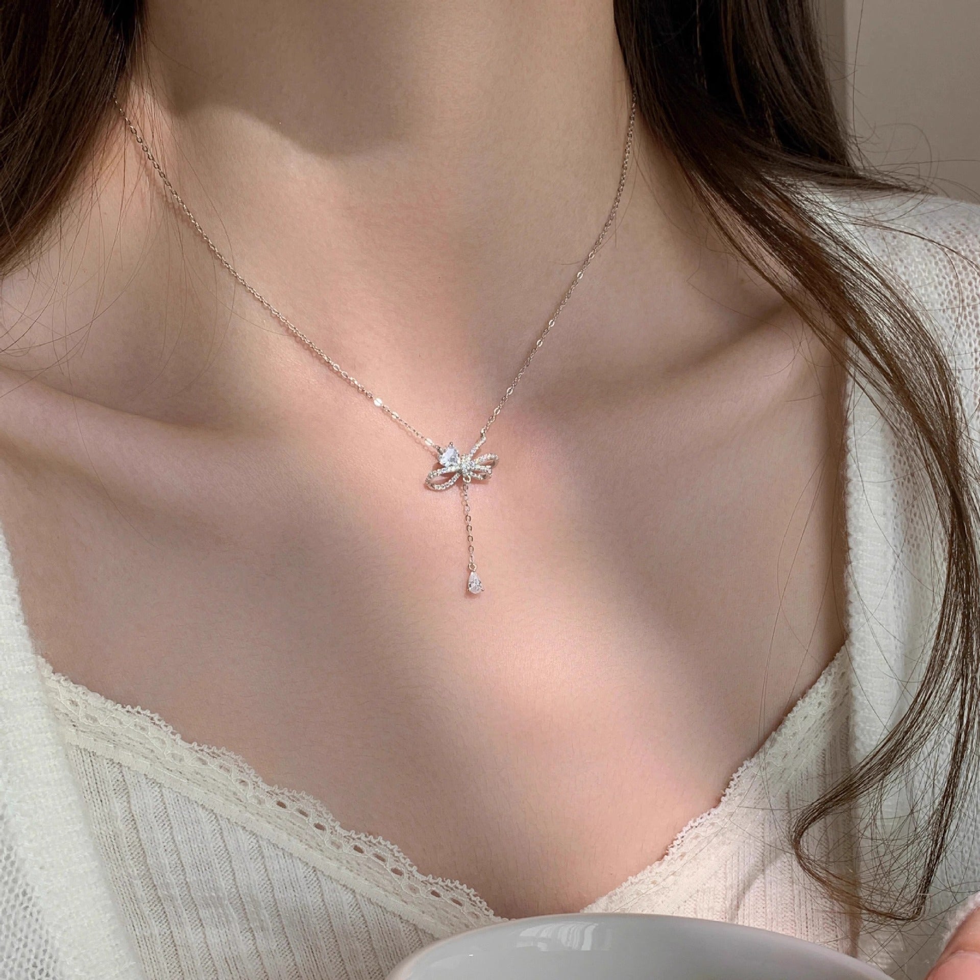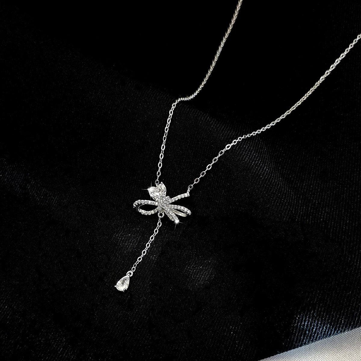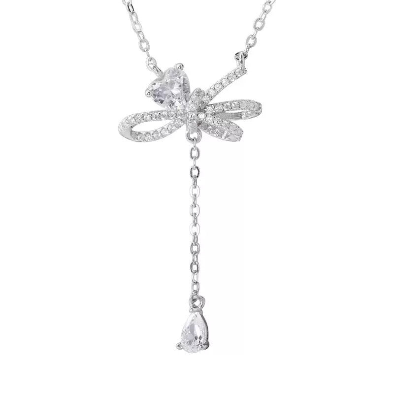F廠【DQ2093N】S925純銀輕奢小眾蝴蝶結項鍊女愛心閃鋯優雅個性流蘇鎖骨鏈 25.03-2