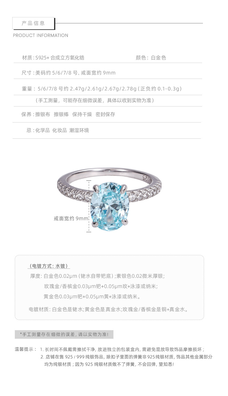 F廠【DQ8974R】S925純銀海藍寶鴿子蛋超閃戒指女精緻氣質橢圓鋯石高級感指環 25.08-2