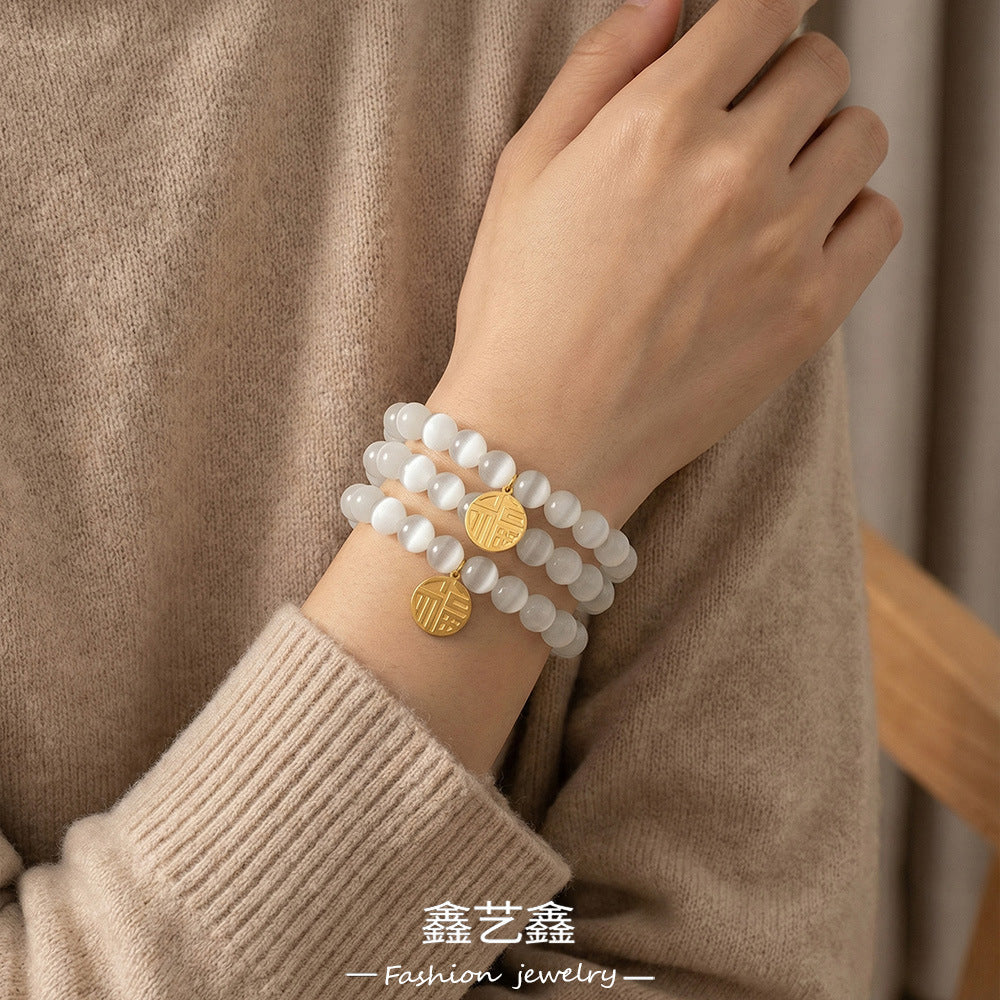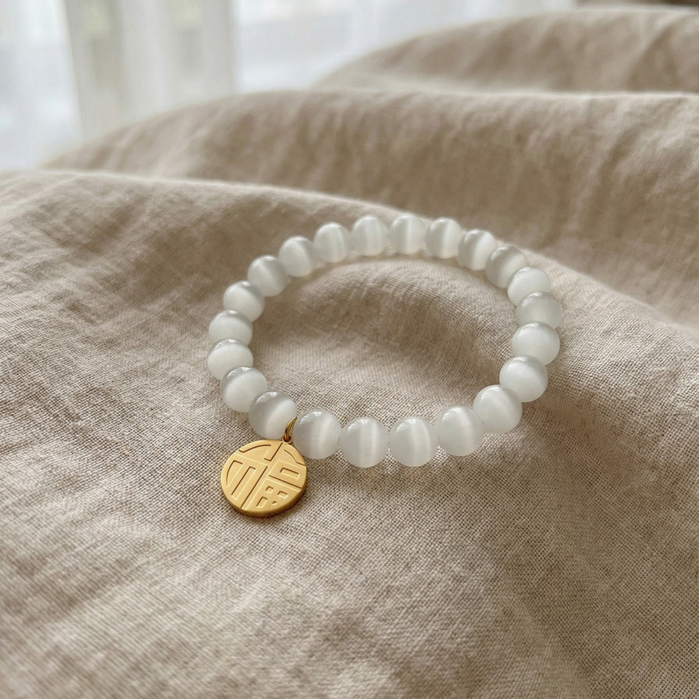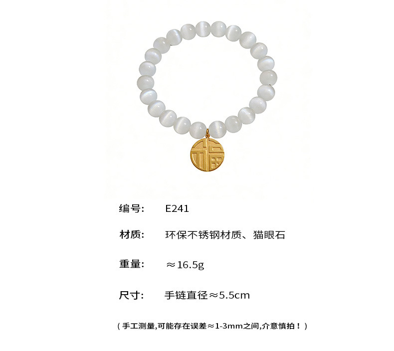 B廠【E241】歐美跨國熱銷款圓牌福字貓眼石手鍊ins風個性時尚百搭彈性繩手飾 26.02-1