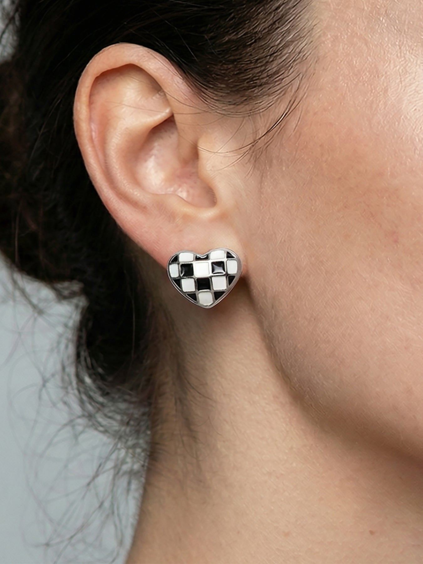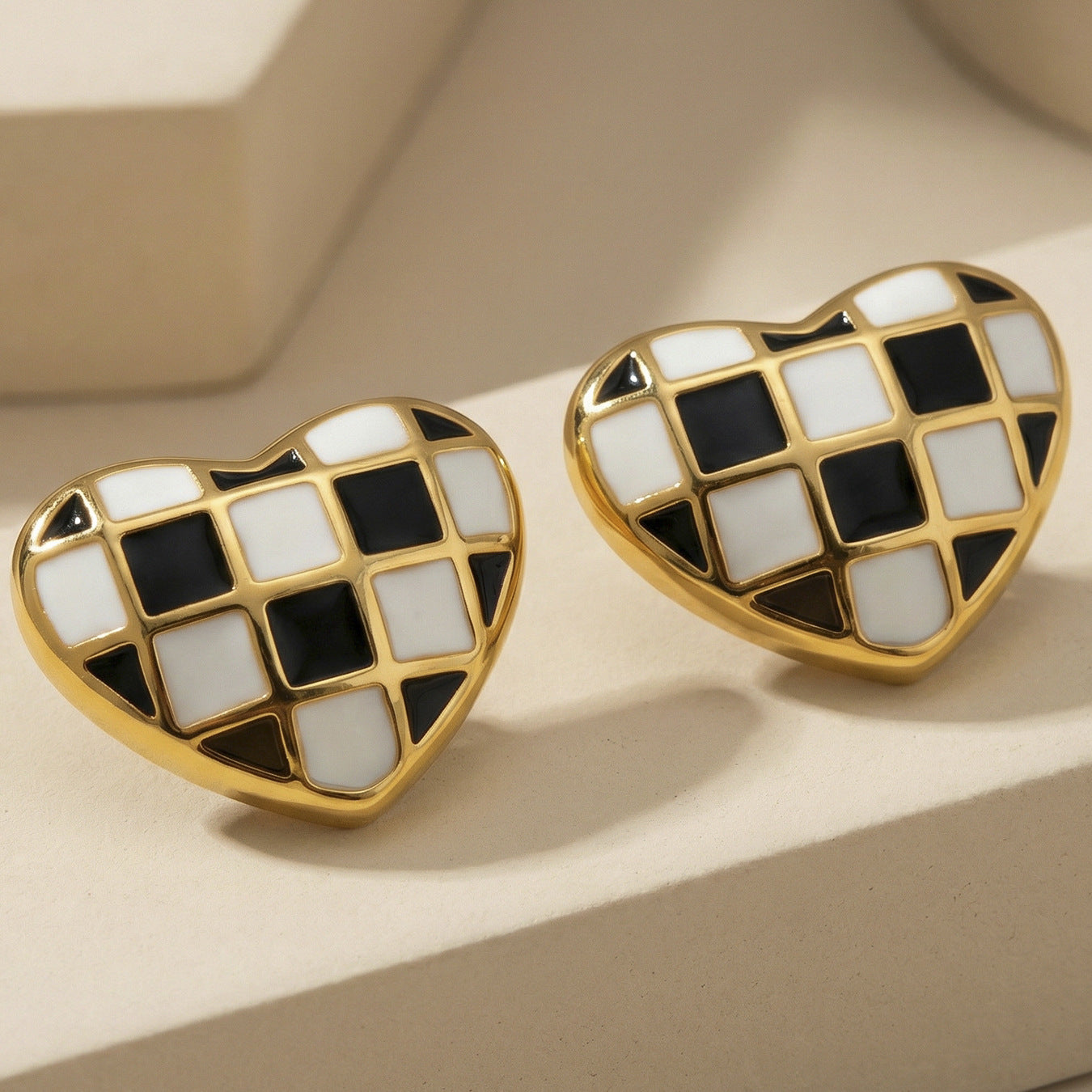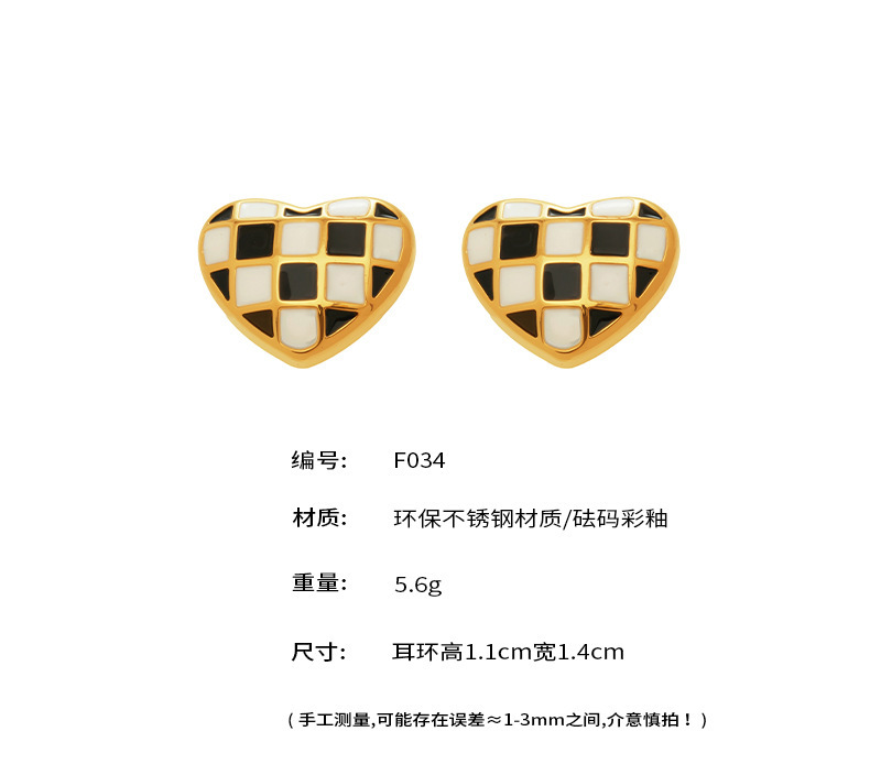 B廠【F034】INS簡約設計琺瑯彩釉棋盤格桃心耳環歐美時尚百搭耳環不銹鋼材質 26.02-1