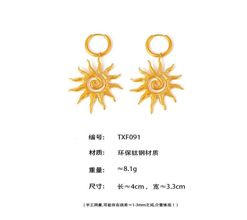 B廠【F091】歐美跨國螺旋太陽吊墜項鍊INS風時尚耳環輕奢感鈦鋼鍍18k真金飾品 24.09-1