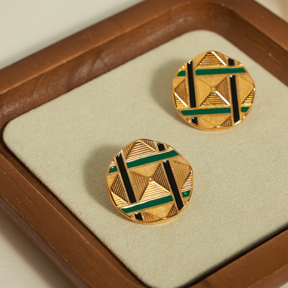 B廠【F1141】歐美風時尚百搭耳環金字塔雕刻花紋圓形耳環砝碼彩釉鈦鋼鍍金耳飾 24.01-3