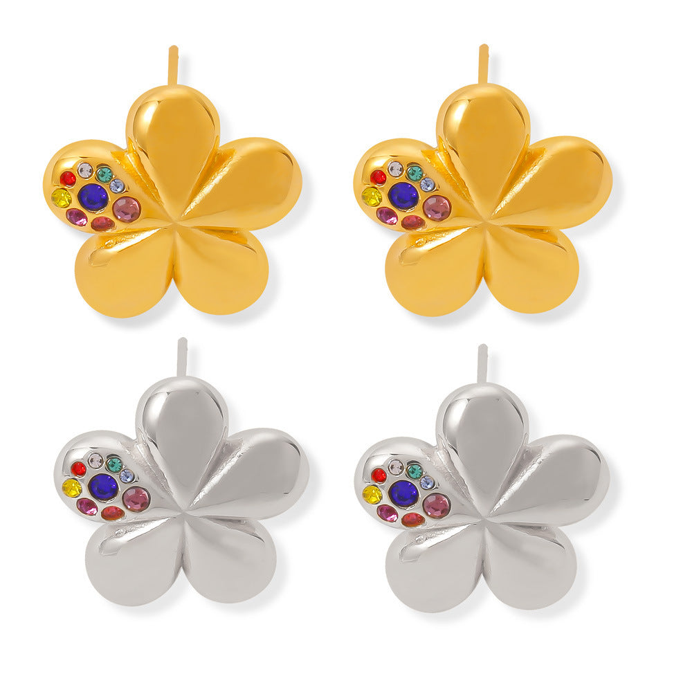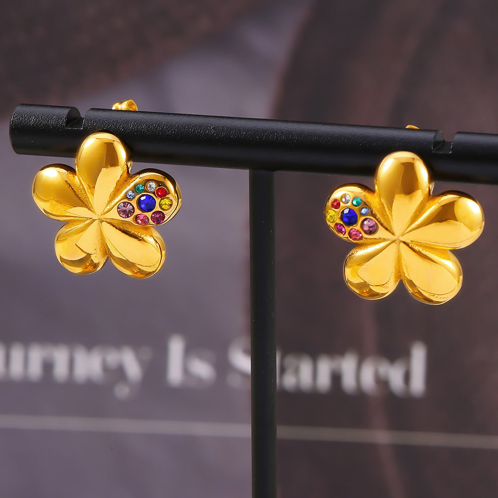 B廠【F133】赫本風時尚簡約個性花朵造型耳飾幾何鑲嵌彩鑽設計感鈦鋼鍍金耳環 24.07-2
